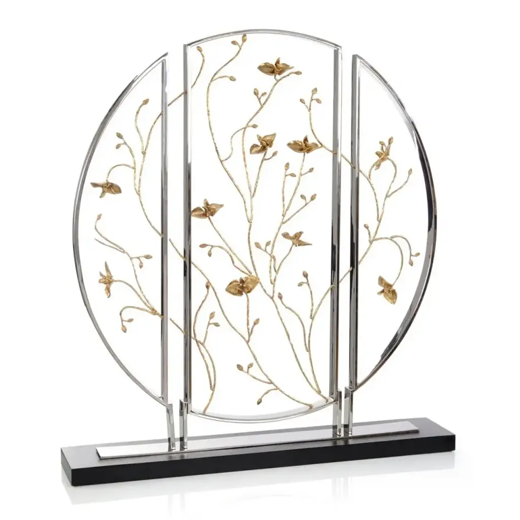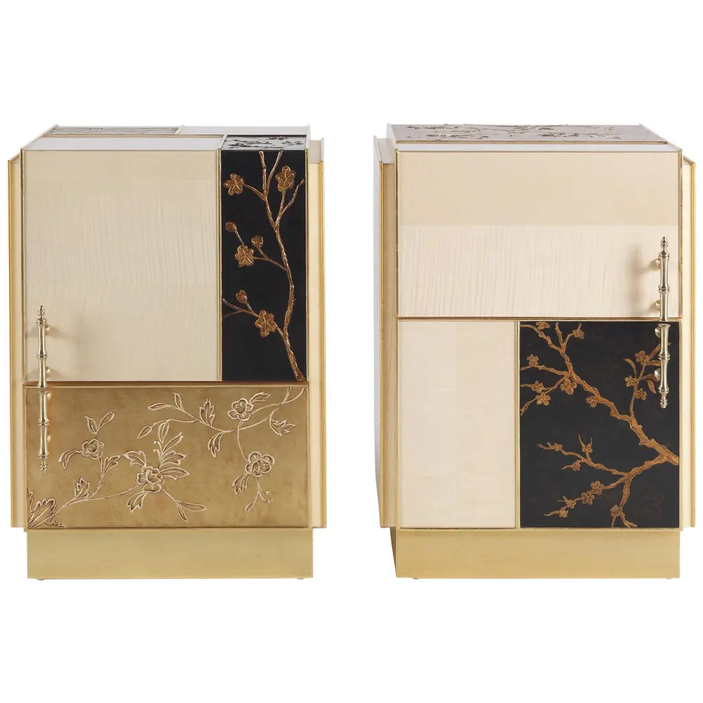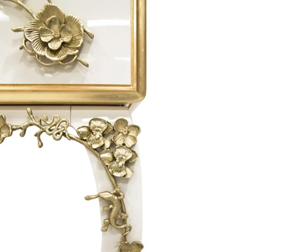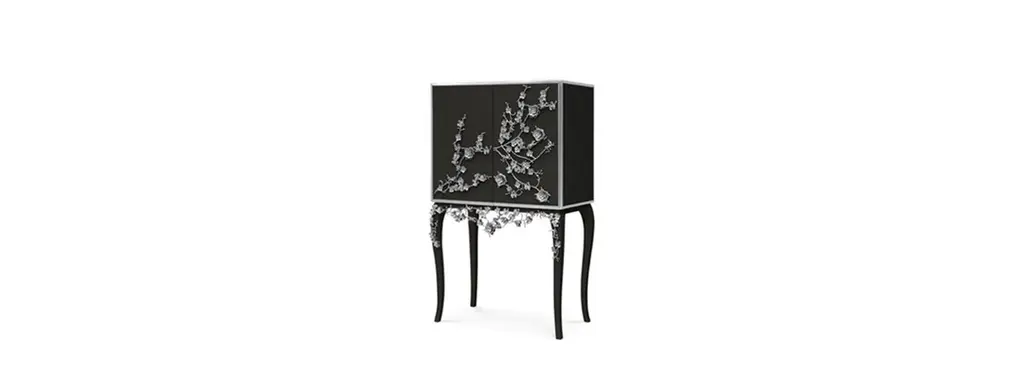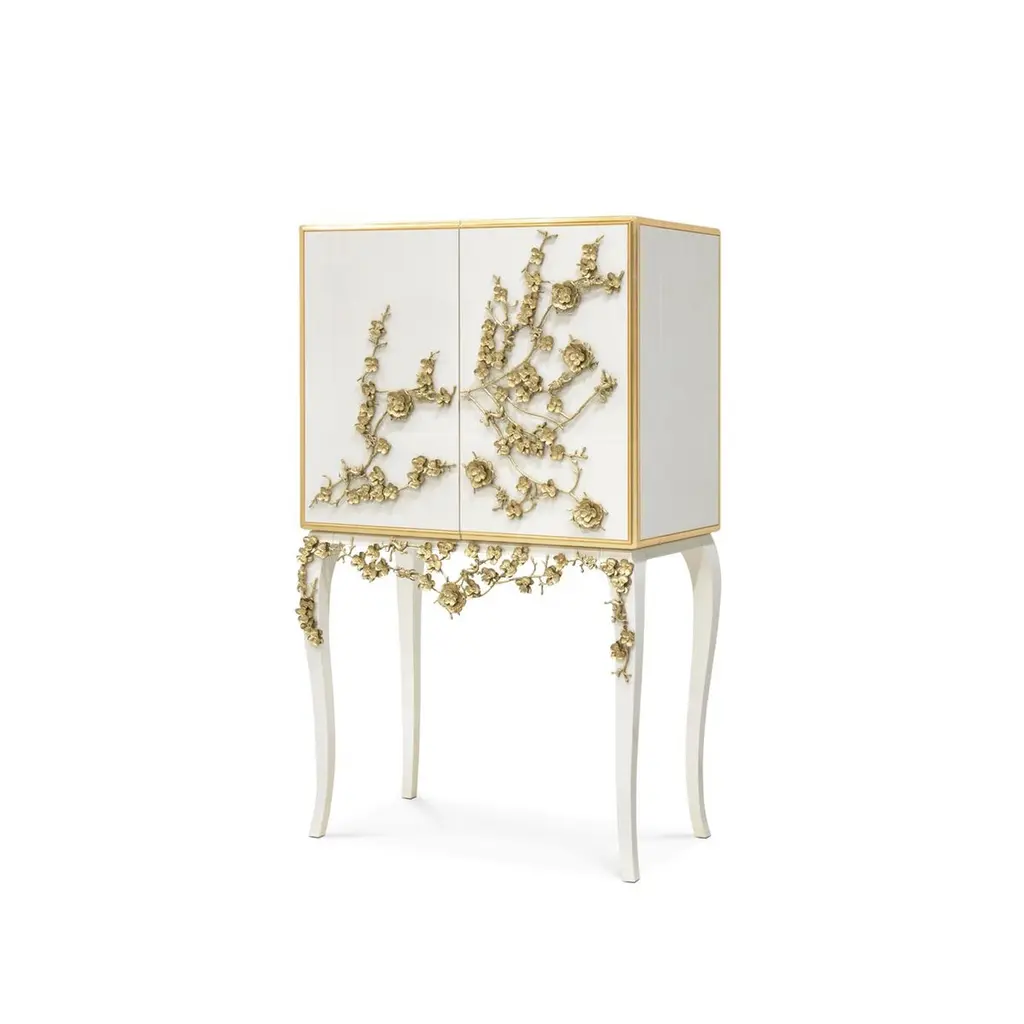 Cabinet-bar with flowersBronze, brass, lacqueMeasures: Height 65 in. (165.1 cm)Width 39.4 in. (100.08 cm)Depth 23.2 in. (58.93 cm)Estimated production time: 13-14 weeks.There is a sense of reveal and conceal takes a beautiful bar cabinet in high gloss lacquer and adorns it in metal organic lace, revealing a mesmerizing hint of what lies beneath. The chic interior is perfectly designed to store your wine and cocktail accoutrements. The piece also features a long lockable drawer with a secret drawer for your most precious items hidden inside and an inset small drawer with a cedar wood interior for cigars. Open or closed with, this bar cabinet is ready for a glamourous soiree. Cheers!As ShownStructure: Cream.Structure Sides: Cream.Doors: Cream.Base: Cream.Handle: Cast Brass (High Gloss Finish).Frame: Gold Leaf (High Gloss Finish).Interior: Cream.Interior Back And Sides: Bronze Mirror.Shelves: Bronze Glass.Big Drawer: Cream.Base Detail: Cast Brass (High Gloss Finish).