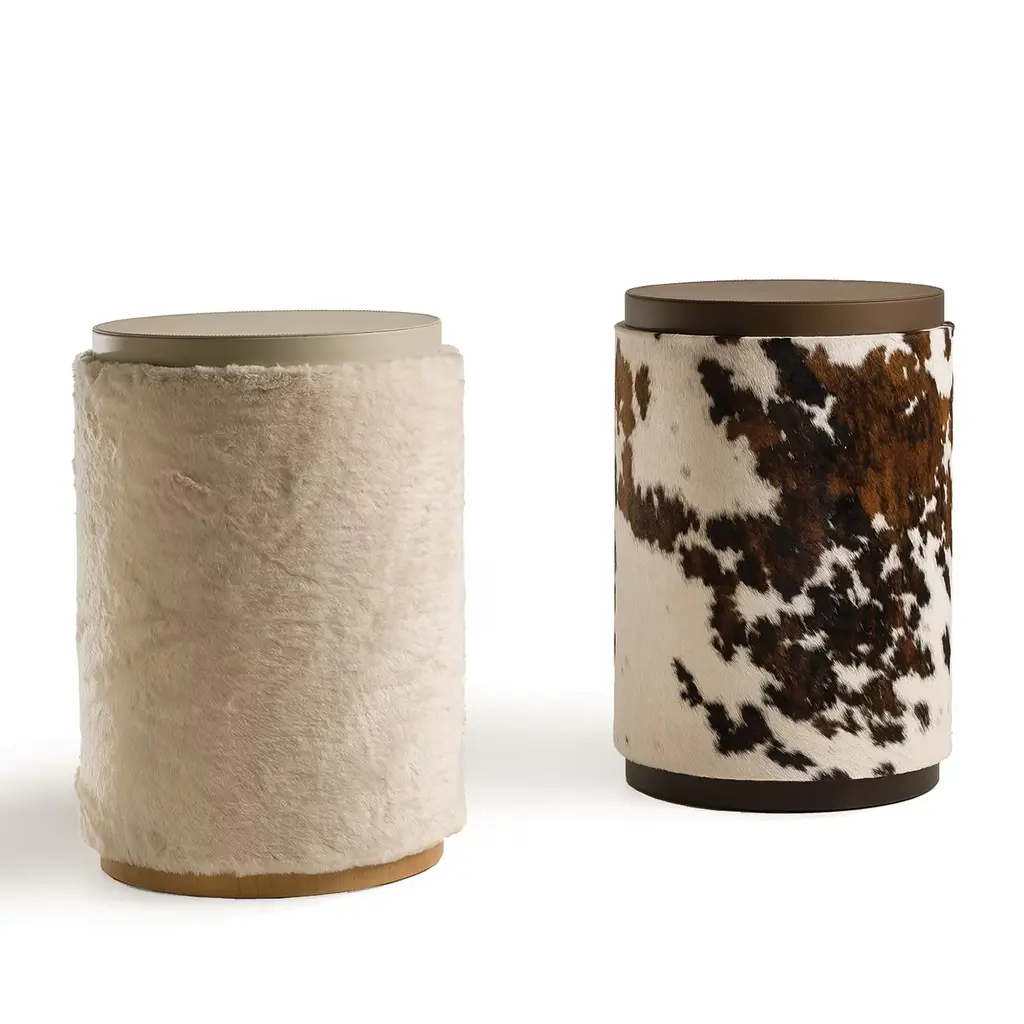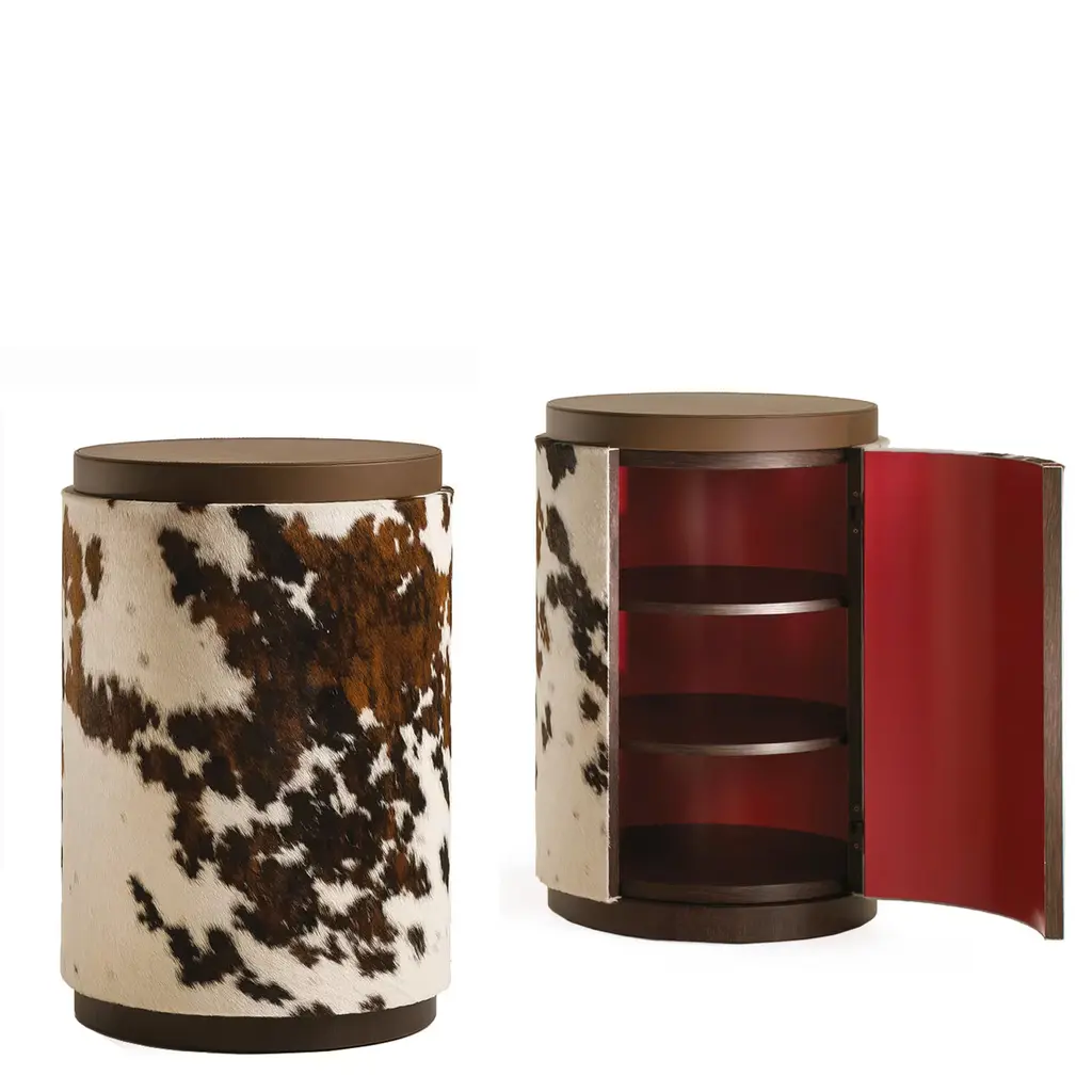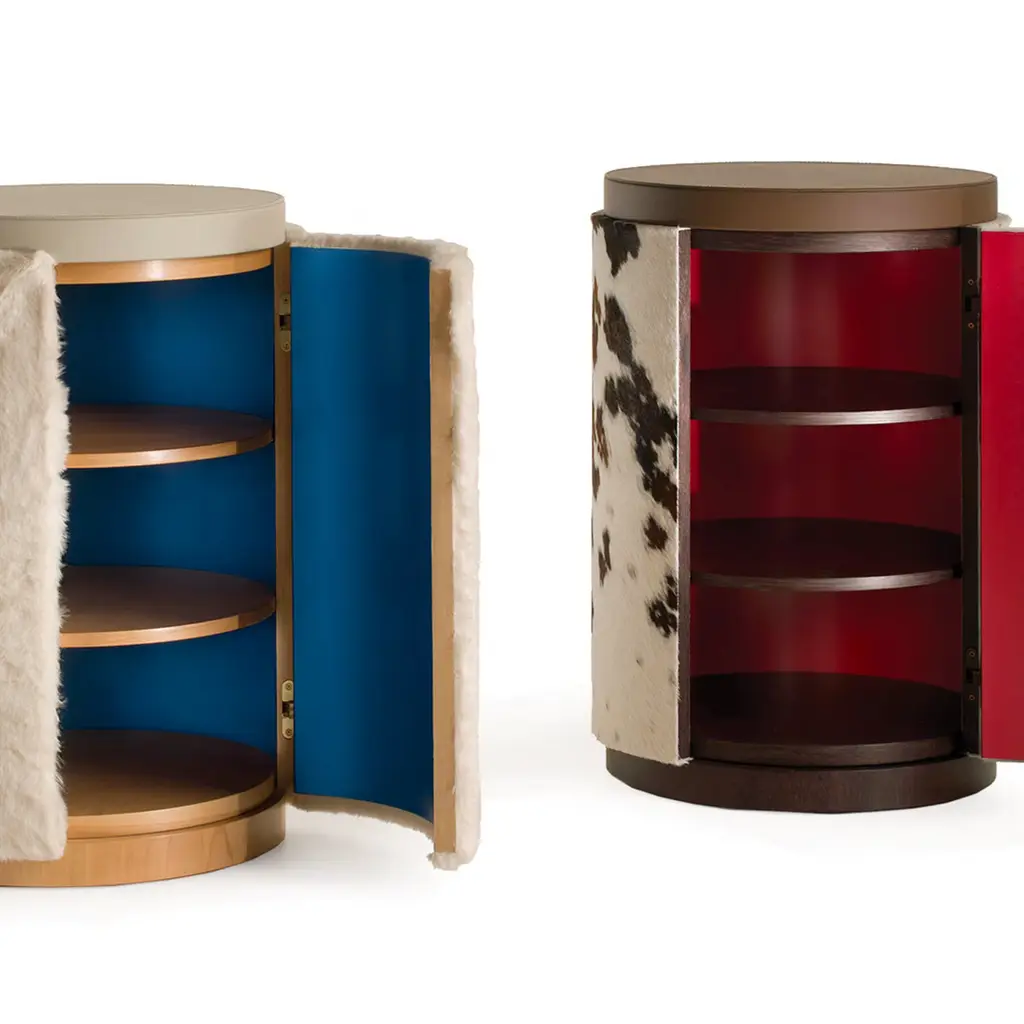 Indulge in opulence with the Cabinet In Furs—an epitome of luxury and artistry. Its dark oak base forms a regal cylinder, complemented by a sumptuous leather top and sides adorned with haired Pony leather. Reminiscent of a modern Venus in Furs, the unit is cocooned in soft upholstery, concealing a lateral opening that unveils a lavish Pantone 1807 C lacquering interior. Within, discover the treasure trove of precious wooden oak shelves, meticulously crafted to showcase your most prized possessions.