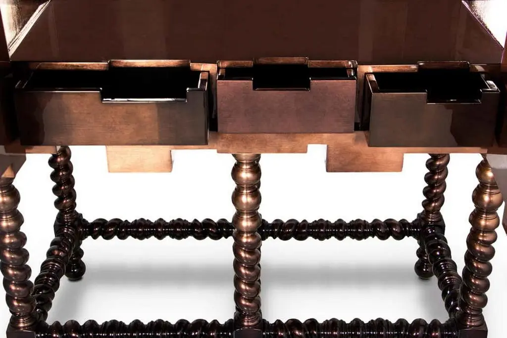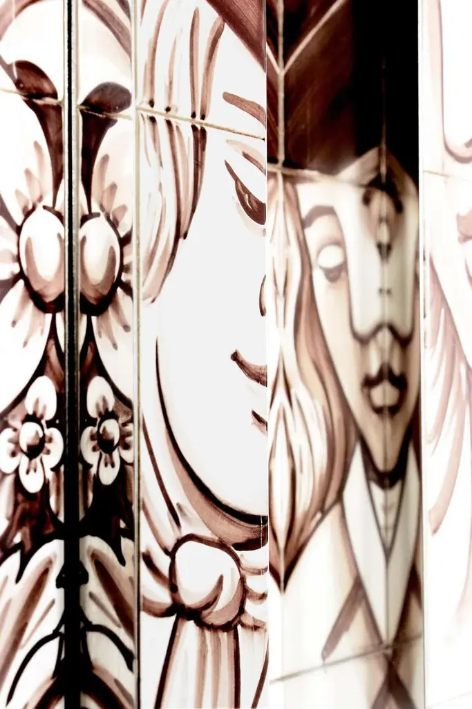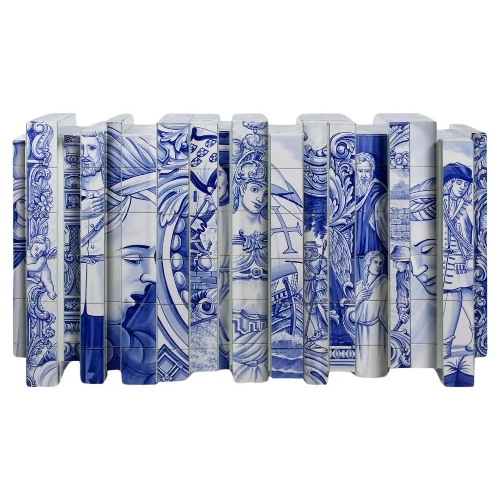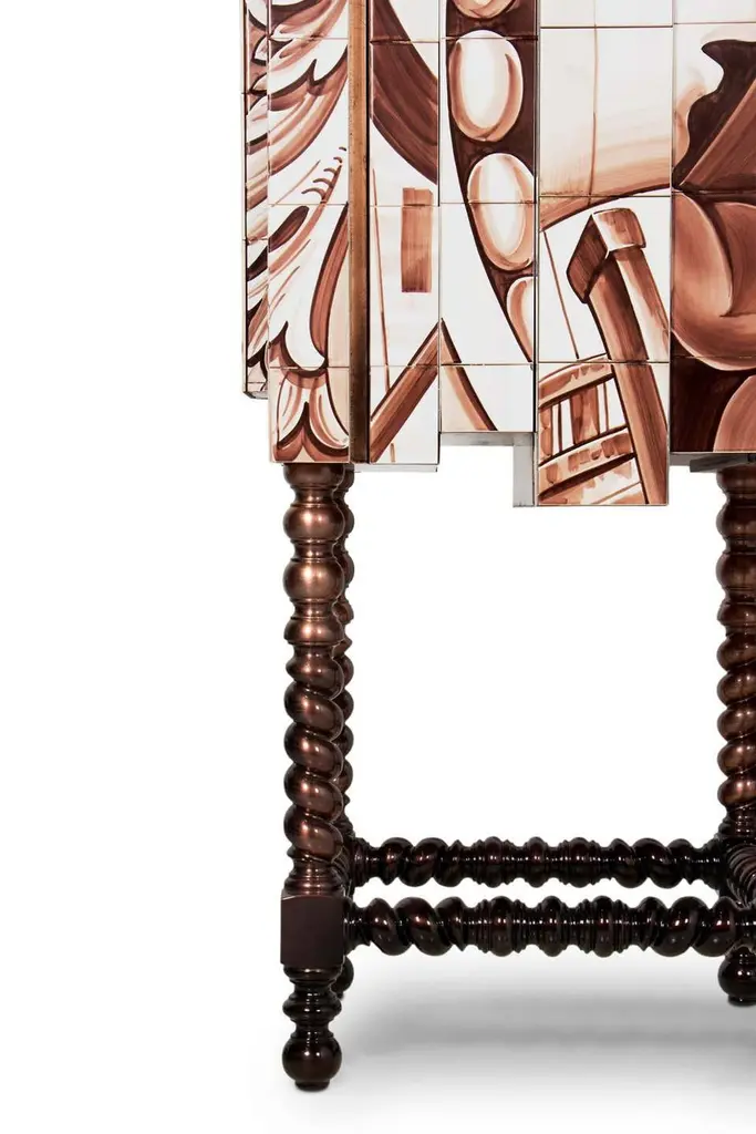 Cabinet with hand painted tilesEstimated production time: 15-16 weeksCopper leaf with translucentand chocolate finish, hand painted tiles,Bronze glass, polished stainless steel, bronzemirrorMeasures: Height 64.97 in. (165 cm)Width 43.31 in. (110 cm)Depth 23.63 in. (60 cm).Heavily inspired in Portuguese history and culture. Used to tell tales and stories, azulejo tiles became increasingly popular during King Manuel’s reign, representing a landmark in Portuguese architecture. The Dom Heritage is a tribute to the country’s grand epoch, as well as to it’s traditional artisan crafts.PRODUCT FEATURESThis unique cabinet features a unique finishes and remarkable design elements, inspired in the classic Manueline style. The cabinet body is covered in hand painted azulejo tiles and mirrors. Its legs are made from solid mahogany, and are crafted to a traditional form, finished in high gloss browjn lacquer gradient.ARTS AND TECHNIQUESHand Painted Tiles - Azulejo; Leaf guilding; Glass Work; Lathe work.MATERIALS AND FINISHESAzulejo and mirror; Mahogany legs with black lacquer finish.