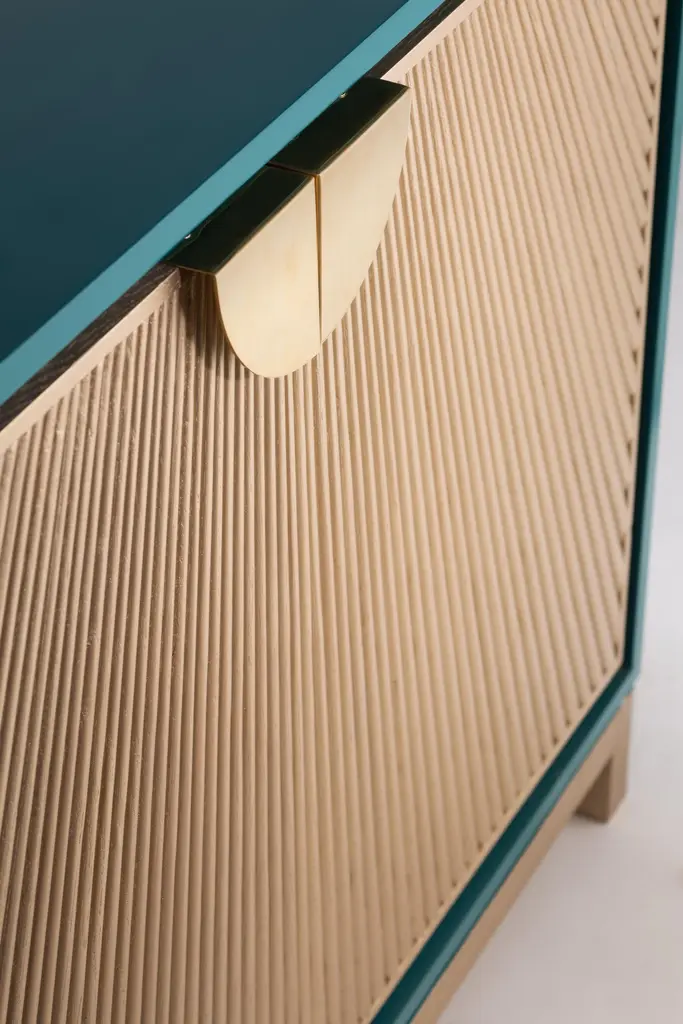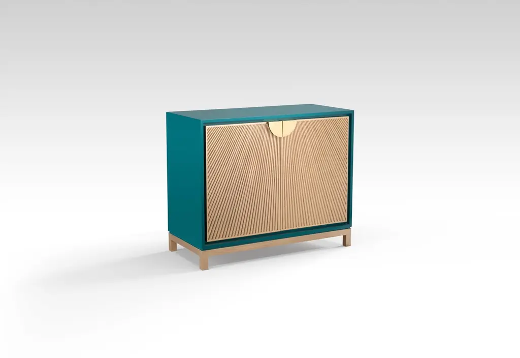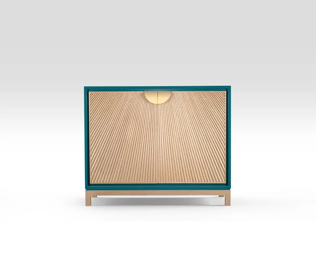 Cabinet with Radiating Silver-Stained Oak Sticks Within a White Lacquered Wood Body. Our Sun Rays cabinet is an embodiment of the Ancient Egyptian symbol of energy, force and rebirth. Inspired from the sun rays manifested on temples walls, the cabinet radiates with authenticity with its lacquered wood frame and bespoke details crowned with “Horus Wings” brass handles. Also available in lacquered teal body with gold-stained Oak sticks and stainless steel handle.