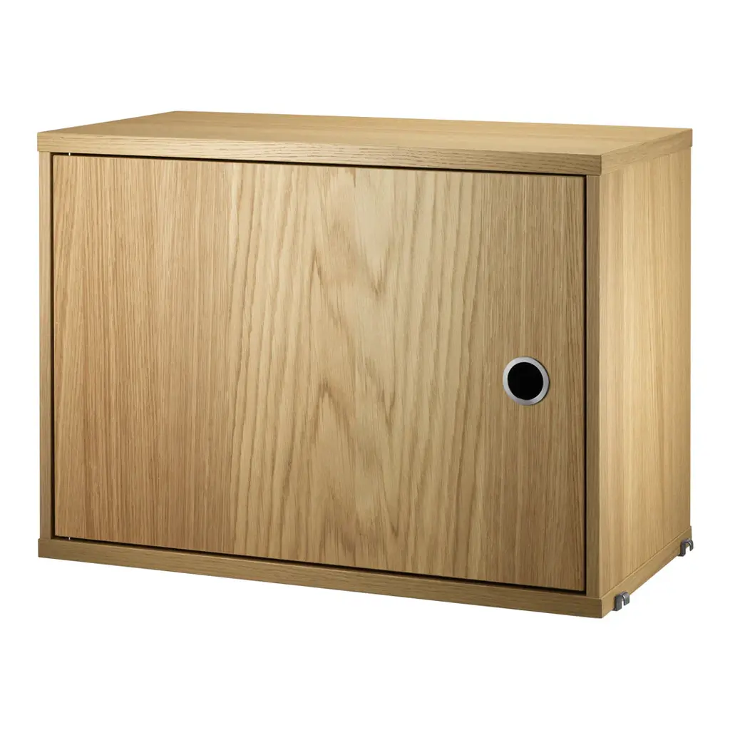 The cabinet with swing door is available in one width, 58 cm, and one depth, 30 cm. The cabinet fits together with all 30 cm deep wire and plex panels from String® System. It is visually pleasing to add a bolder element to your shelf, like a cabinet, which also give you a lot of extra storage. The door can be mounted on either side of the cabinet. The cabinet consists of one adjustable inner shelf and the internal dimensions are: w54 x d26 x h38 cm. The cabinet is delivered unassembled.