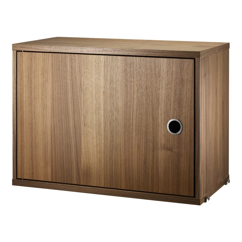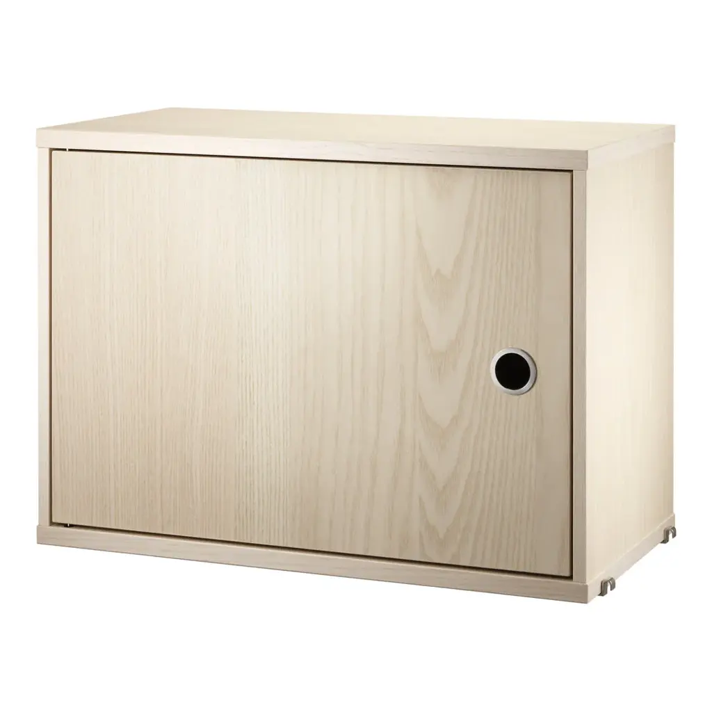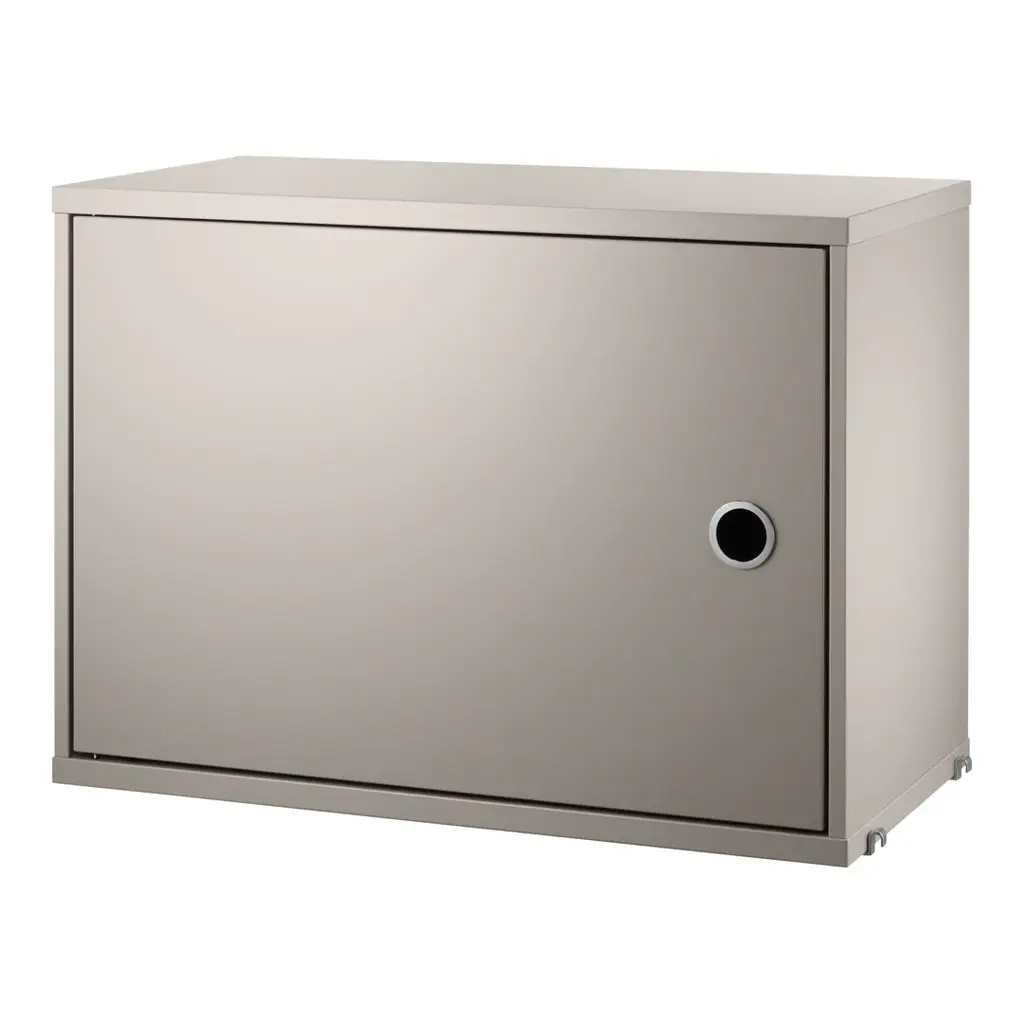 The cabinet with swing door is available in one width, 58 cm, and one depth, 30 cm. The cabinet fits together with all 30 cm deep wire and plex panels from String® System. It is visually pleasing to add a bolder element to your shelf, like a cabinet, which also give you a lot of extra storage. The door can be mounted on either side of the cabinet. The cabinet consists of one adjustable inner shelf and the internal dimensions are: w54 x d26 x h38 cm. The cabinet is delivered unassembled.