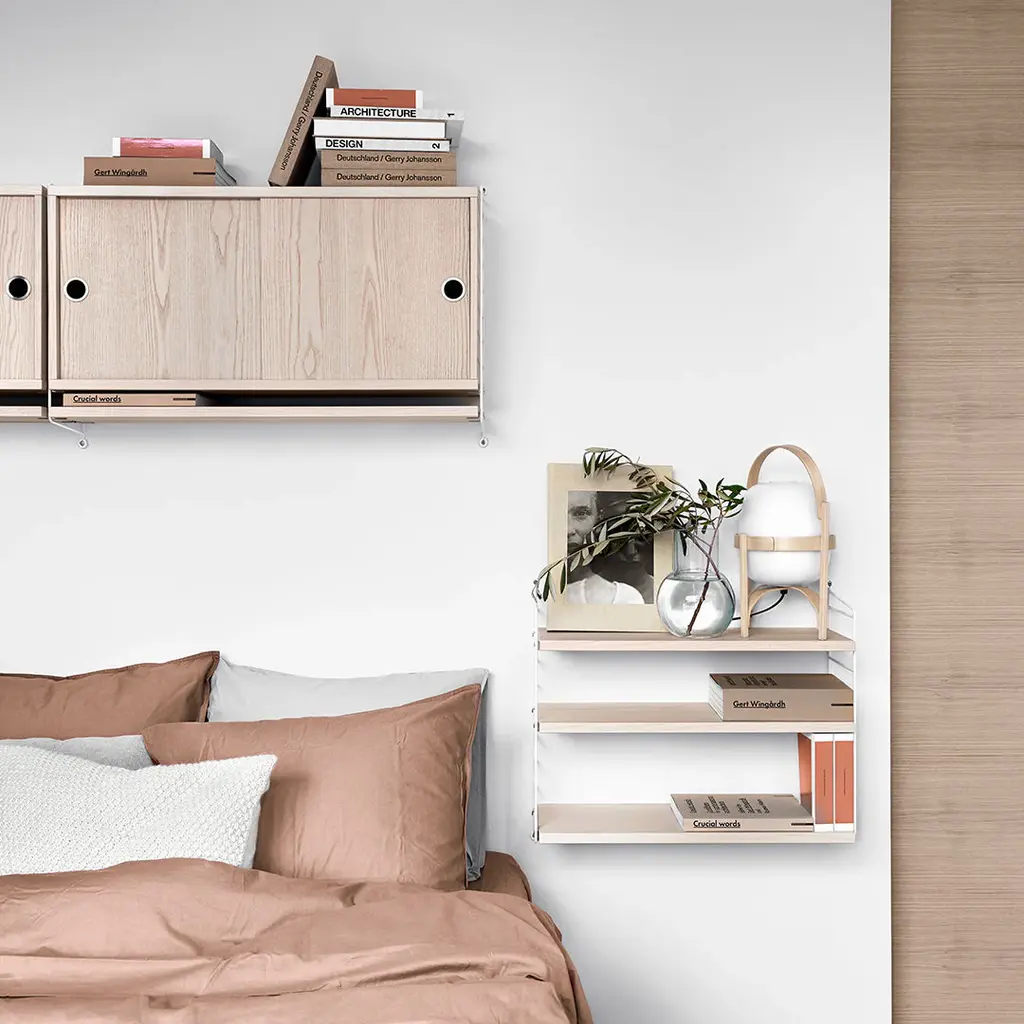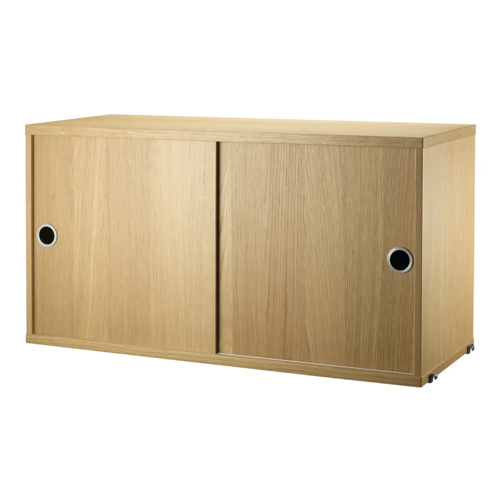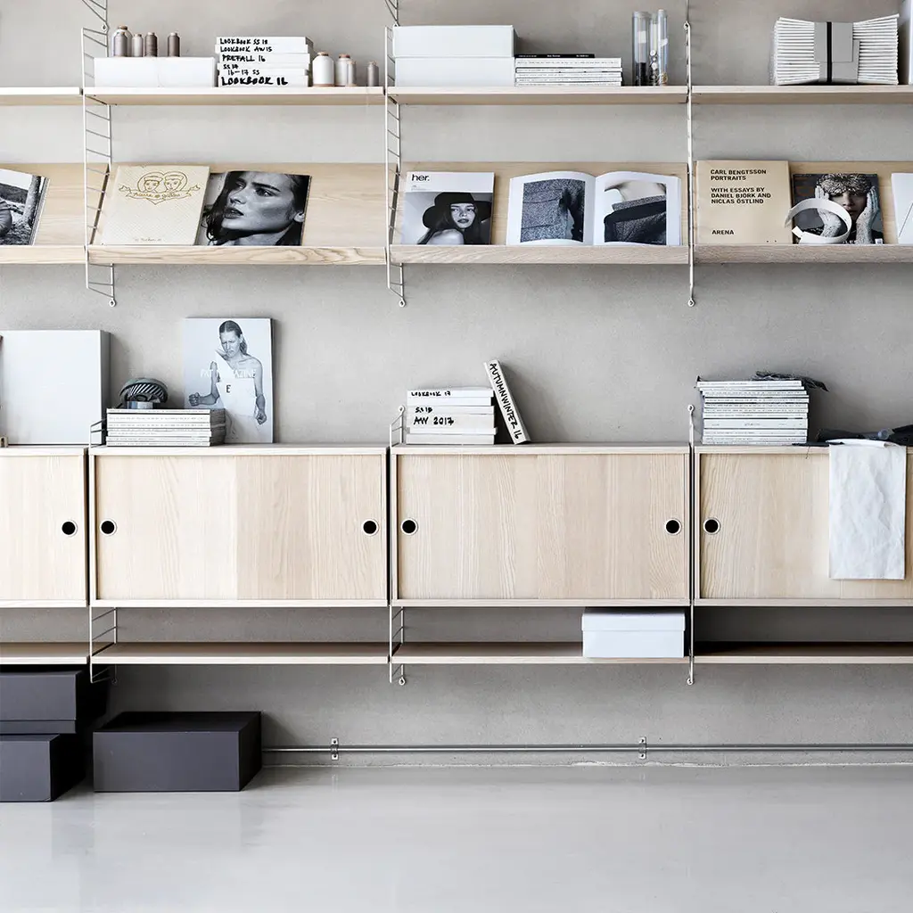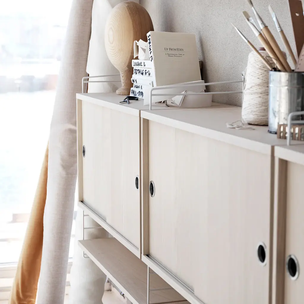 The cabinets with sliding doors are available in one width, 78 cm, along with two depths, 20 and 30 cm. The cabinets fit into all wire and plex panels from String® System. It is visually pleasing to add a bolder element to your shelf, like a cabinet, which also give you a lot of extra storage. The cabinet consists of one divider placed in the middle along with two adjustable inner shelves. The cabinet's inner dimensions are 4 cm less than the outer dimensions. The cabinets are delivered unassembled.