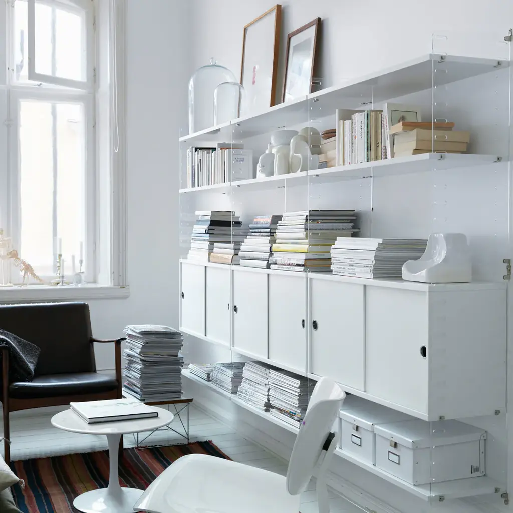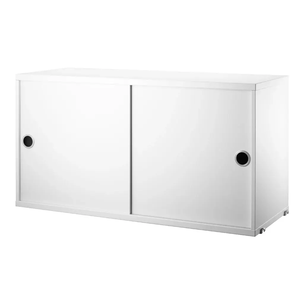 The cabinets with sliding doors are available in one width, 78 cm, along with two depths, 20 and 30 cm. The cabinets fit into all wire and plex panels from String® System. It is visually pleasing to add a bolder element to your shelf, like a cabinet, which also give you a lot of extra storage. The cabinet consists of one divider placed in the middle along with two adjustable inner shelves. The cabinet's inner dimensions are 4 cm less than the outer dimensions. The cabinets are delivered unassembled.