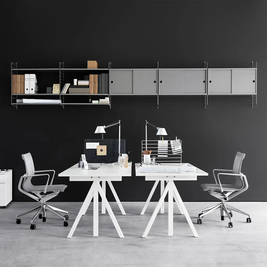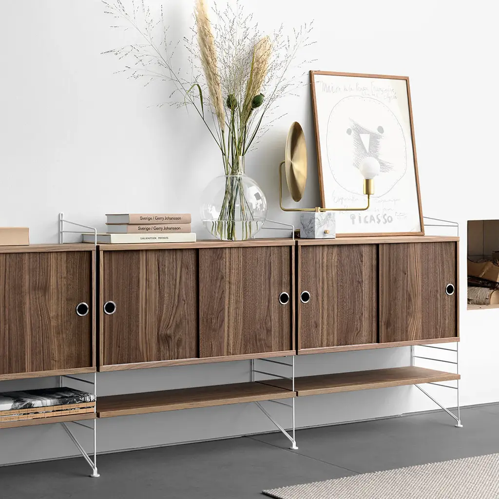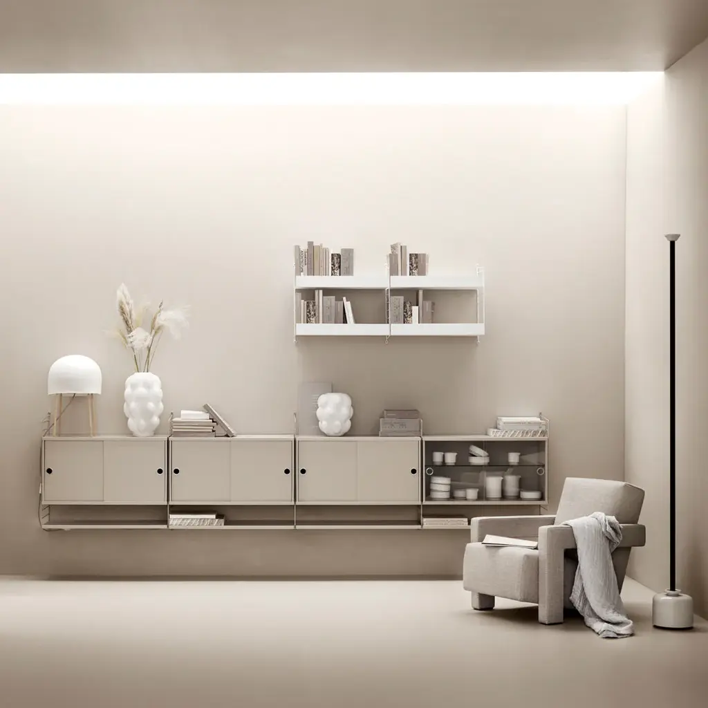 The cabinets with sliding doors are available in one width, 78 cm, along with two depths, 20 and 30 cm. The cabinets fit into all wire and plex panels from String® System. It is visually pleasing to add a bolder element to your shelf, like a cabinet, which also give you a lot of extra storage. The cabinet consists of one divider placed in the middle along with two adjustable inner shelves. The cabinet's inner dimensions are 4 cm less than the outer dimensions. The cabinets are delivered unassembled.