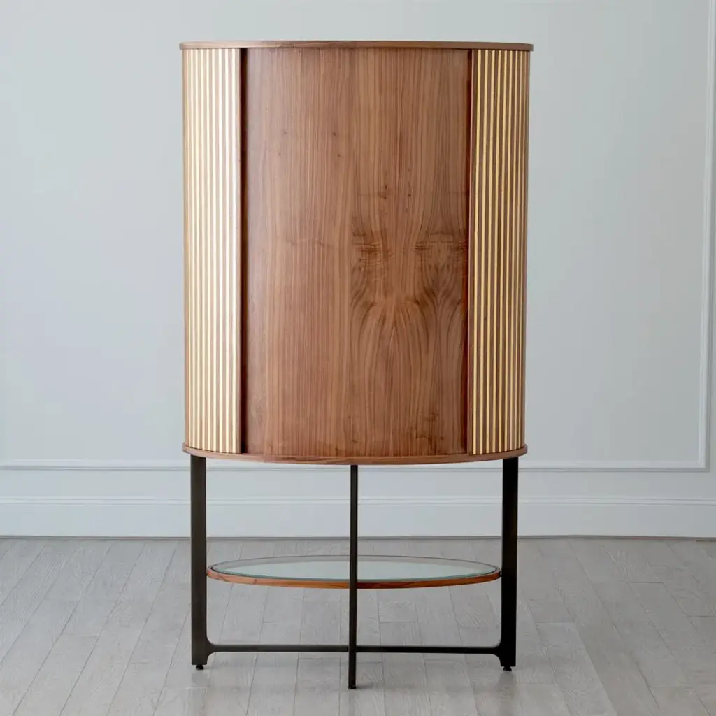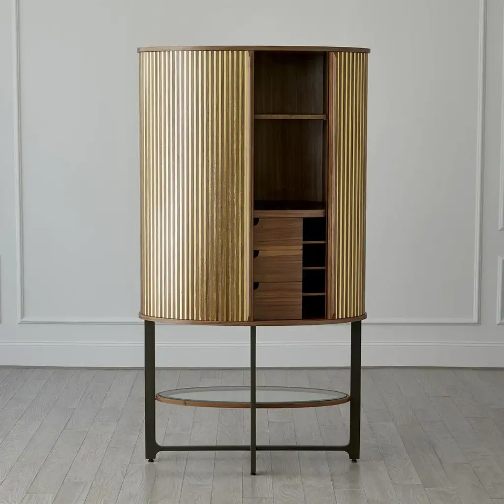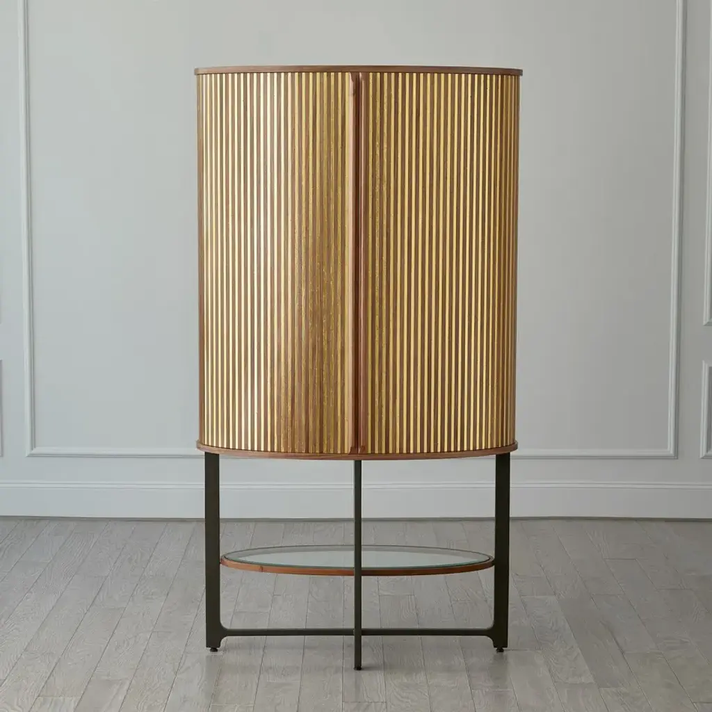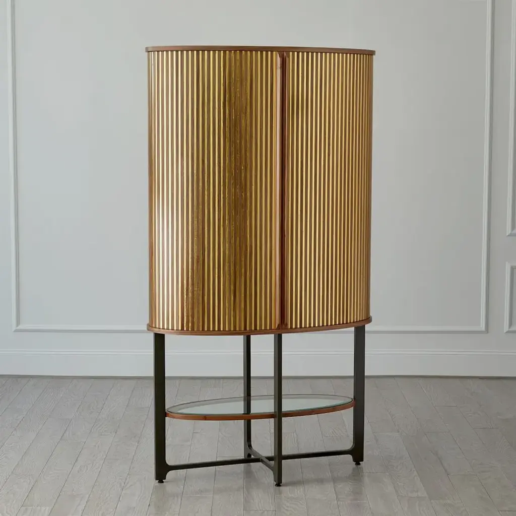 The Cabriolet Tall Cabinet features tambour doors constructed of solid walnut hardwoods and veneers with hand applied gold leaf details and Italian porcelain surfaces. The interior includes an adjustable shelf and three drawers. From a fashion forward perspective, Global Views offers accessories, furniture, statement lighting, and an assortment of rugs and mirrors to add beauty and joy to your home.