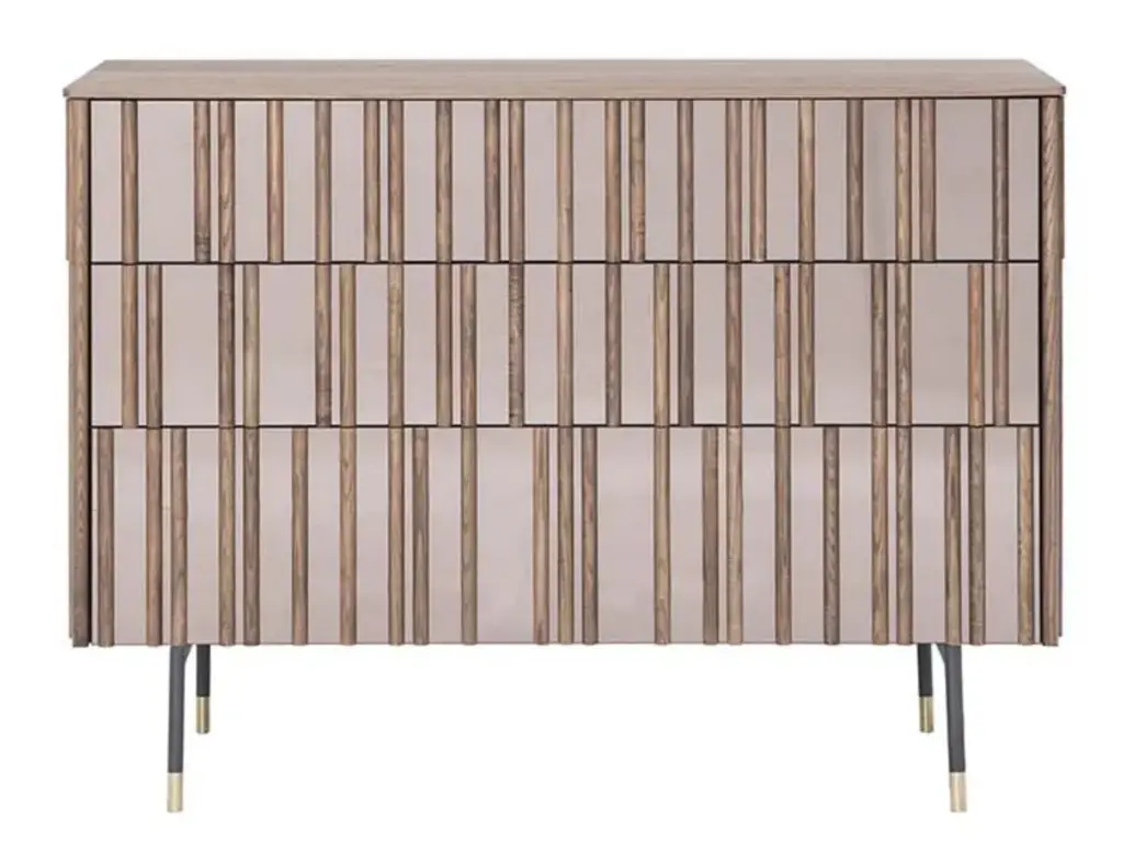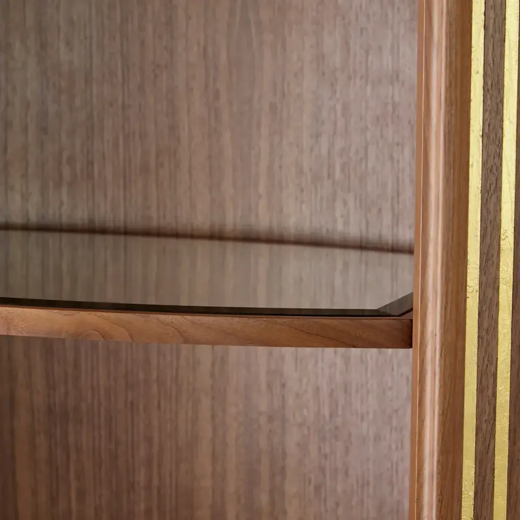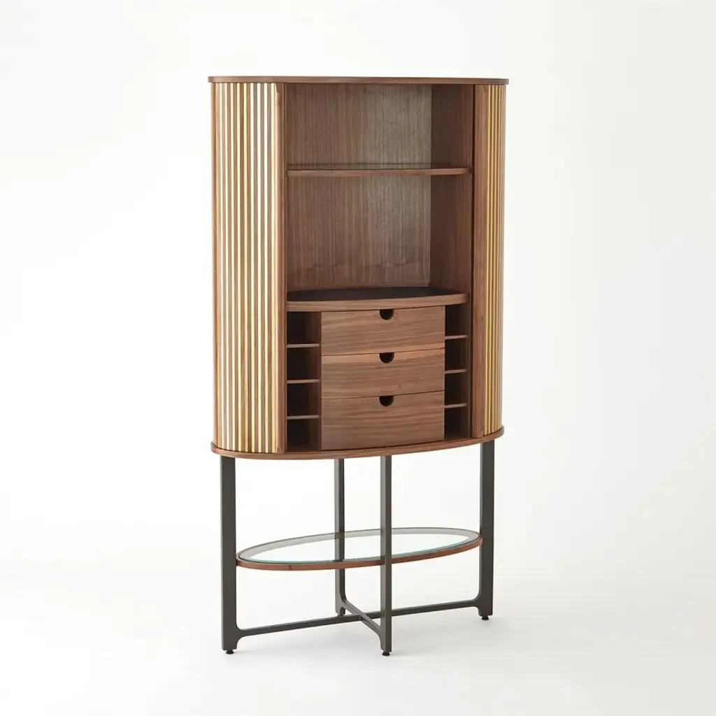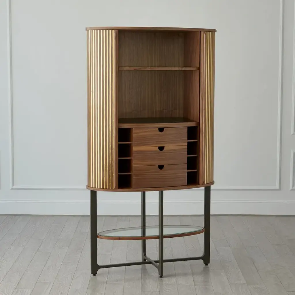 The Cabriolet Tall Cabinet features tambour doors constructed of solid walnut hardwoods and veneers with hand applied gold leaf details and Italian porcelain surfaces. The interior includes an adjustable shelf and three drawers. From a fashion forward perspective, Global Views offers accessories, furniture, statement lighting, and an assortment of rugs and mirrors to add beauty and joy to your home.