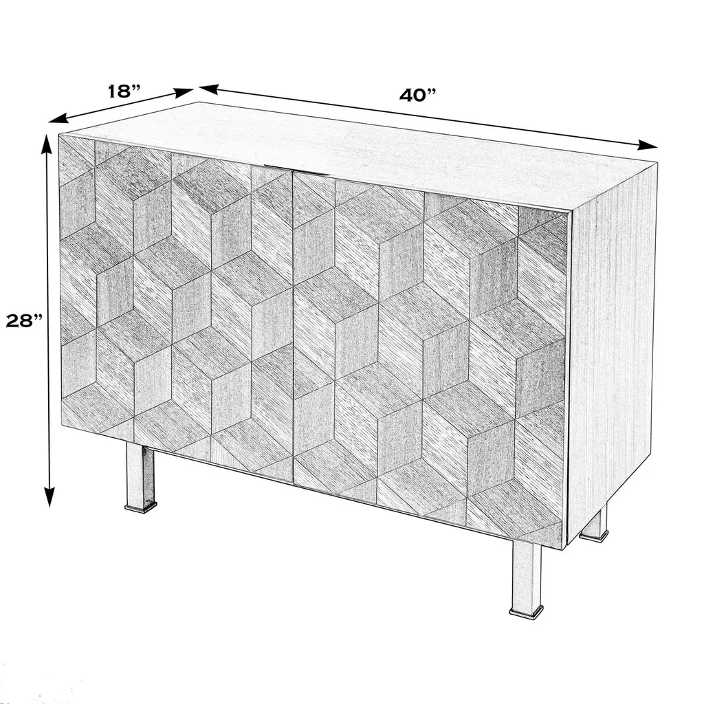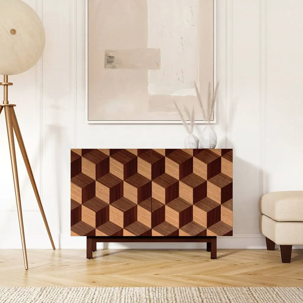 The Caleb 2-Door cabinet is a masterpiece in design, featuring a striking geometric cube pattern on the doors that blend beautifully with the rich tones on the top and sides. Elevated on a sturdy frame, it seamlessly marries artistry with functionality, creating a piece that is both captivating and practical. This cabinet is not just furniture; it's a statement of elegance and style, inviting admiration and enhancing any space it graces.