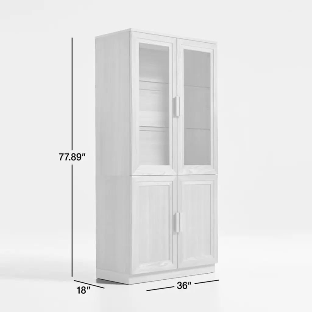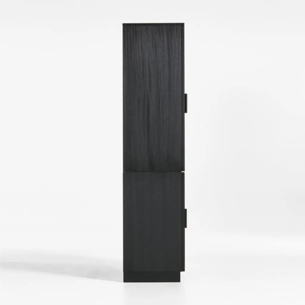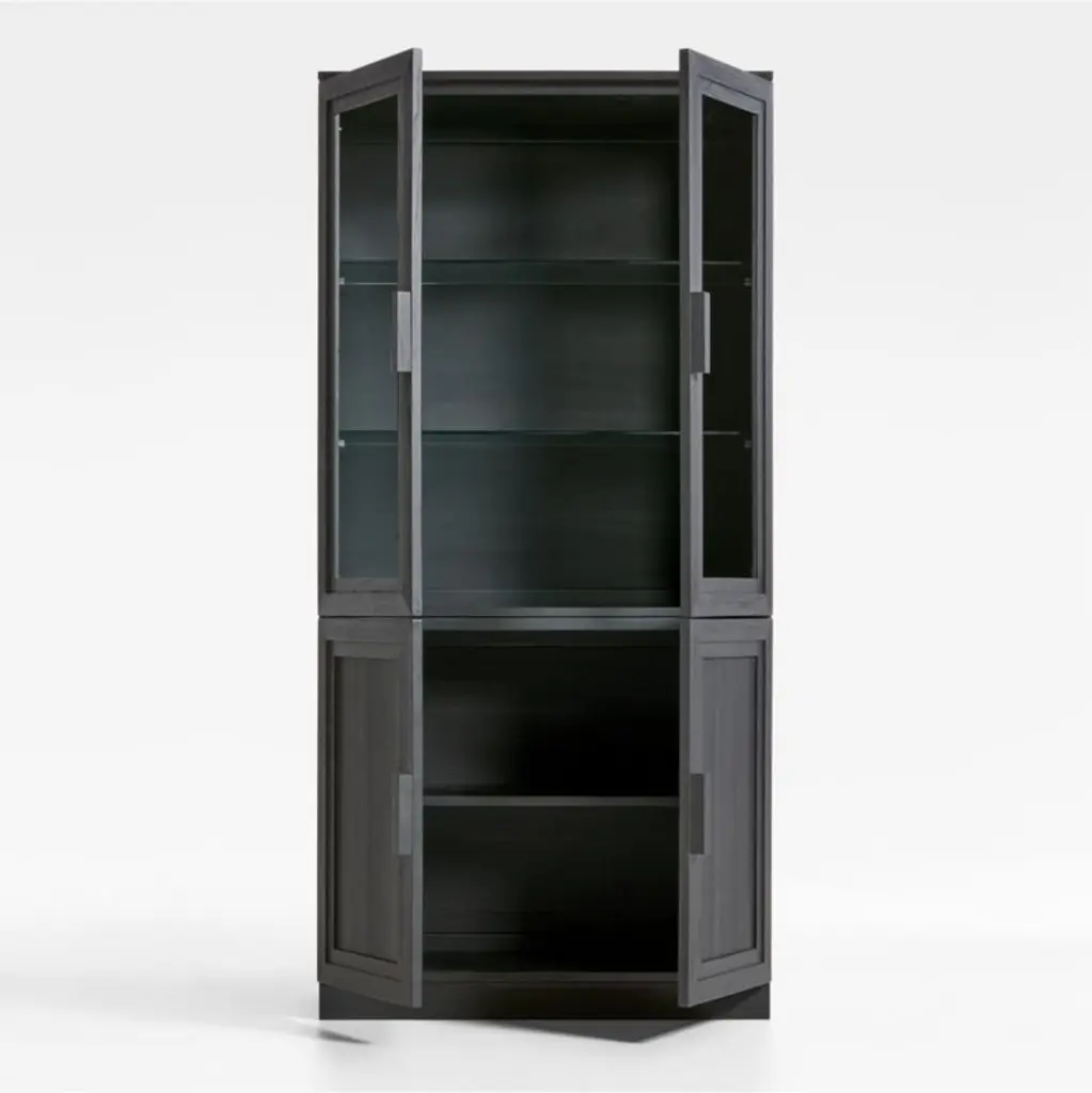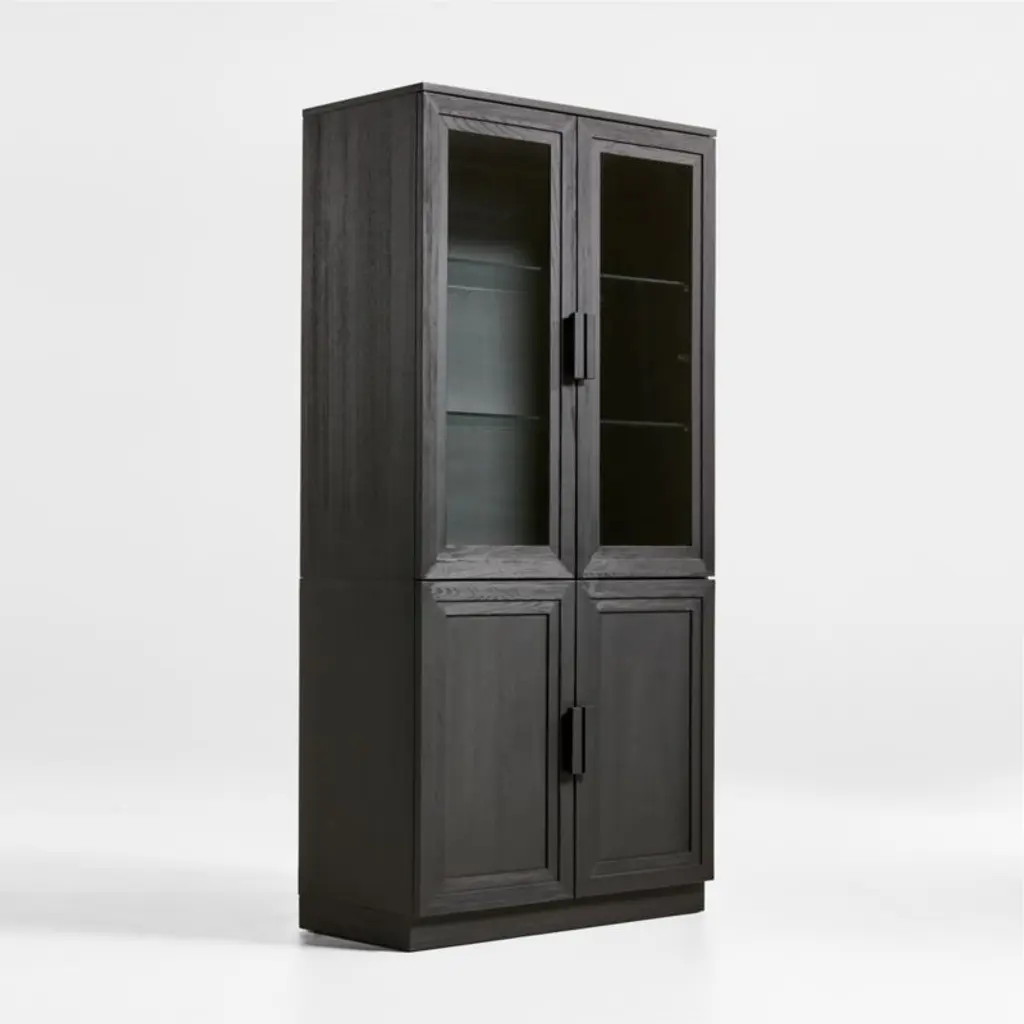 Inspired by classic barrister cabinetry, our Calypso collection opens up living room storage with a light and airy look. Elm wood frames each piece in this roomy configuration with stepped trim and black finish to bring out the grain. The two-piece unit tops a wood-door base with a glass-door hutch for a mix of open and closed storage of books, media components and collectibles. A recessed plinth base and blocky pulls add modern details to this timelessly styled black storage configuration, a Crate & Barrel exclusive.By choosing FSC ®-certified furniture, you are supporting responsible management of the world's forests.
