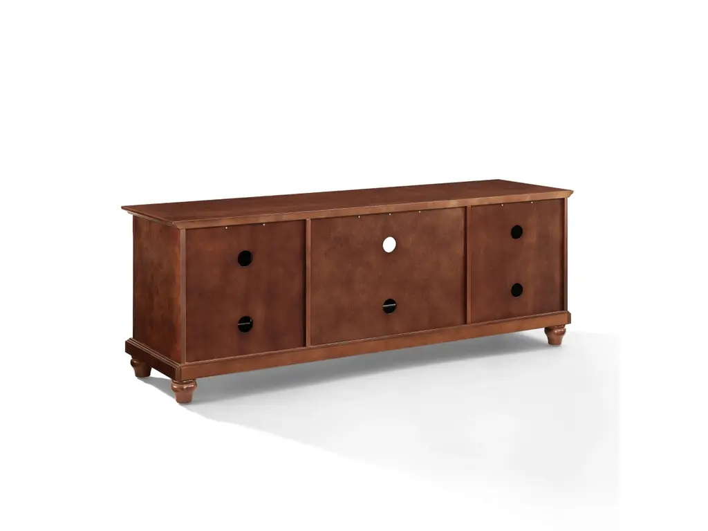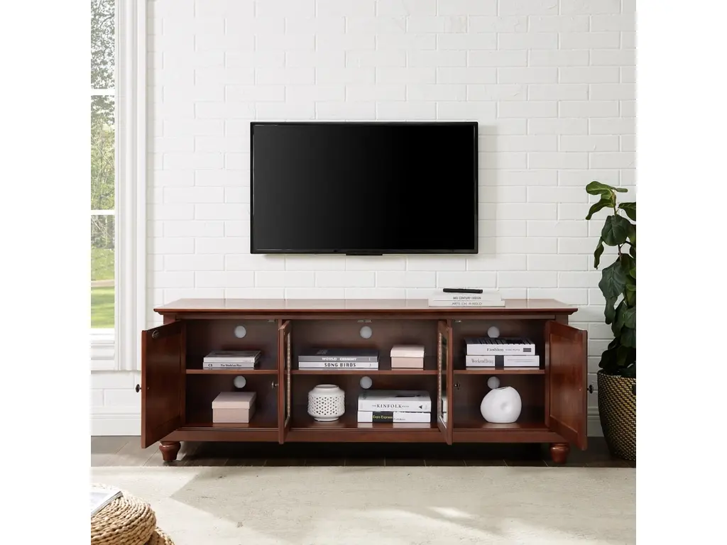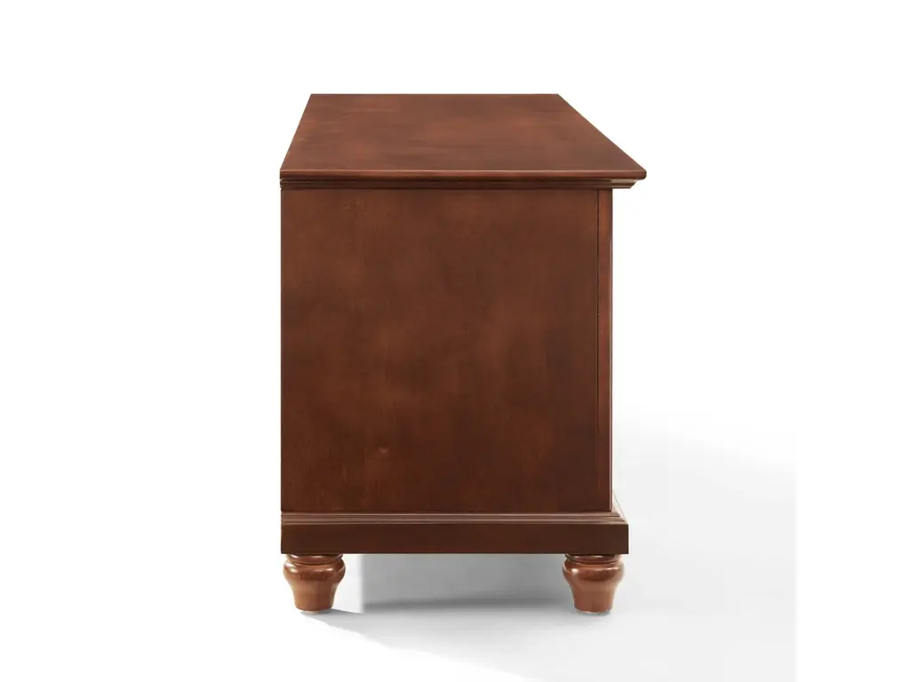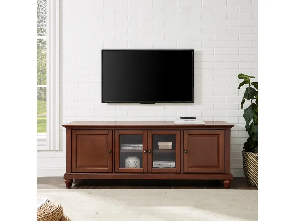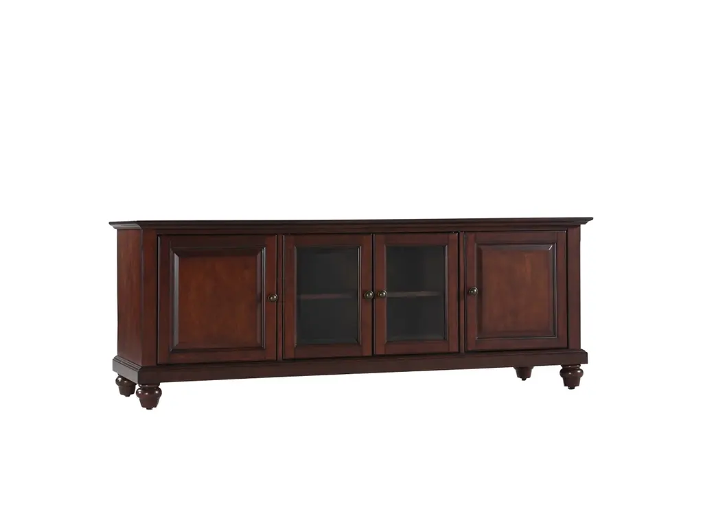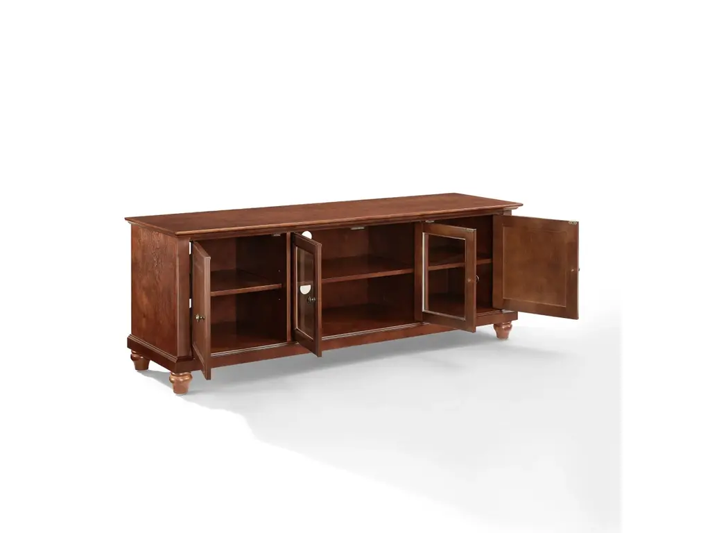 Enhance your living space with this impeccably crafted low profile tv stand. Refined details like a hand-rubbed finish give this low-profile cabinet a distinguished look. Styled with tempered beveled glass doors and raised panel doors, this low-profile cabinet is ideal for holding up to a 60" flat panel tv and all your electronic components. Raised panel doors conceal cds and dvds or other items while electronic components can be stored behind the beveled tempered glass, so they are still accessible by remote controls. Open storage area generously houses media players and cable boxes, while adjustable shelving offers an abundance of versatility for organizing components and accessories.