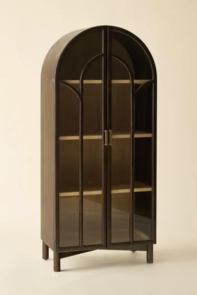 Create an elevated display out of all your favorite things with this statement storage cabinet. This standout storage piece features a tall, curved silhouette with arch wood detailing accenting each door. Available exclusively at Urban Outfitters. **Features** \- Camille Statement Storage Cabinet from UO Home \- Arched silhouette with room to room to display books, trinkets, dinnerware and more \- Glass-paned doors with arch wood accents \- Three adjustable shelves to display your trinkets, novels and more \- Cord cutout in the back panel \- Removable legs \- Assembly required \- UO exclusive **Content + Care** \- Some assembly required - we recommend two people for assembly. Assembly instructions and hardware are included. \- MDF, bentwood, rubberwood veneer, solid rubberwood, 3mm glass \- Wipe clean \- Imported **Size** \- Dimensions: 32"l x 17"w x 72"h \- Leg height/Clearance: 6", removable \- Top & bottom shelf dimensions: 30.3"l x 15"w x 15"h \- Middle & base shelf dimensions: 30.3"l x 15"w x 10.5"h \- Space between holes for adjustable shelves: 2.5" \- Weight: 151 lbs \- Shipping package dimensions: 39"l x 21"w x 72"h \- Shipping package weight: 185 lbs