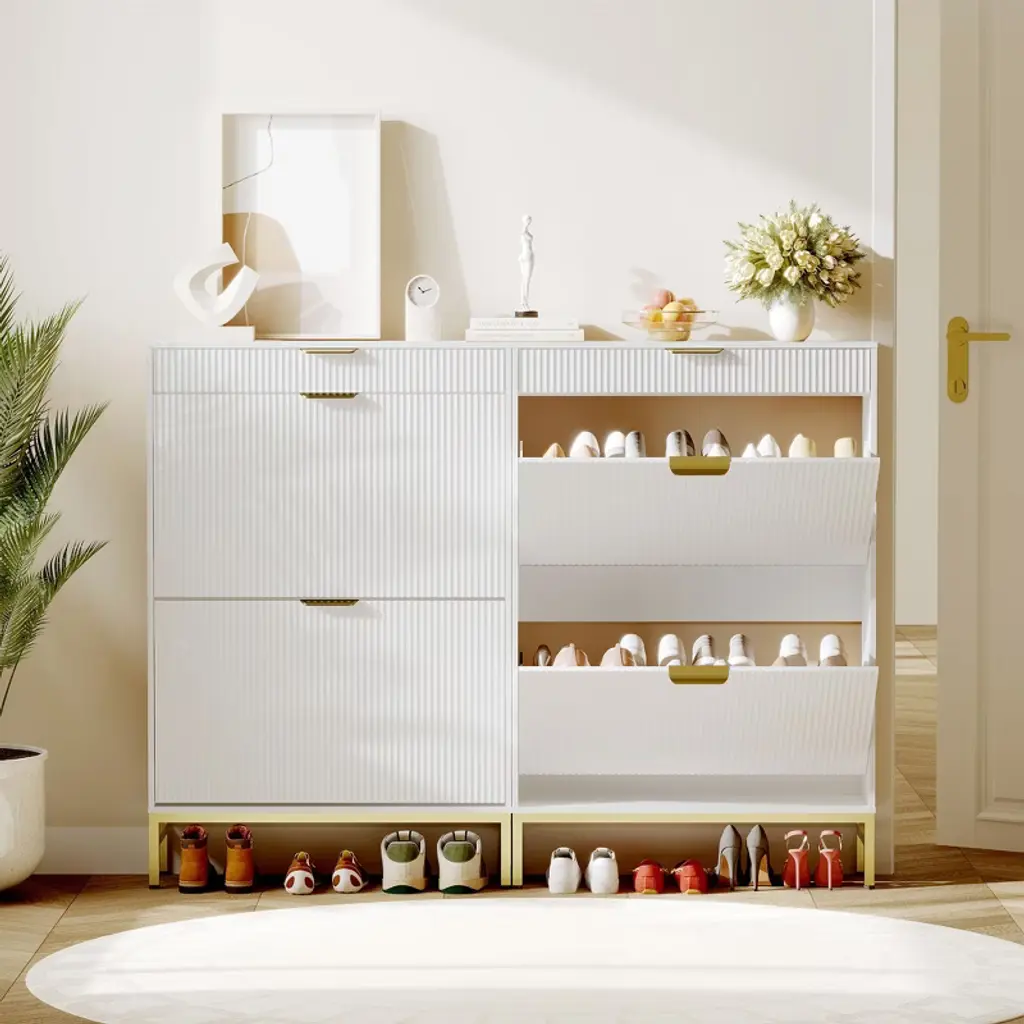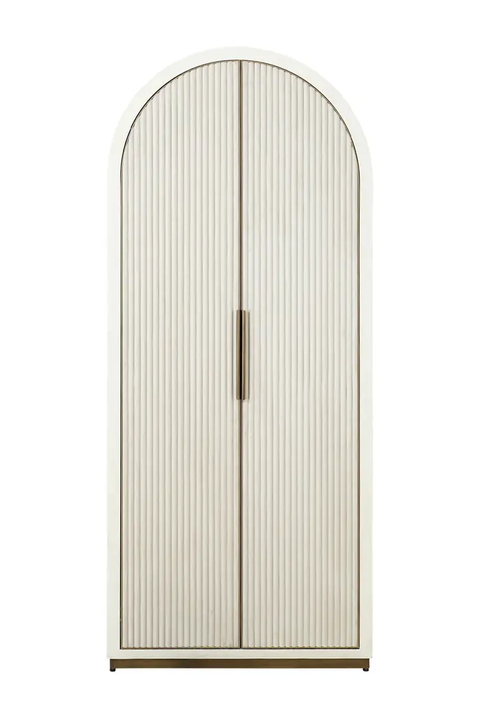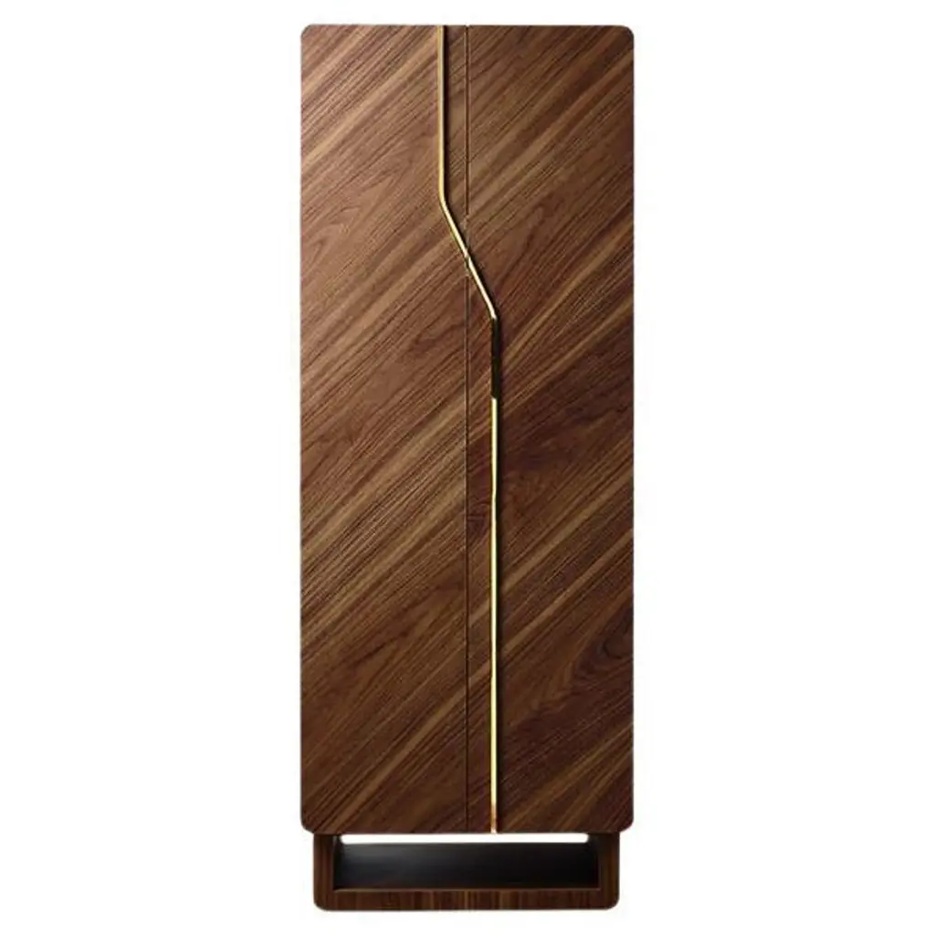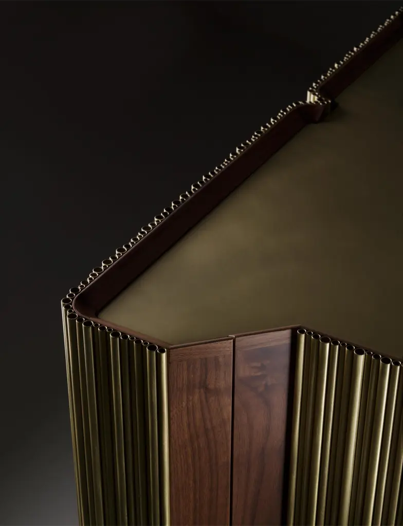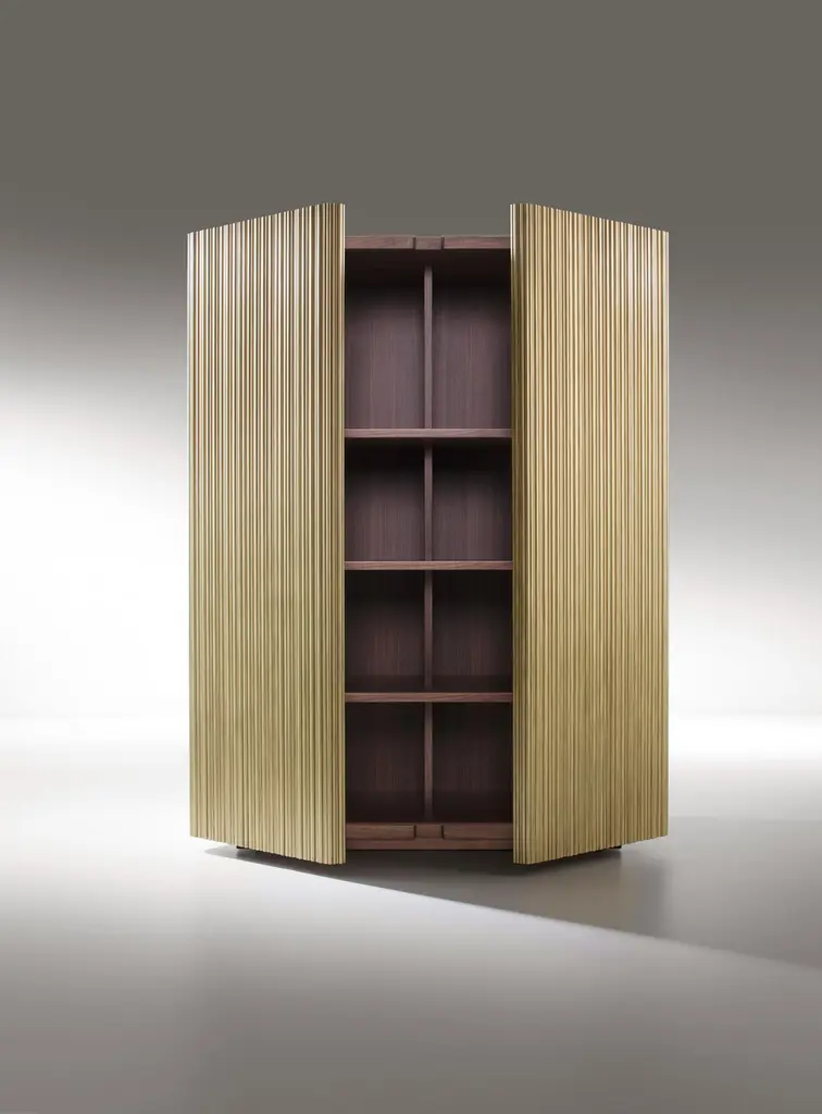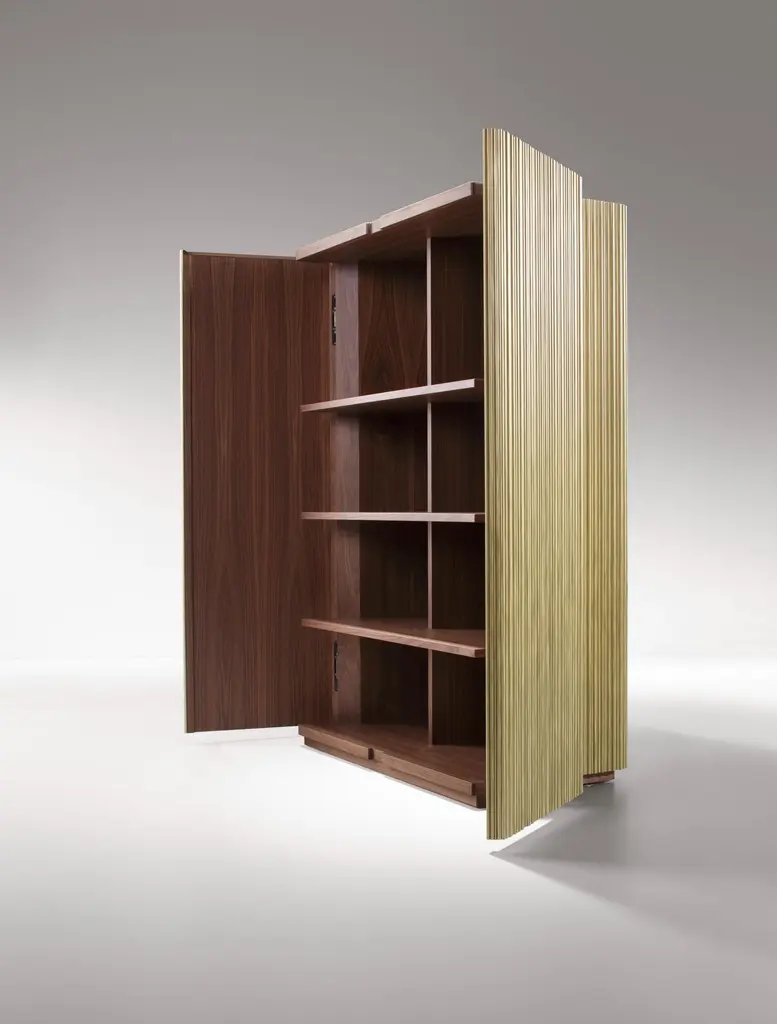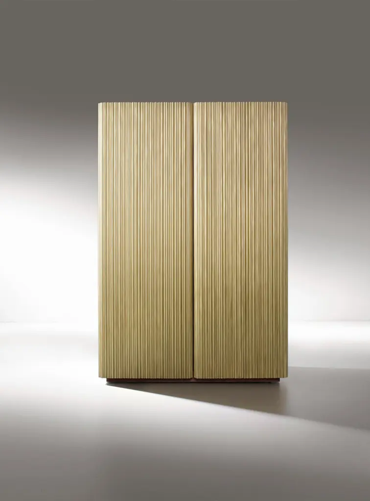 Canneto Cabinet by De CastelliDimensions: W 102 x D 57 x H 157 cmMaterials: Brushed Brass, Canaletto Walnut WoodCopper and Stainless Steel versions also available. Please contact us for any request.The sculptural surface is defined by fluting composed of vertical rods of different sizes in brushed metal, creating irregular undulations and a fascinating interplay of reflections. This two-door piece of furniture comes with inner shelves and dividers. The two L-shaped doors open at 90 degrees thanks to their unique design. The metal top is set slightly lower than the doors and the perimeter of the piece, thereby highlighting the frame in black walnut, a precious wood that has also been used for the shelves and inside of the unit to create haute sophistication.DE CASTELLI“HARD COUTURE”Faithful to its decision to reinstate the special role of metal in design and experimentation, De Castelli infuses artisan ideas and workmanship into industrial processes, leading to entirely original results. The encounter with design inspires an approach to materials founded upon respect for their potential, be it hidden or obvious, which emerges slowly in a collection of pieces that, despite being part of a series, remain unique.Unique not only for the hand that has created them, but also for the singular cultural path that focuses on the aesthetic (and not just practical) value of the primordial material with which De Castelli shapes living spaces.A BESPOKE APPROACHEach object, even in the repetition of form, is a creative act in and of itself, one that incorporates a heritage of constantly-evolving expertise and research. The equation that relegates ‘cold’ metals to the margins of furnishing projects is thus overturned, bringing iron, brass and copper, in their infinite variations and finishes, to the centre of an entirely renewed stage, allowing them to finally shine with their own light.SUSTAINABILITYDe Castelli has always been committed to making the entire production cycle increasingly sustainable, aware that metal, the material with which its business identifies itself, is precious and must be treated with care, without waste.PEOPLE FIRSTThe wide spaces of the De Castelli headquarters in Crocetta del Montello (TV) allow those who work to enjoy environments where order, cleanliness and safety are always maintained and guaranteed. An attitude of attention and respect for people that has led to the shared ethical code.