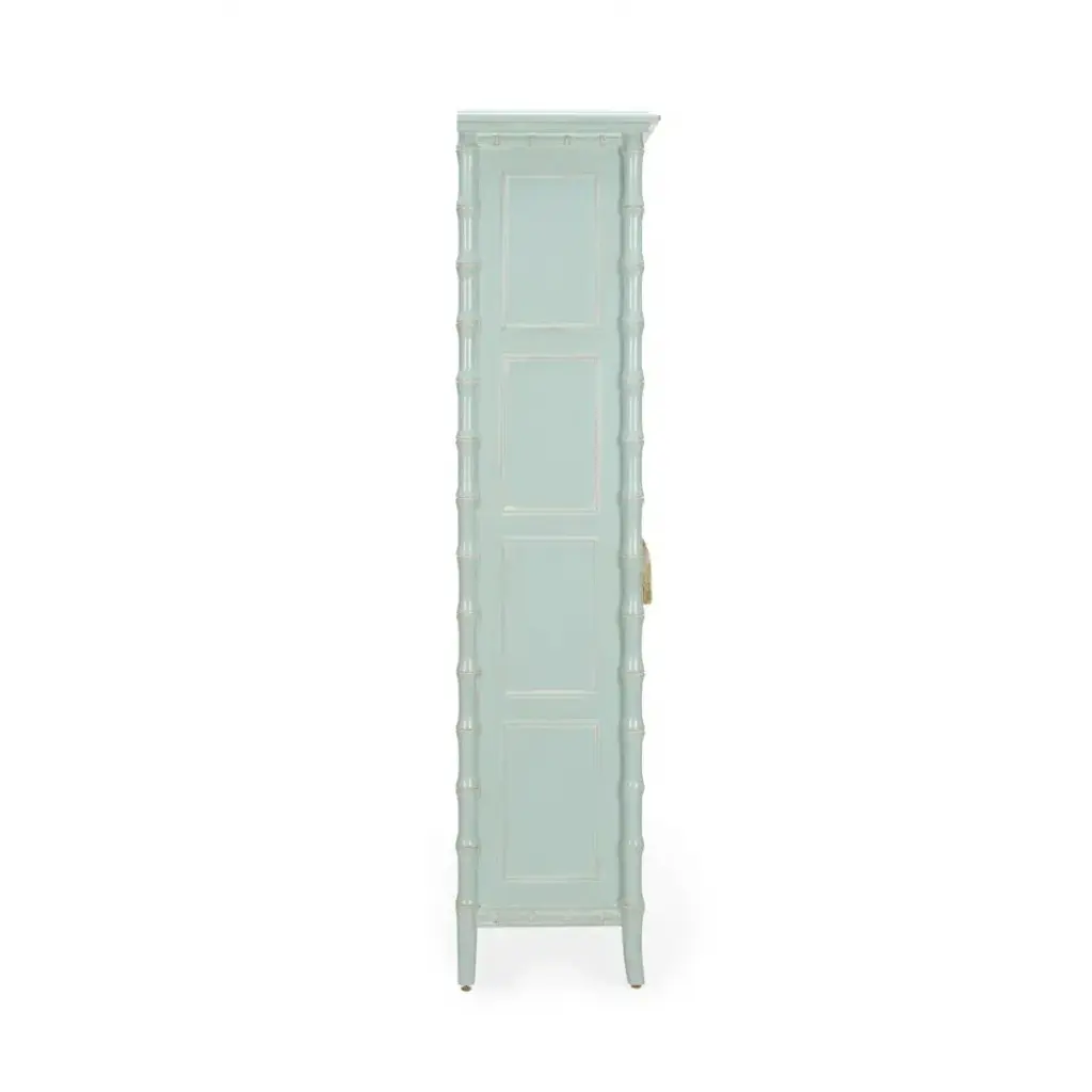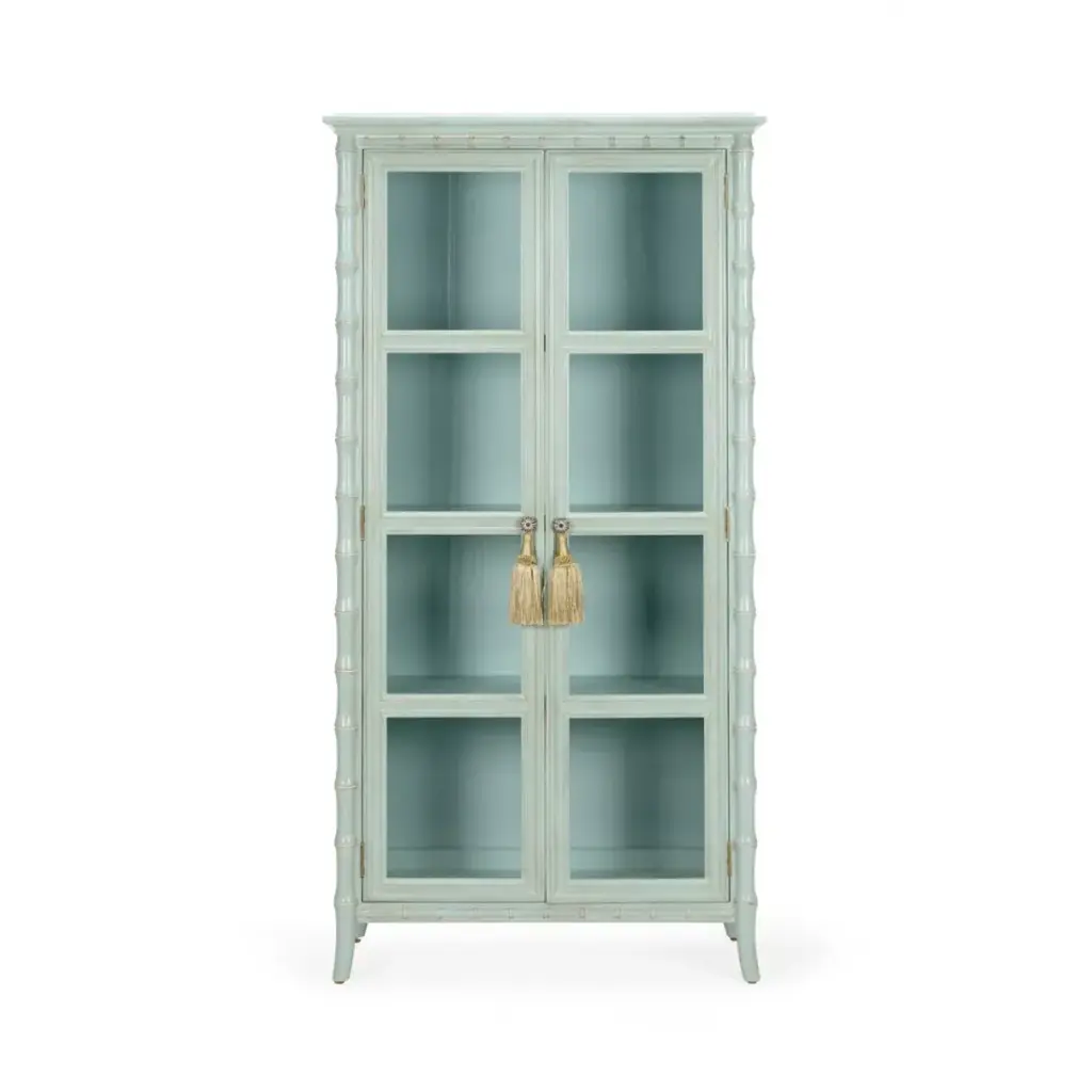 Yarmouth Linen Cabinet Is Crafted Of Wood And Features A Stylish Bamboo Design Painted A Lovely Yarmouth Blue With A Whitewashed Finish. Two Glass Doors Open To Reveal Four Wooden Shelves For Storing Linens Or Displaying Your Favorite Decorative Accessories. The Round Whitewashed Bronze Door Pulls Are Adorned With A Set Of Gold Tassels That Add A Feminine Feel To The Design.