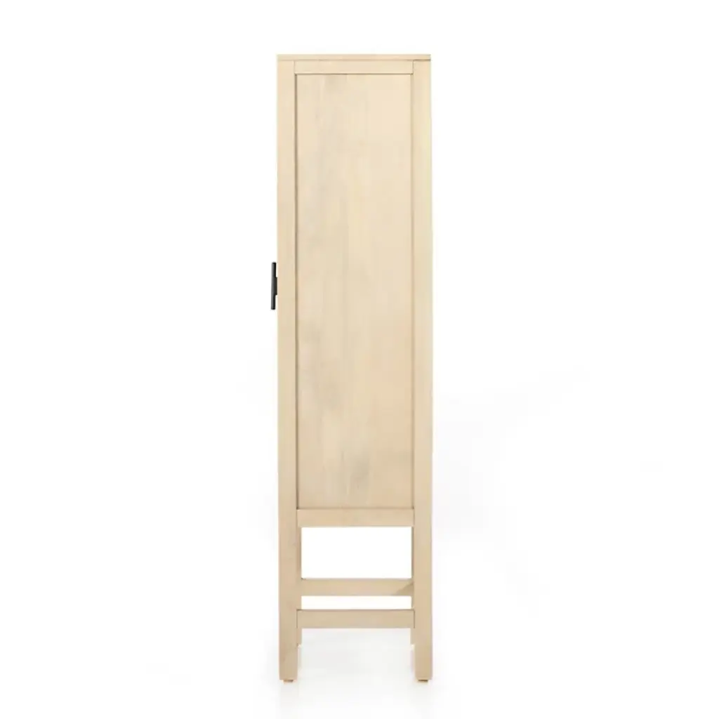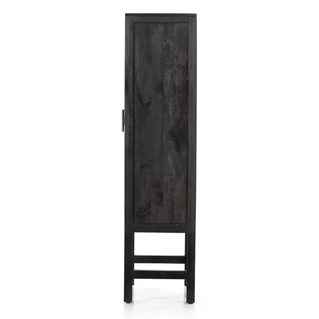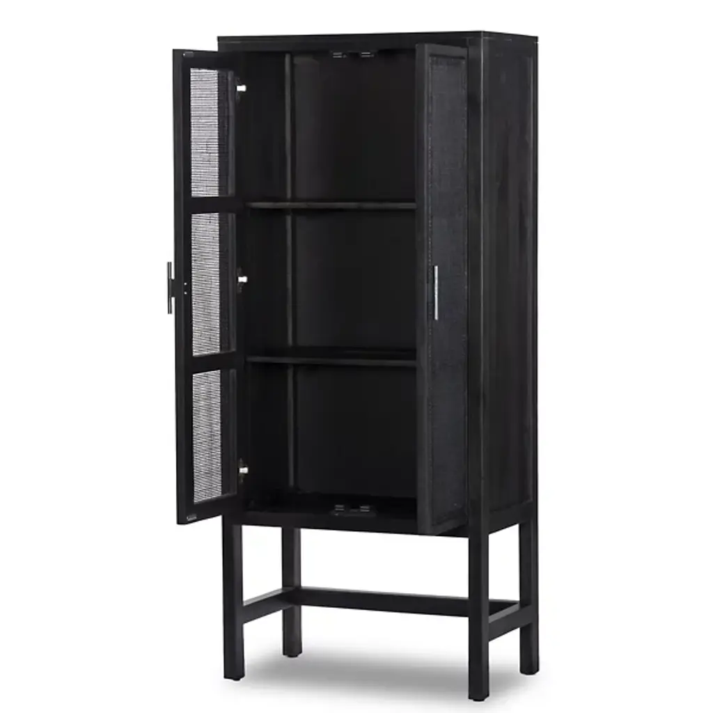 The Caprice Narrow Cabinet by Four Hands features a captivating two-tone design with a textural twist. The washed black acacia frame pairs elegantly with woven cane doors, which open to reveal ample interior storage. Set on a sleek Parsons-style base, the cabinet maintains an open and airy aesthetic, blending modern sophistication with practical functionality. This piece is a perfect addition to any room, offering both style and versatile storage.