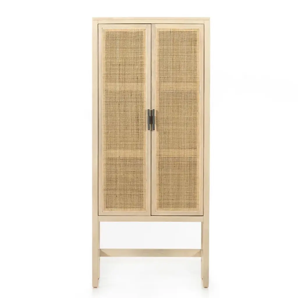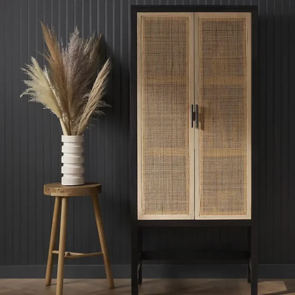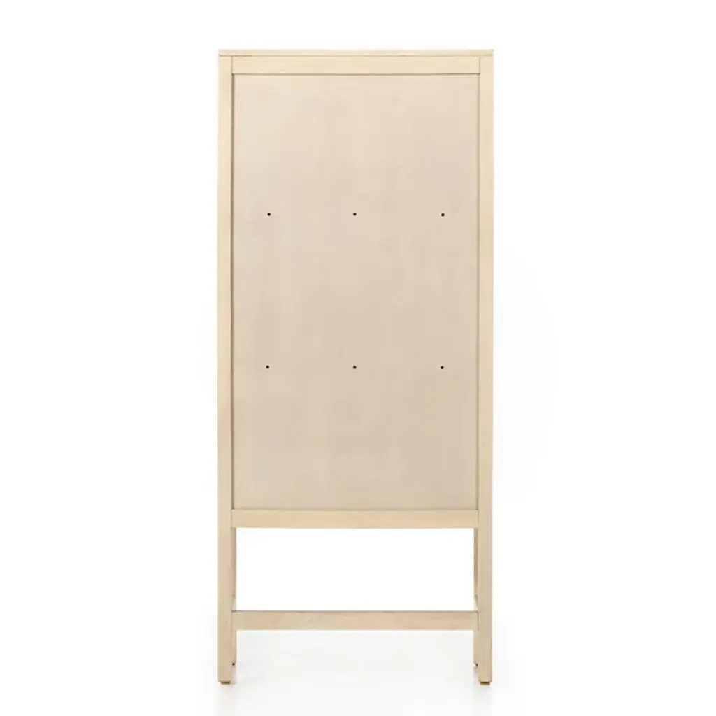 The Caprice Narrow Cabinet by Four Hands features a captivating two-tone design with a textural twist. The washed black acacia frame pairs elegantly with woven cane doors, which open to reveal ample interior storage. Set on a sleek Parsons-style base, the cabinet maintains an open and airy aesthetic, blending modern sophistication with practical functionality. This piece is a perfect addition to any room, offering both style and versatile storage.