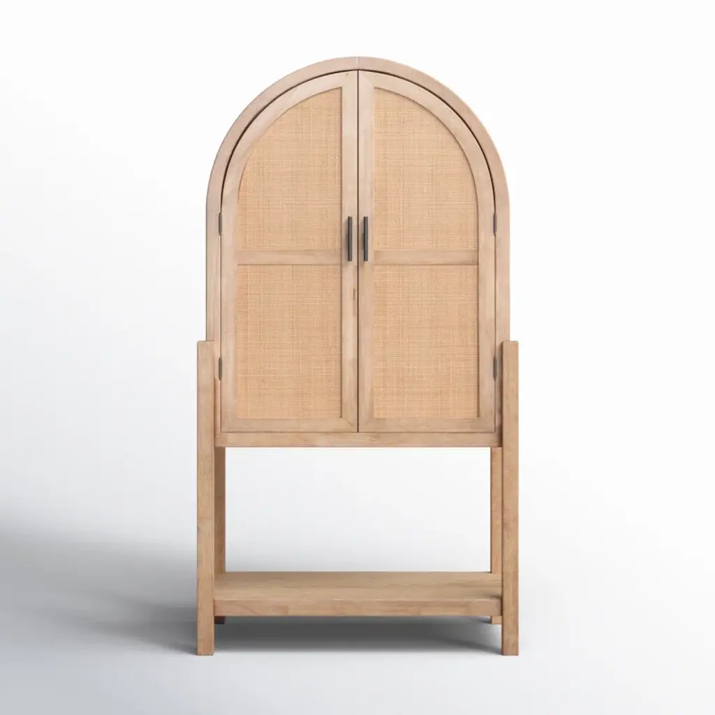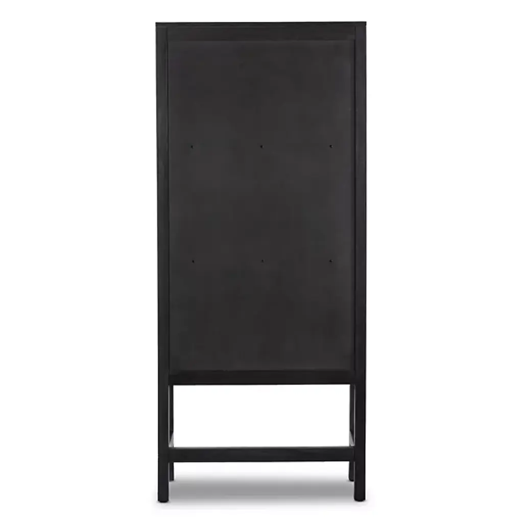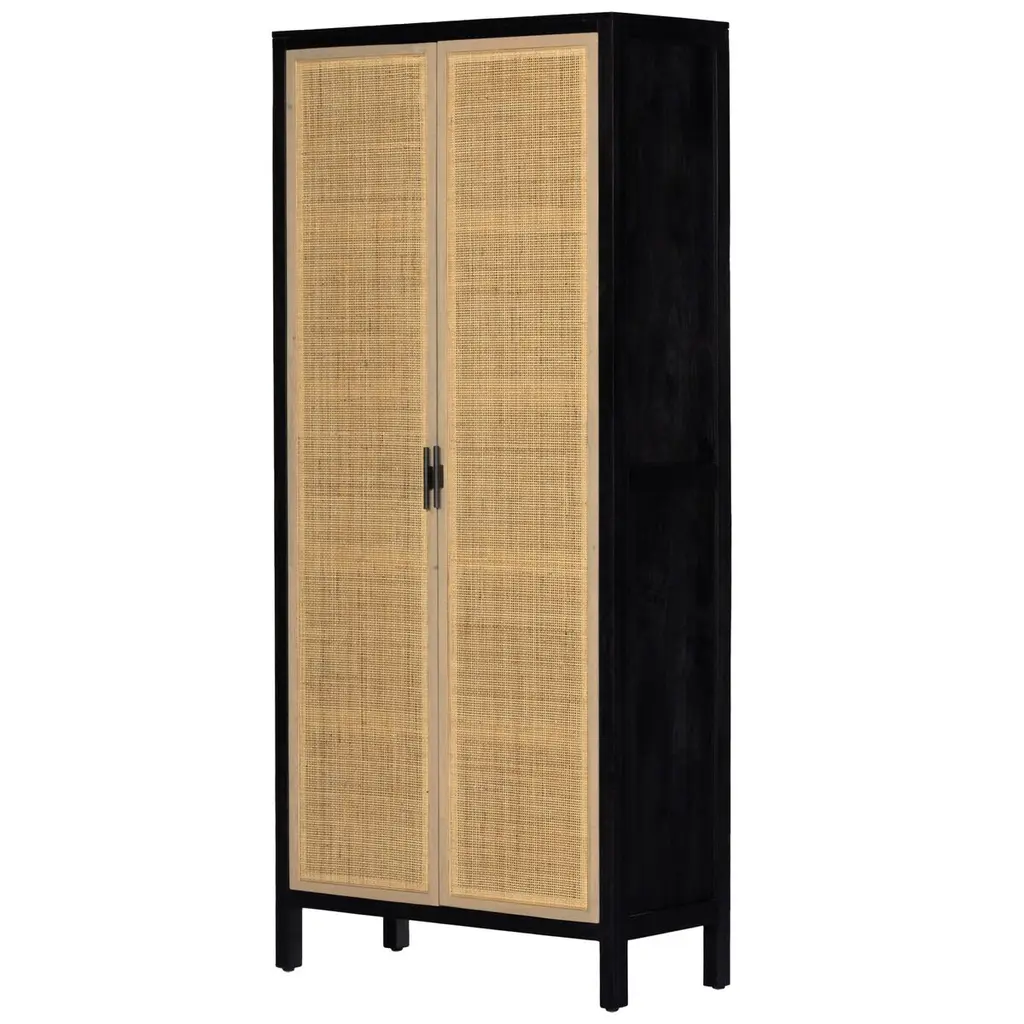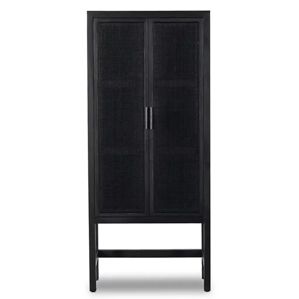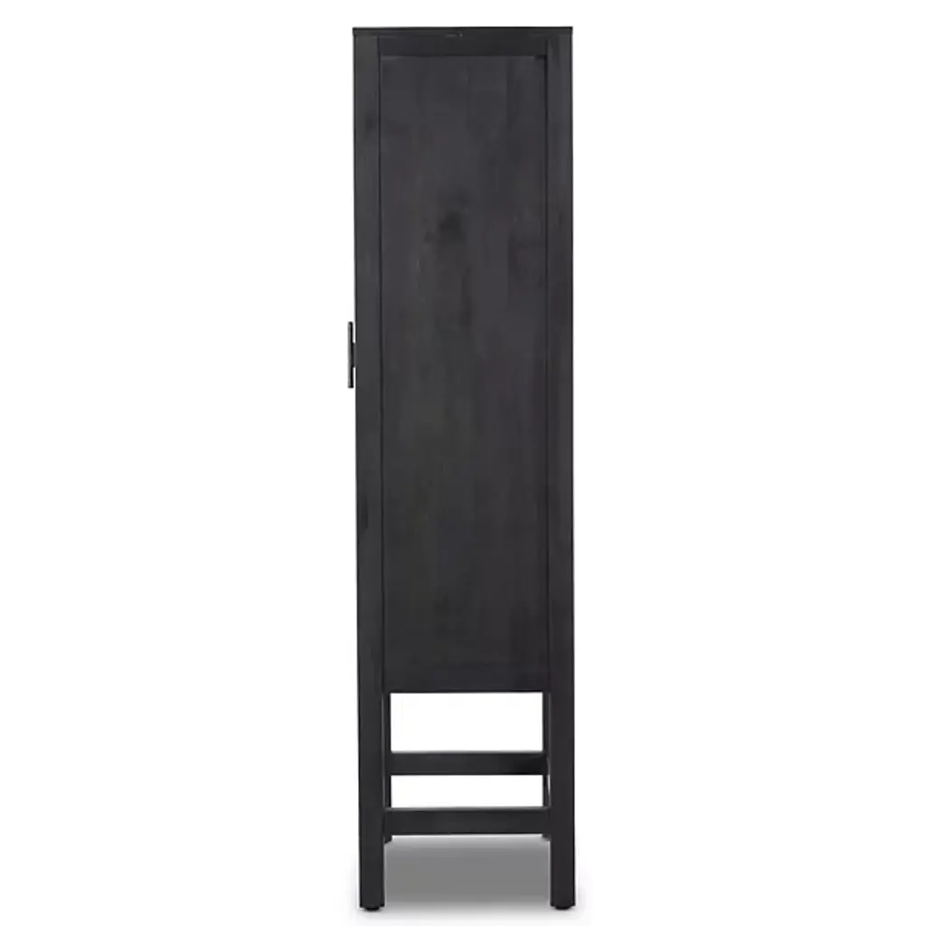 The Caprice Narrow Cabinet by Four Hands features a captivating two-tone design with a textural twist. The washed black acacia frame pairs elegantly with woven cane doors, which open to reveal ample interior storage. Set on a sleek Parsons-style base, the cabinet maintains an open and airy aesthetic, blending modern sophistication with practical functionality. This piece is a perfect addition to any room, offering both style and versatile storage.