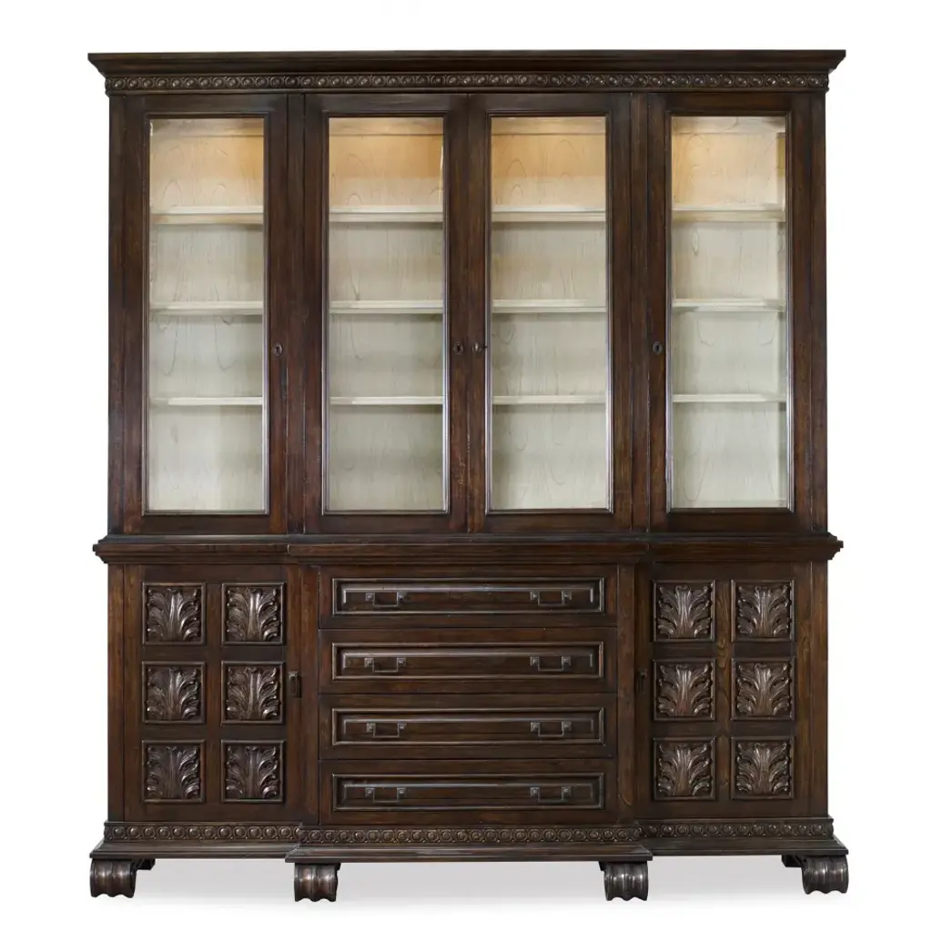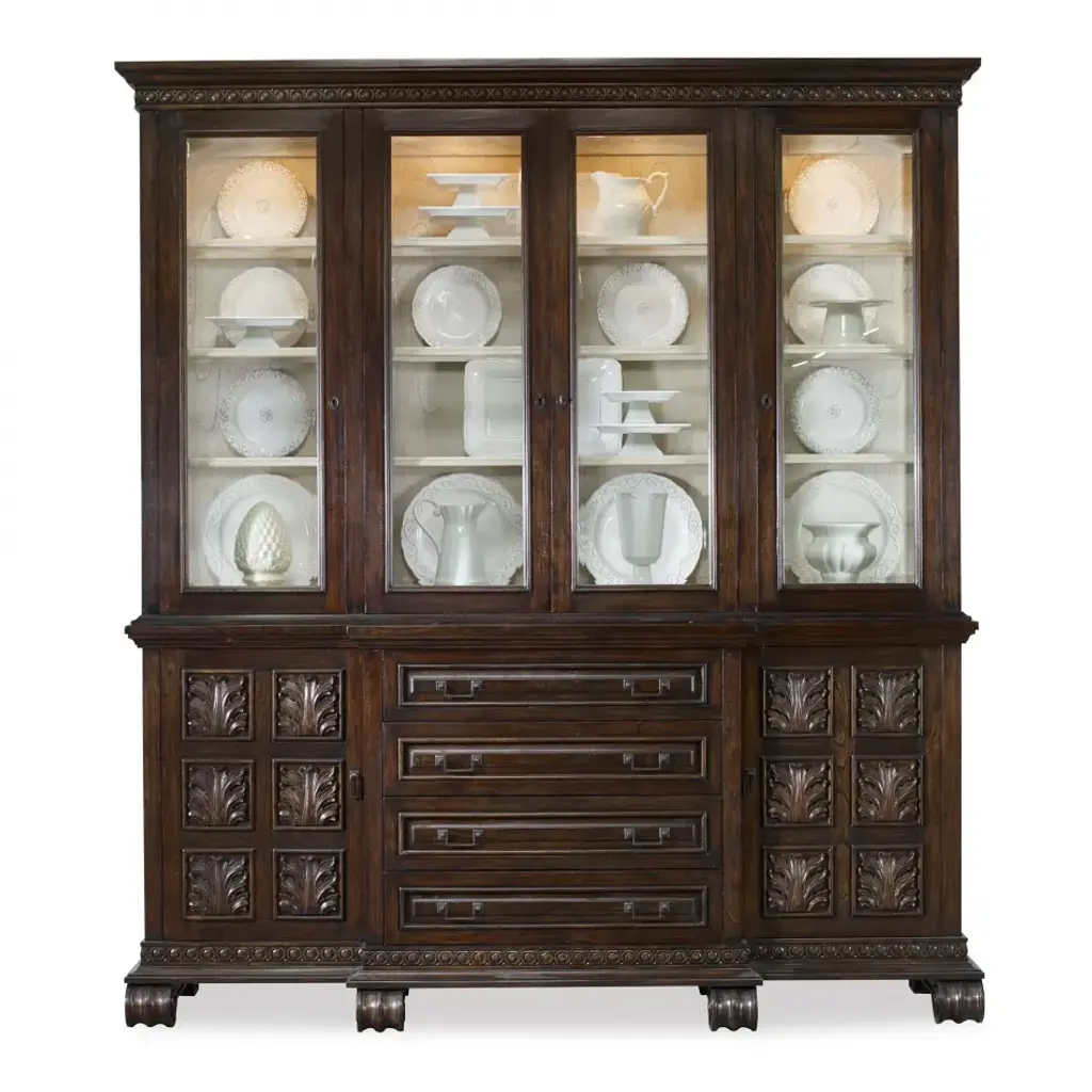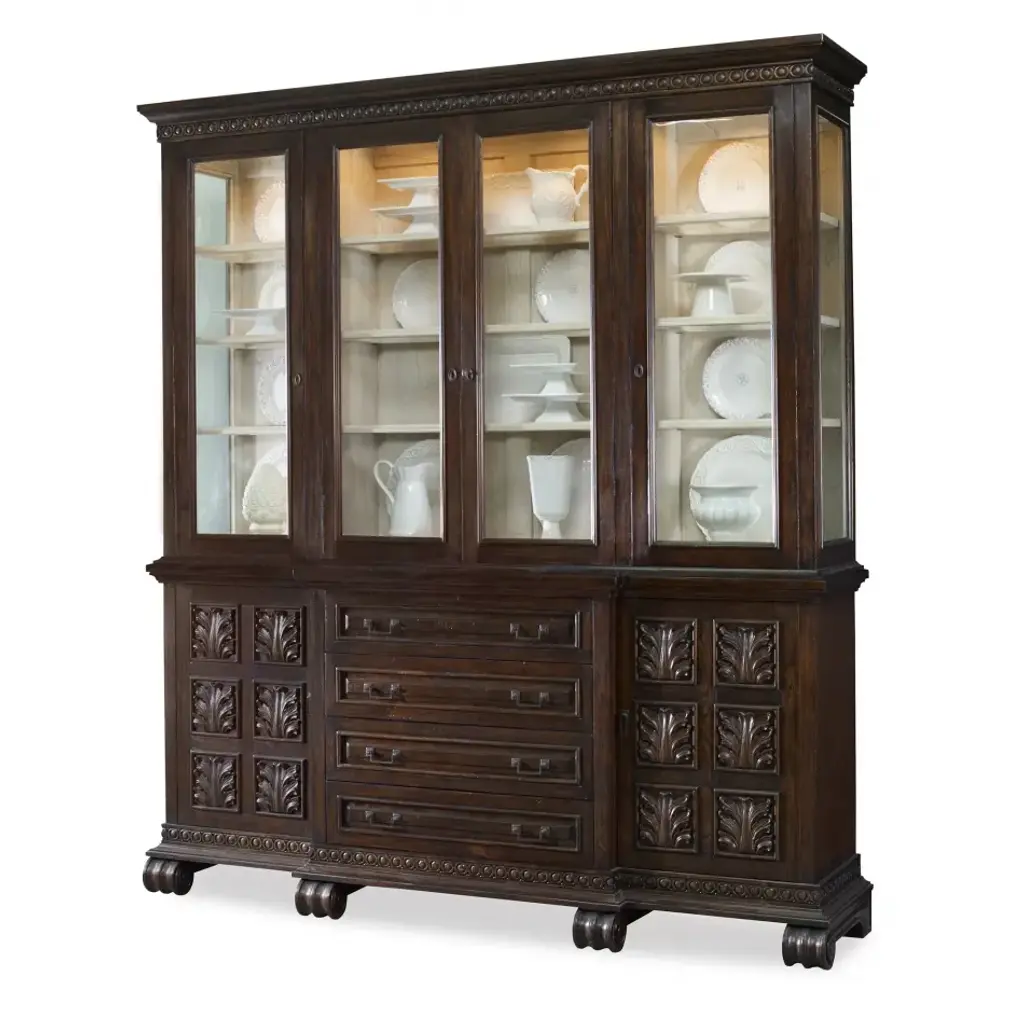 Coordinating with the Castillian Dining Tables, this buffet and hutch are crafted from Mindi solids and veneer. Four glass front doors enclose three adjustable shelves. Touch dimmer lighting is included. The base is comprised of four drawers flanked by two doors hiding adjsutable shelves for storage. The cabinet is rased on carved and scrolling wood feet.