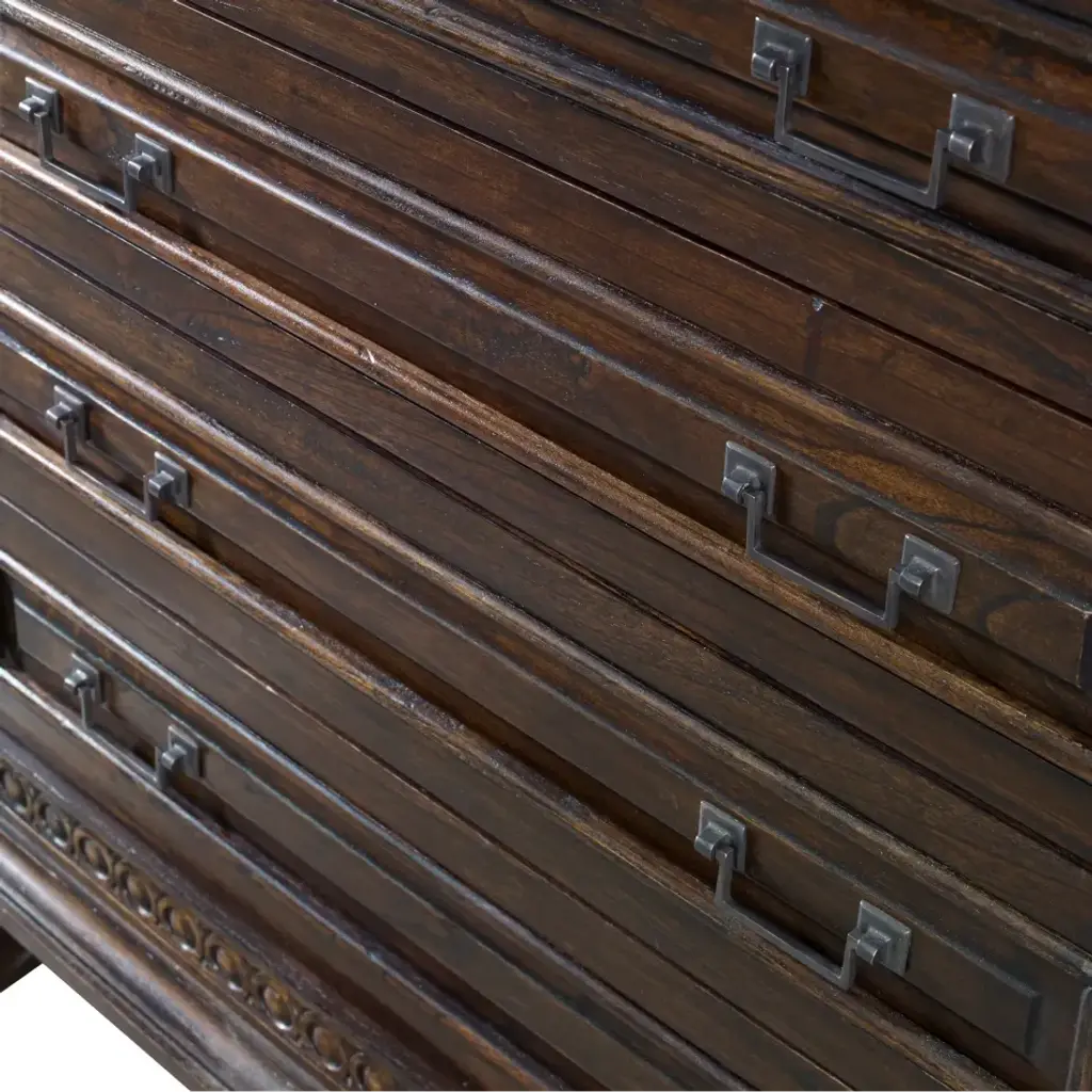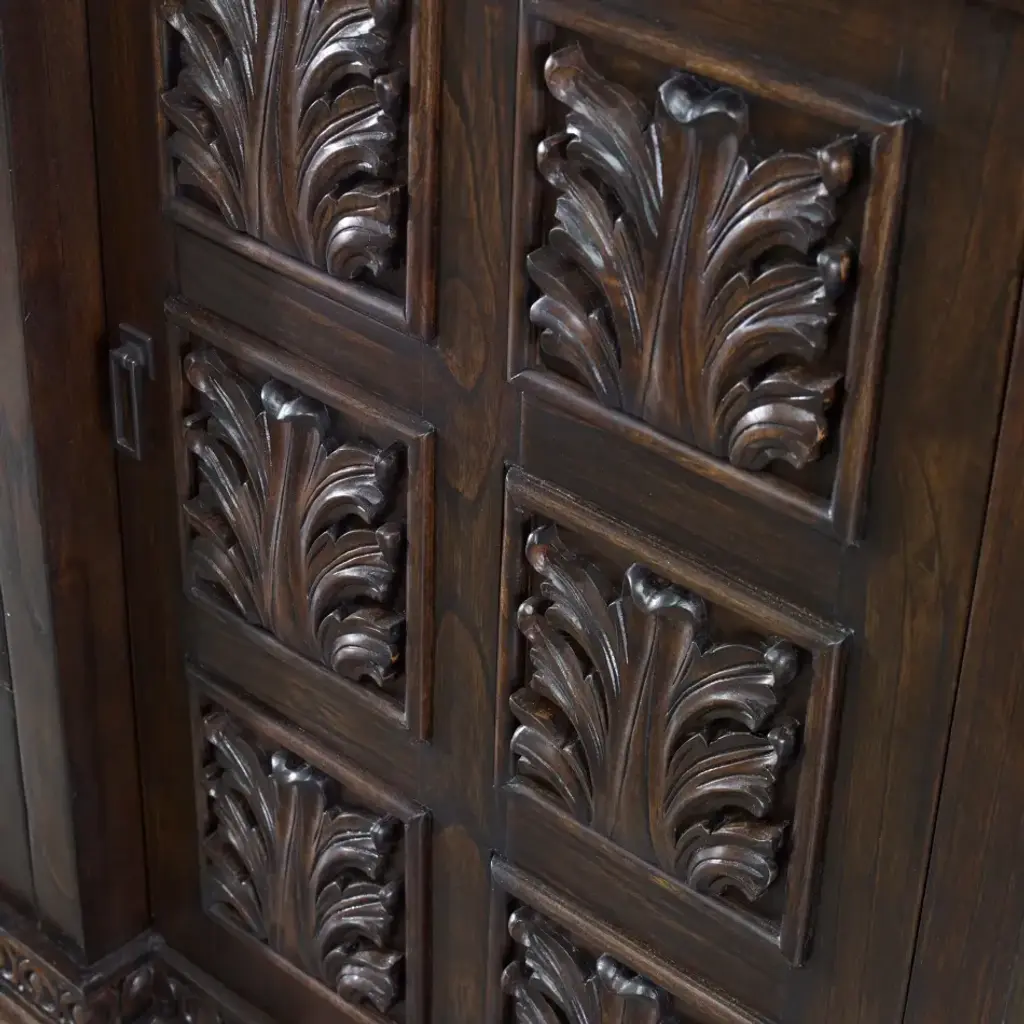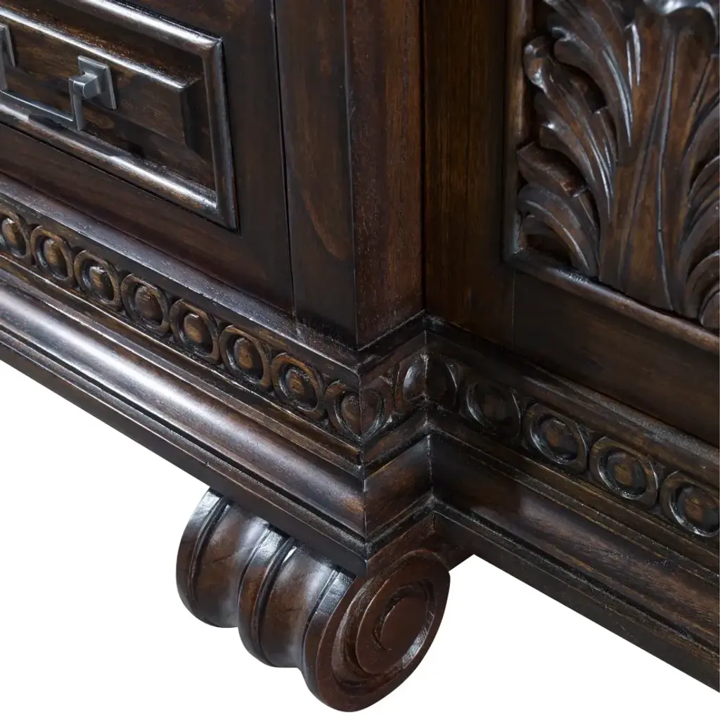 Coordinating with the Castillian Dining Tables, this buffet and hutch are crafted from Mindi solids and veneer. Four glass front doors enclose three adjustable shelves. Touch dimmer lighting is included. The base is comprised of four drawers flanked by two doors hiding adjsutable shelves for storage. The cabinet is rased on carved and scrolling wood feet.