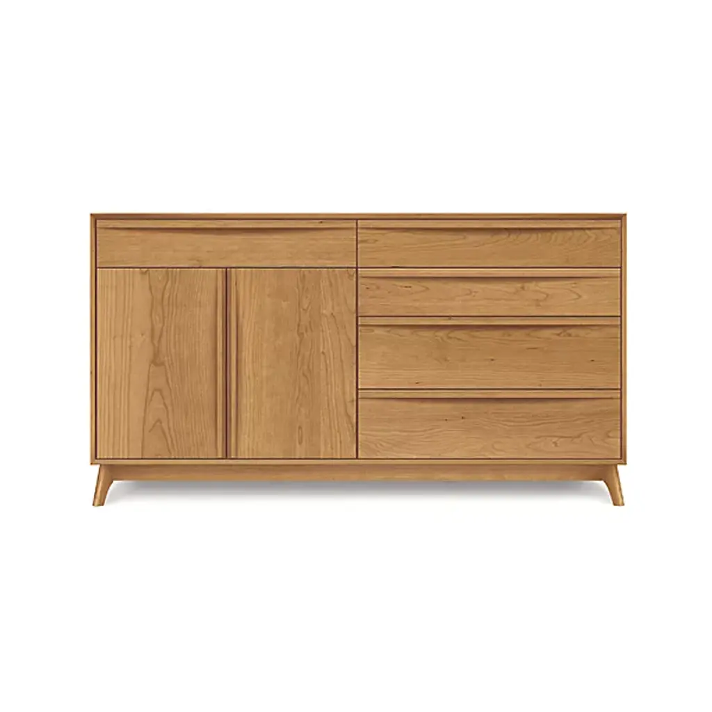 The mid-century inspired Catalina Cherry Five-Drawer/Two-Door Buffer offers plenty of storage for the modern dining room. This modernist buffet is divided with four drawers on one side and 1-drawer over a 2-door cabinet on the other. The drawers and doors feature soft-close hardware and sleek integrated pulls that run the length of each one. The cabinet area offers adjustable shelving while all drawers feature asymmetrical English dovetail joinery and fully finished interiors. Located above the two-door cabinet, a designated drawer provides tarnish-free, separated storage for silverware. Hand-crafted with impeccable quality and attention to detail, this buffet is bound to last through generations of use and enjoyment.