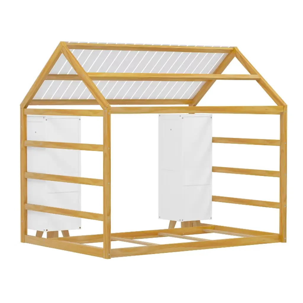 Cavinas Twin Size Childlike House Bed Frame With Storage Cabinets & Fence & Roof,modern Floor Bed For Kids Room,bedroom,natural