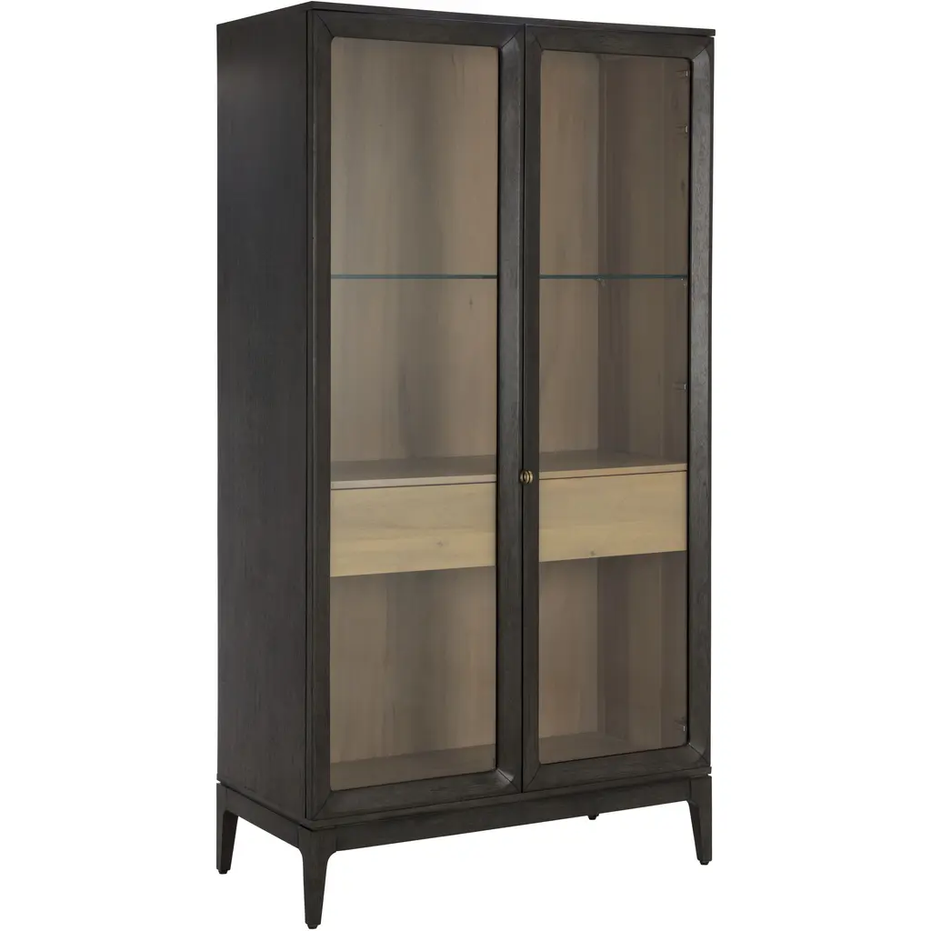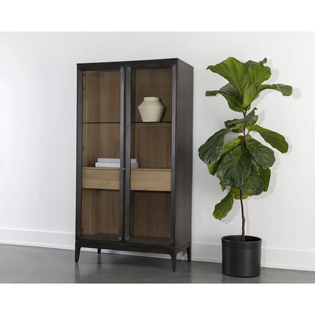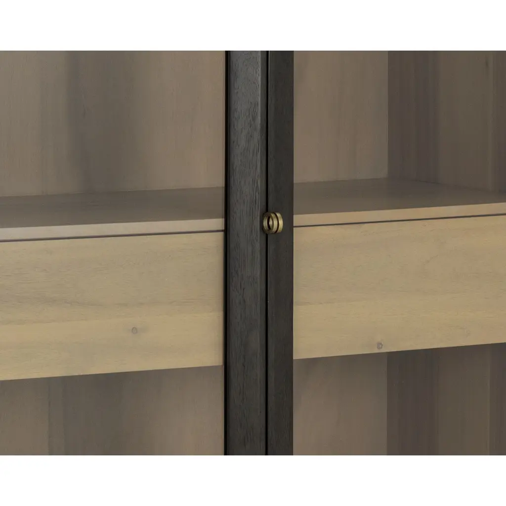 Simple and sophisticated, the Cecilia Display Cabinet features a mid-century design with understated details. Crafted with a smoked grey acacia veneer base and clear tempered glass doors. Solid rubberwood legs and brass handles finish the look. As wood is an organic, porous material, these pieces will contain natural variation of texture and may also exhibit fine indentations and cracks. Wood pieces will also display a disparity of colour and grain, and visible knots and burls that add to the character of each piece.