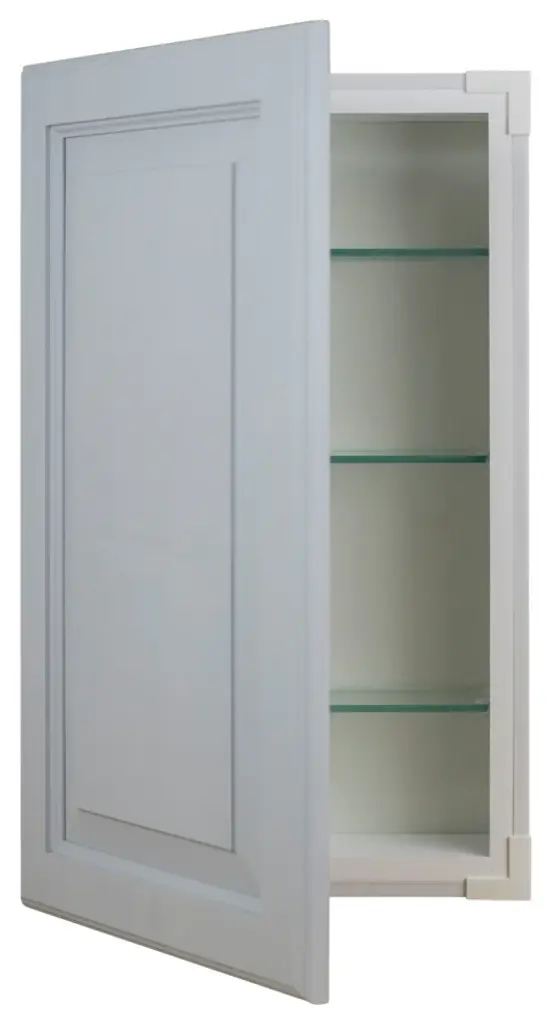 Perfect for any bathroom. Recesses in the wall between the studs, and simply screws to the studs on each side of the opening. Only the door is outside the wall. Fully adjustable glass shelves inside. Our unique, patented design of shelf supports keeps each shelf in place. Concealed hinges with soft close built in assures the door will never slam shut, but softly close on its own instead. Box is SOLID pine and the Raised panel style door is SOLID maple. We''ve painted the inside of the box white, so you don''t have to! Primed door is ready for you to paint it. The box is 3.5" deep inside and gives you plenty of usable depth, but fits in standard 2x4 walls. Cabinet box is 12.5" wide inside. Door is reversible to open either Left or Right. Completely assembled! All you need to do is put one screw in each hinge to mount the door. Then insert it in the wall and screw it to the studs with included screws. If you are replacing a current cabinet, measure your wall opening! White plastic trim surround covers the rough edges of your opening up to 1/2" all around. Door covers the trim surround when closed so the only thing you see outside the wall is the door itself. White plastic trim surround covers the rough edges of your opening up to 1/2" all around. Door covers the trim surround when closed so the only thing you see outside the wall is the door itself. Made in Sarasota, FL.