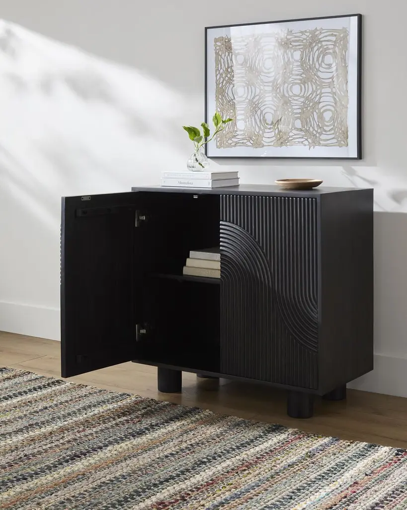 Elevate your living space with the Ceilo Cabinet, a stunning embodiment of minimalist modern design. Crafted from rich mango wood and manufactured in India, this piece radiates both elegance and simplicity. Its sleek lines and understated aesthetic make it a versatile addition to any room, effortlessly complementing a variety of decor styles. Keep it looking pristine by wiping clean with a dry cloth and avoiding harsh cleaners that might damage its exquisite finish. Add the Ceilo Cabinet to your home for an instant touch of sophistication and practicality.