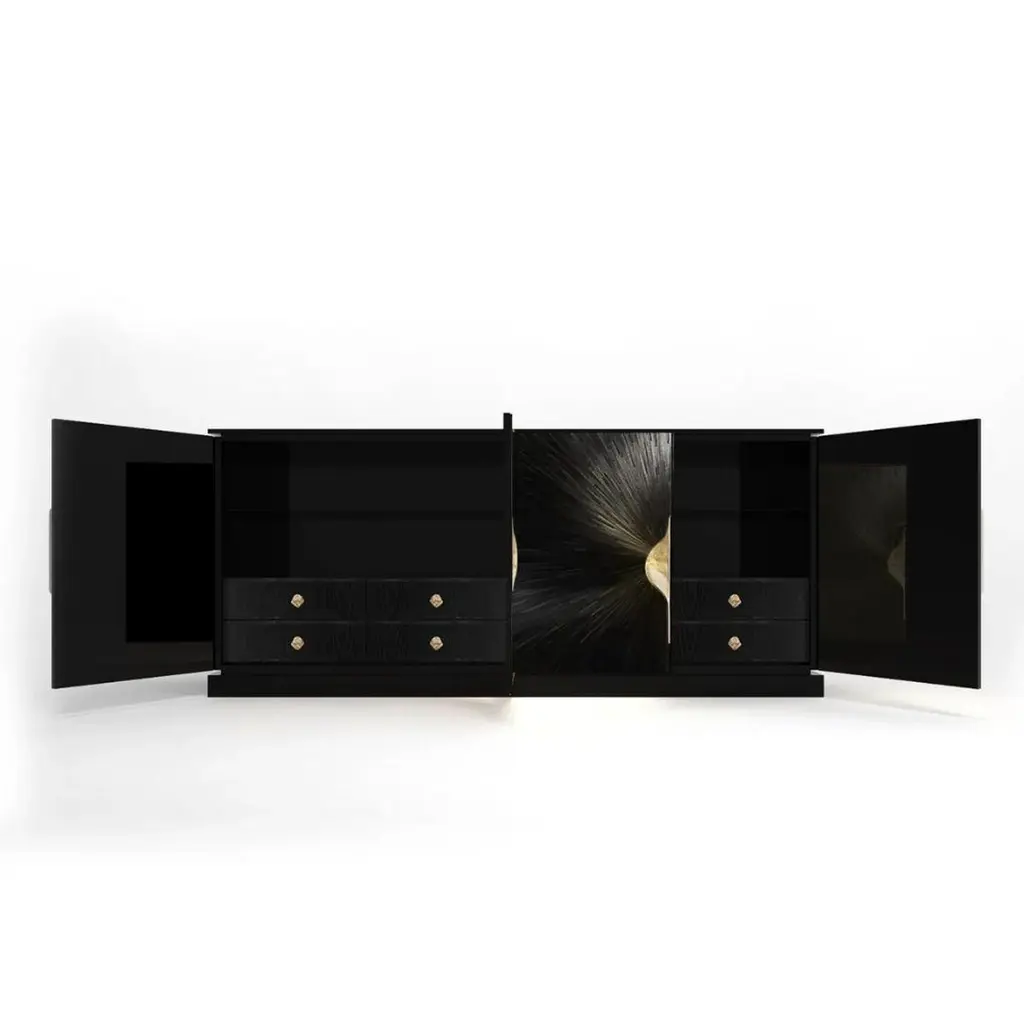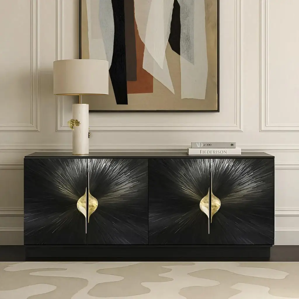 The Celine Straw Cabinet is a refined expression of contemporary artistry and craftsmanship. Its doors feature intricate straw marquetry in a radiant sunburst pattern, brought to life with gracefully curved cast brass handles. Bold yet timeless, the Celine Cabinet effortlessly merges function with elevated design.As ShownStructure: Straw Marquetry Natural , Straw Marquetry Black and WoodBase and Top: Black Tulip Veneer (Matte Finish)Handle: Cast BrassDoors Interior: Black Tulip Veneer (Matte Finish)Doors Exterior: Straw Marquetry Natural , Straw Marquetry Black and WoodInterior: Black Tulip Veneer (Matte Finish)Shelves: Smoked Glass