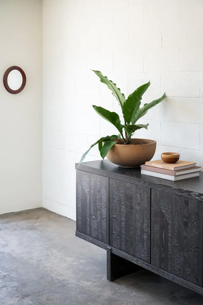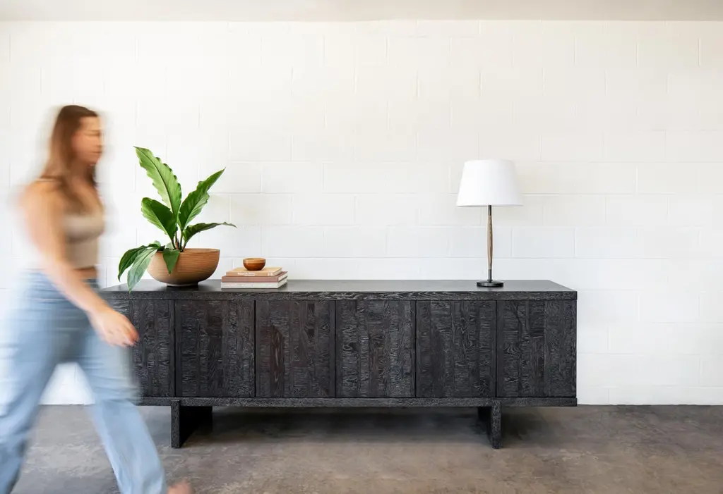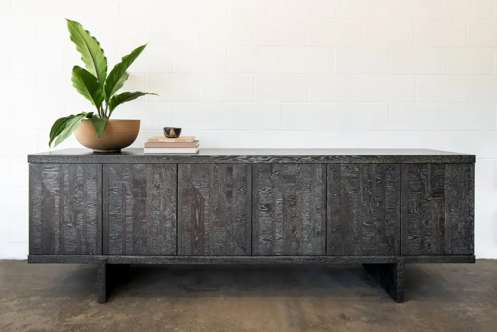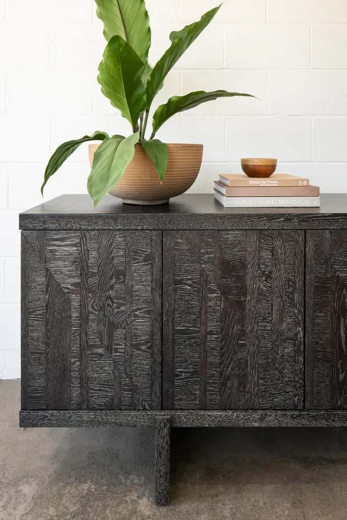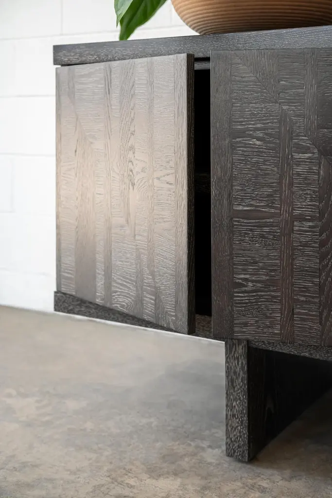 This marquetry cabinet is hand made in the United States and features all-hardwood construction. Characterized by a thick solid wood top, inlaid cabinet doors and slab legs, this decorative cabinet with marquetry is distinguished by its exquisite marquetry pattern. This modern marquetry cabinet would suite a more transitional design as well as a contemporary design. Ikat cabinet by Lynnea JeanCreativity often begins with exploration. The Ikat Cabinet motif started as a photograph—then evolved into a painting, a rug design, and finally, a study in wood marquetry. Through each iteration, the motif transformed into a modern interpretation of Ikat, a pattern rooted in the rich textile traditions of Indonesia and first introduced to European design in the early 1900s.Exploring texture through form, the cabinet is finished in a warm chocolate hue, making it a striking yet grounded addition to your design. It stands as a testament to the creative process itself—a reflection of curiosity, evolution, and the beauty of following an idea across mediums.