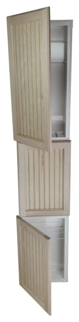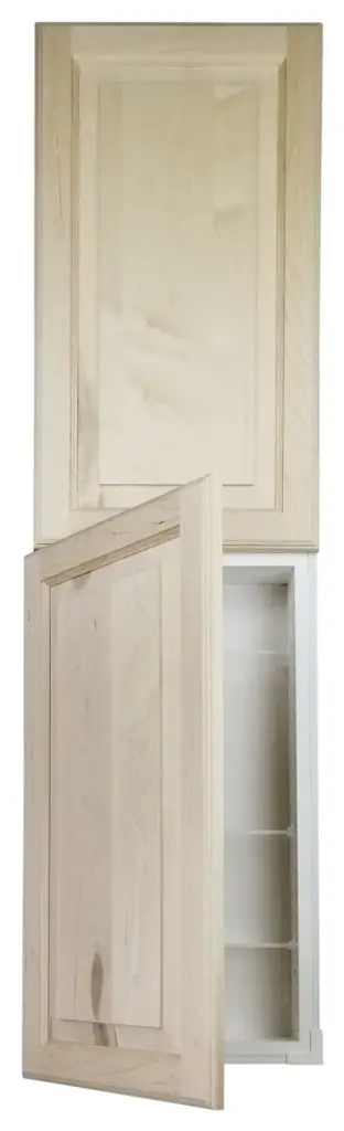 Perfect for any bathroom. Recesses in the wall between the studs, and simply screws to the studs on each side of the opening. Only the doors are outside the wall. Fully adjustable glass shelves inside. Our unique, patented design of shelf supports keeps each shelf in place. Concealed hinges with soft close built in assures the door will never slam shut, but softly close on its own instead. Box is SOLID pine and the Beadboard panel style door is SOLID maple. We''ve painted the inside of the box white, so you don''t have to! Unfinished doors can be painted or stained. The box is 3.5" deep inside and gives you plenty of usable depth, but fits in standard 2x4 walls. This model has THREE doors which open to reveal two separate cabinet sections. Cabinet box is 12.5" wide inside. Doors are reversible to open either Left or Right. Completely assembled! All you need to do is put one screw in each hinge to mount the door. Then insert it in the wall and screw it to the studs with included screws. If you are replacing a current cabinet, measure your wall opening! White plastic trim surround covers the rough edges of your opening up to 1/2" all around. Doors cover the trim surround when closed so the only thing you see outside the wall is the door itself. Made in USA.
