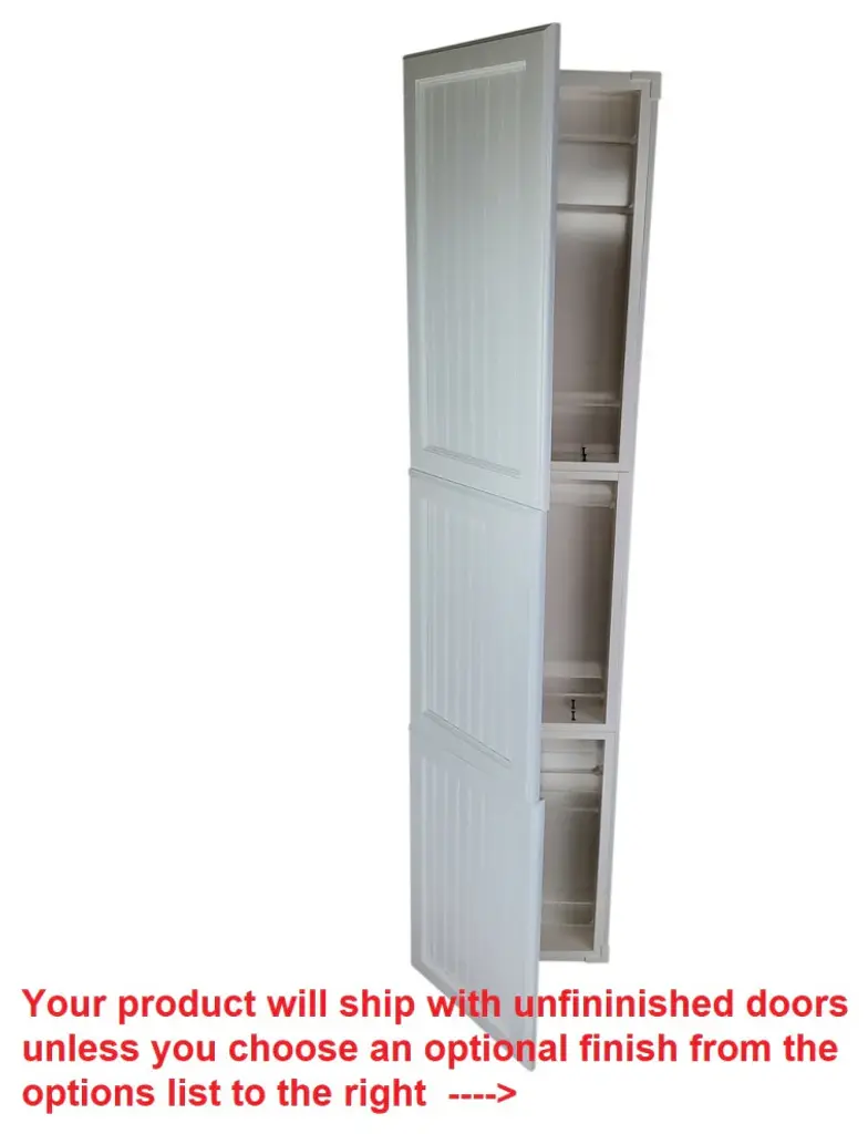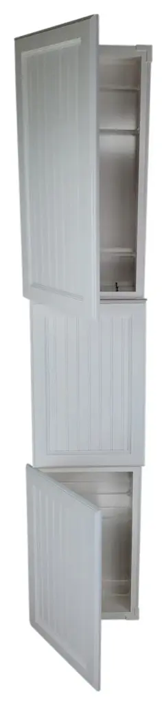 Perfect for any bathroom. Recesses in the wall between the studs, and simply screws to the studs on each side of the opening. Only the doors are outside the wall. Fully adjustable glass shelves inside. Our unique, patented design of shelf supports keeps each shelf in place. Concealed hinges with soft close built in assures the door will never slam shut, but softly close on its own instead. Box is SOLID pine and the Beadboard panel style door is SOLID maple. White enamel finish. The box is 3.5" deep inside and gives you plenty of usable depth, but fits in standard 2x4 walls. This model has THREE doors which open to reveal two separate cabinet sections. Cabinet box is 12.5" wide inside. Doors are reversible to open either Left or Right. Completely assembled! All you need to do is put one screw in each hinge to mount the door. Then insert it in the wall and screw it to the studs with included screws. If you are replacing a current cabinet, measure your wall opening! White plastic trim surround covers the rough edges of your opening up to 1/2" all around. Doors cover the trim surround when closed so the only thing you see outside the wall is the door itself. Made in USA.