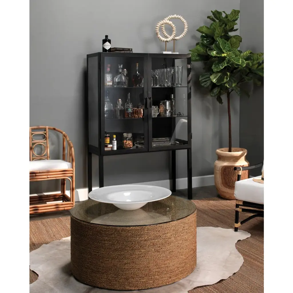 Made from solid oak and mango, unique carving highlights the rich natural graining on this inspired bar cabinet. Foor-to-top cylinder legs, plus plenty of interior storage for barware.