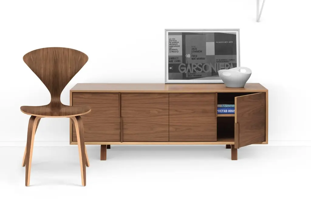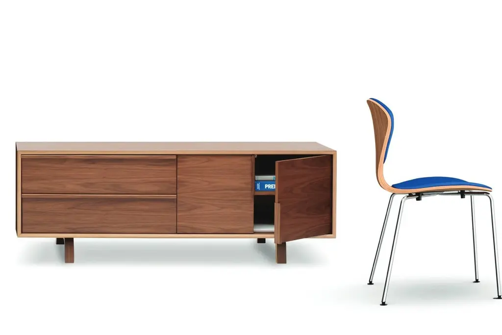 Multiflex casegoods are lightweight, strong and made entirely from laminated, cross-ply and molded plywood. Clear or Classic finish on American Walnut veneers are complimented by the exposed mitered and curved plys of the geometric case and molded plywood pulls and legs. Multiflex is available in a range of unit sizes and storage configurations. Made in the USA.