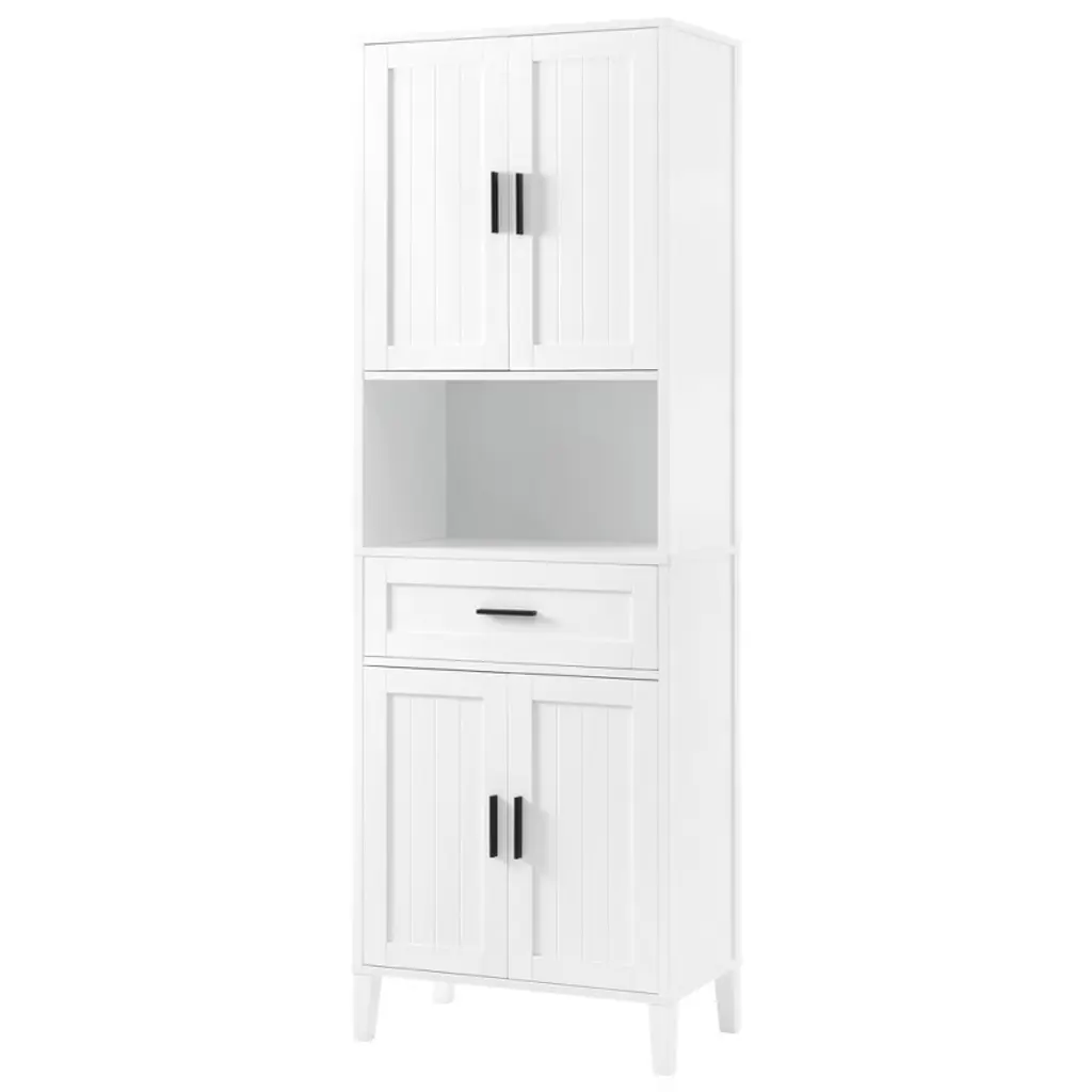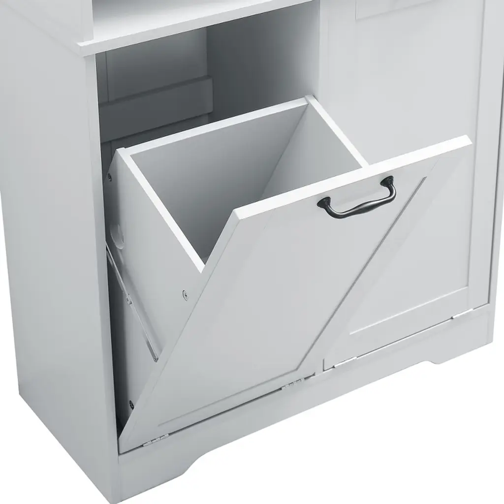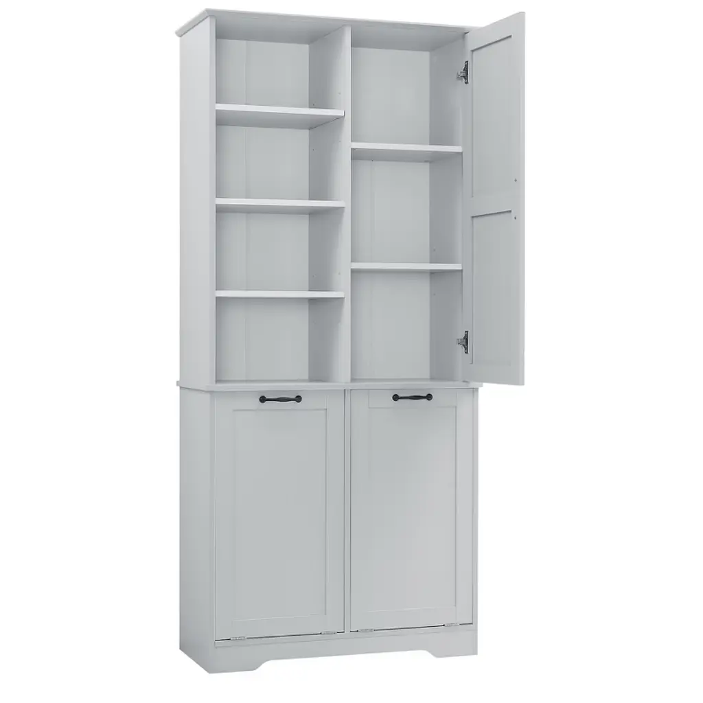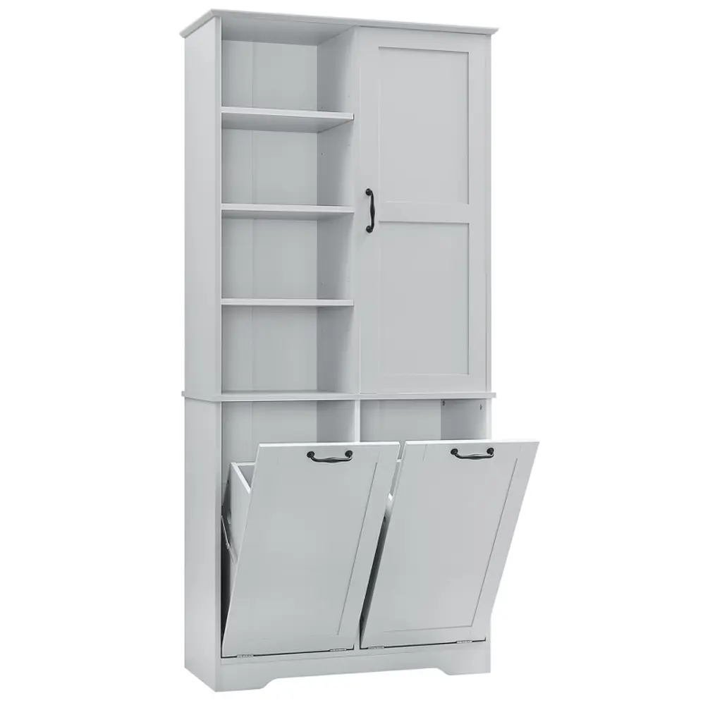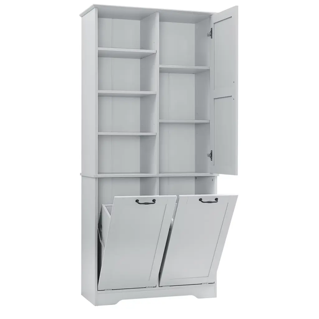 Designed for both style and function, this sleek storage cabinet is crafted from high-quality MDF with a water-proof finish, making it perfect for bathrooms or laundry rooms. Featuring multiple adjustable shelves and dual tilt-out laundry hampers, it offers a smart solution for organizing your daily essentials with ease and elegance.