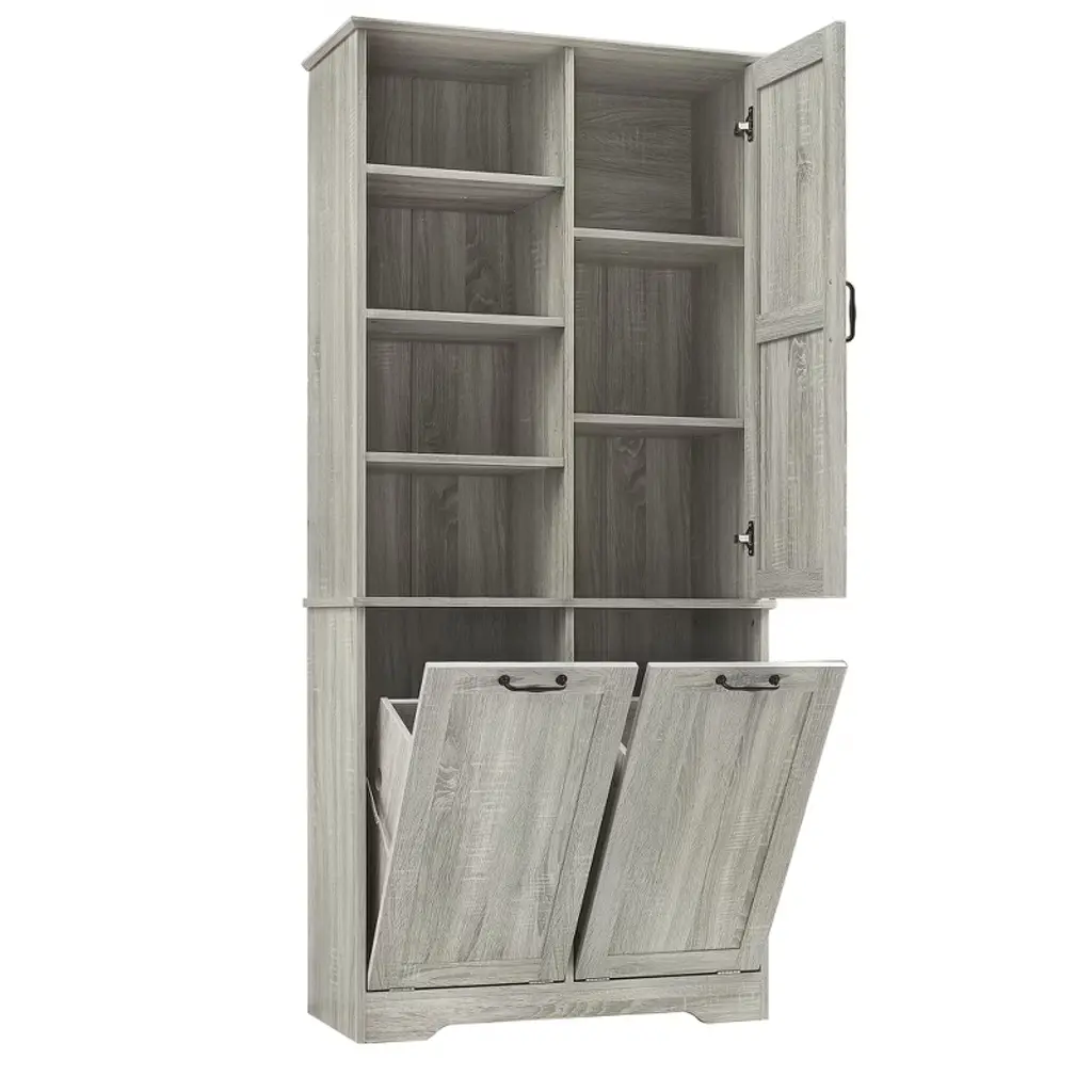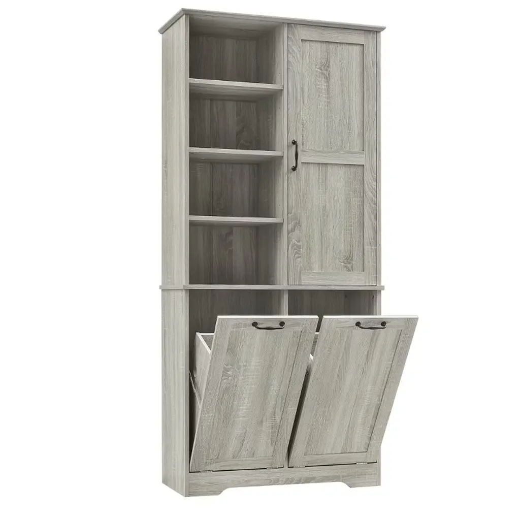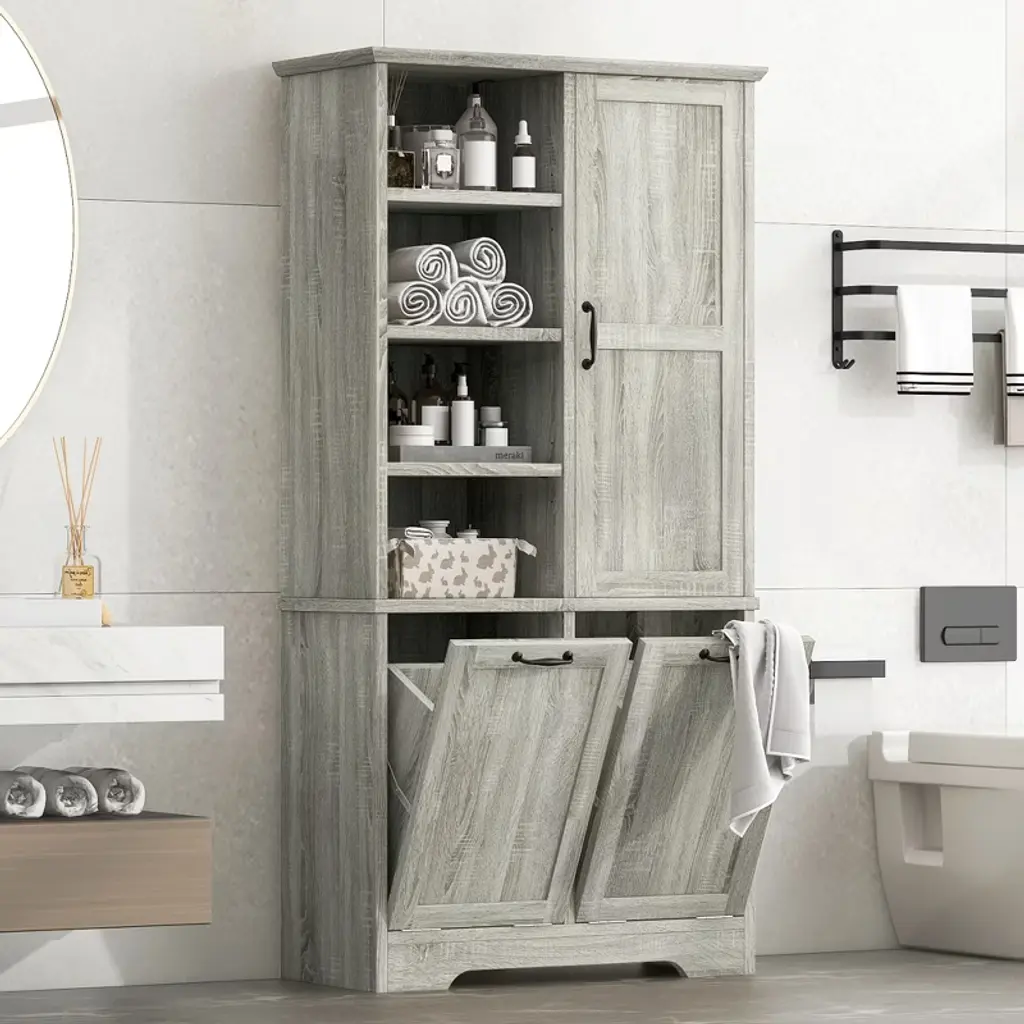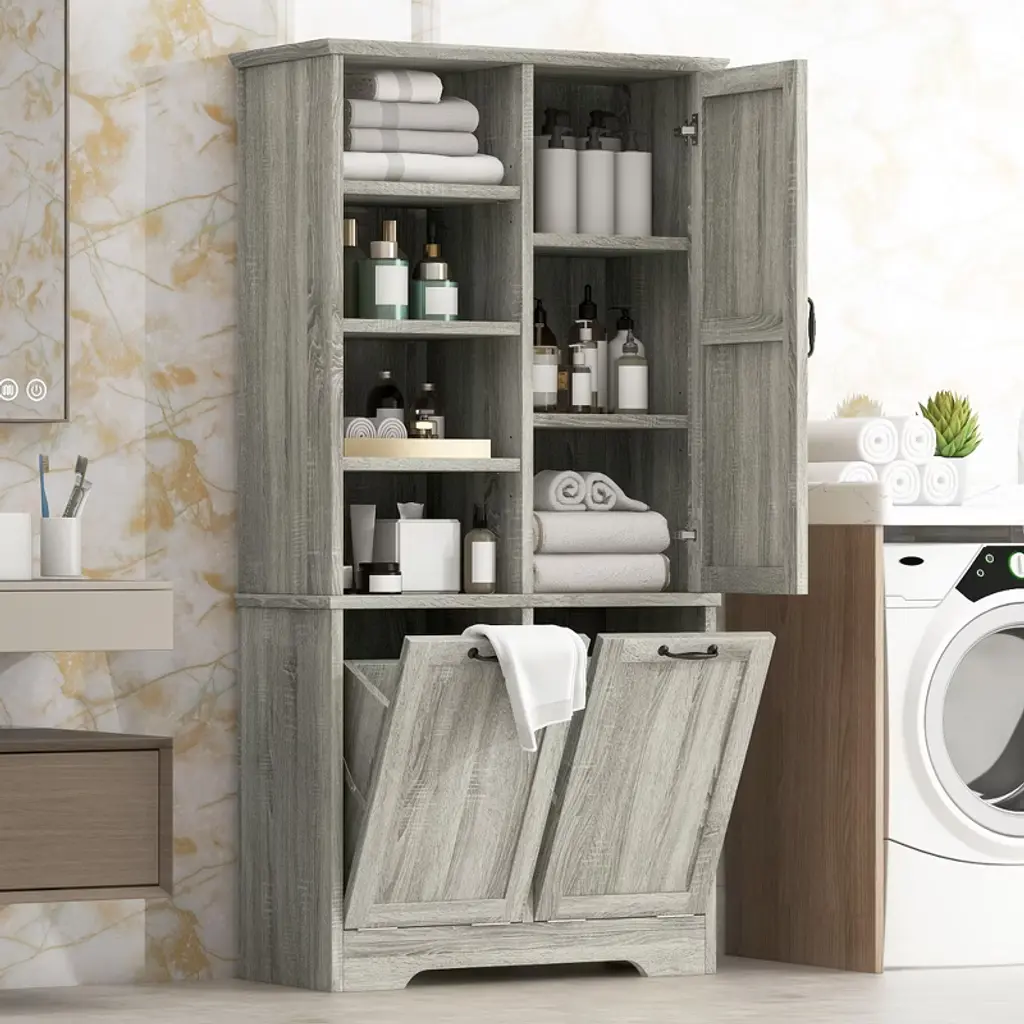 Designed for both style and function, this sleek storage cabinet is crafted from high-quality MDF with a water-proof finish, making it perfect for bathrooms or laundry rooms. Featuring multiple adjustable shelves and dual tilt-out laundry hampers, it offers a smart solution for organizing your daily essentials with ease and elegance.