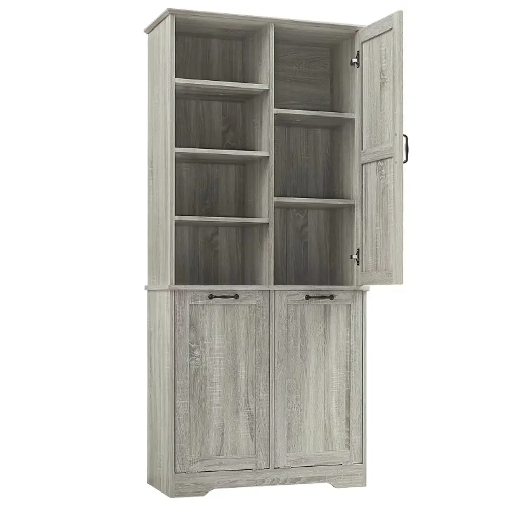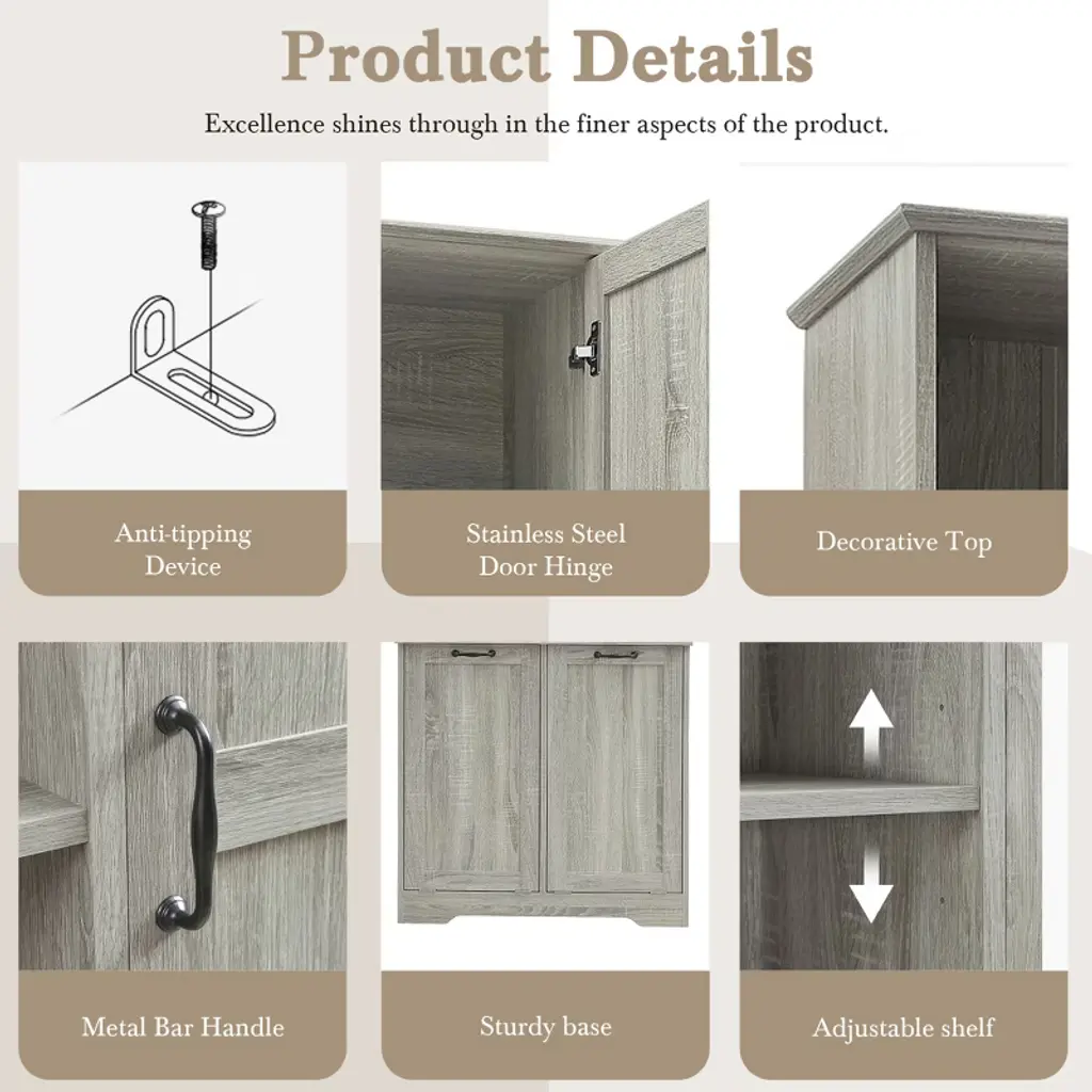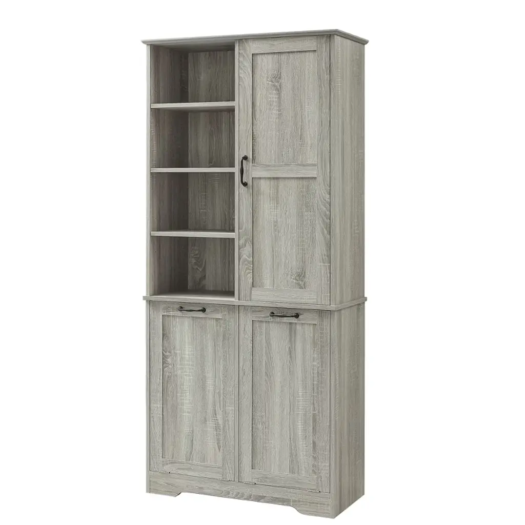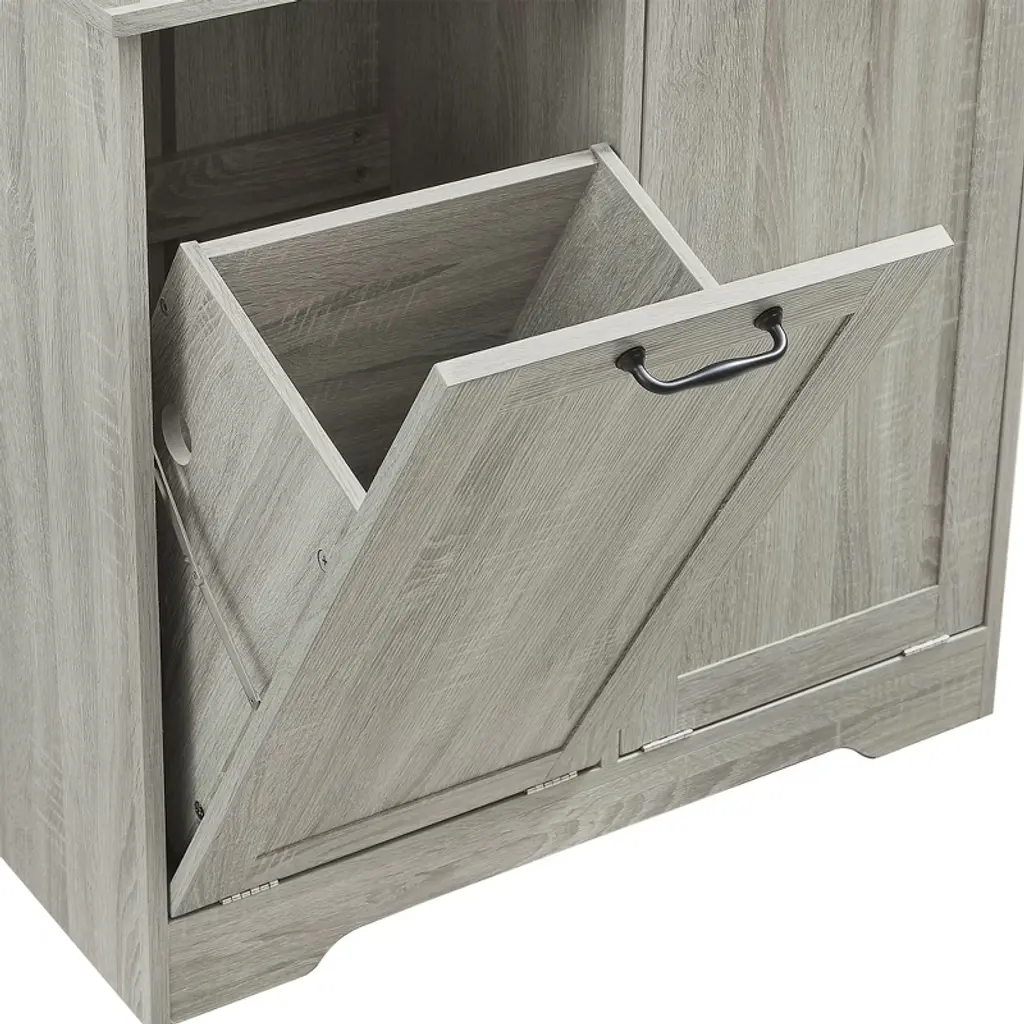Designed for both style and function, this sleek storage cabinet is crafted from high-quality MDF with a water-proof finish, making it perfect for bathrooms or laundry rooms. Featuring multiple adjustable shelves and dual tilt-out laundry hampers, it offers a smart solution for organizing your daily essentials with ease and elegance.