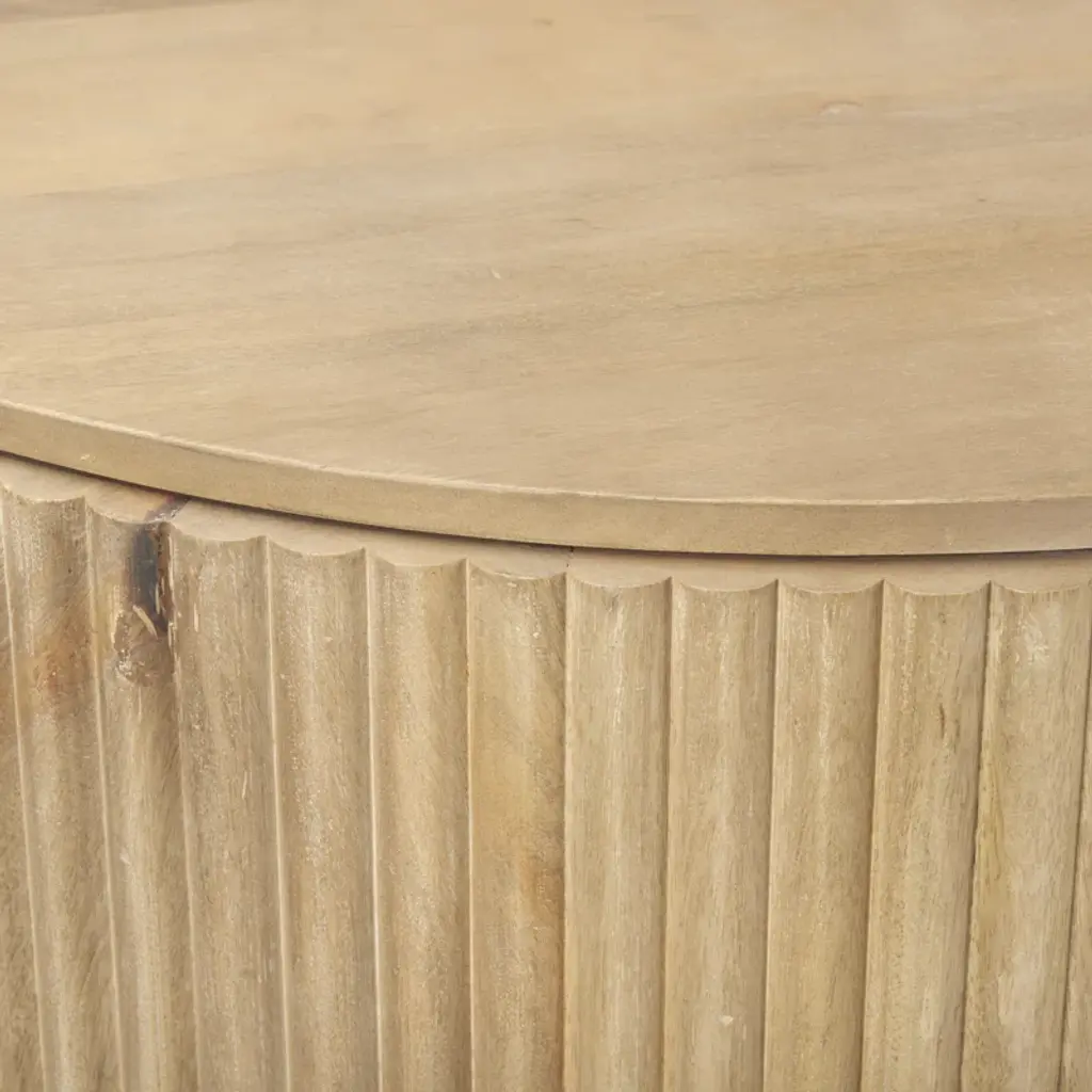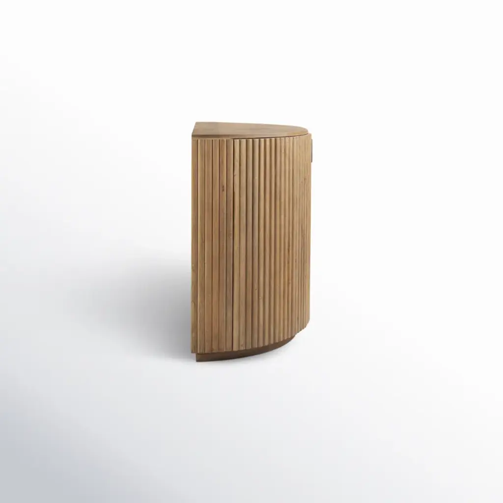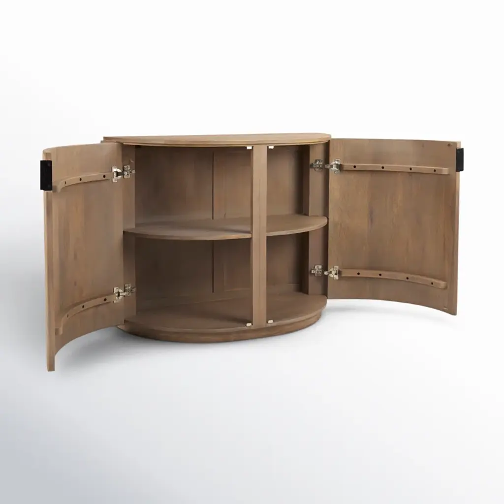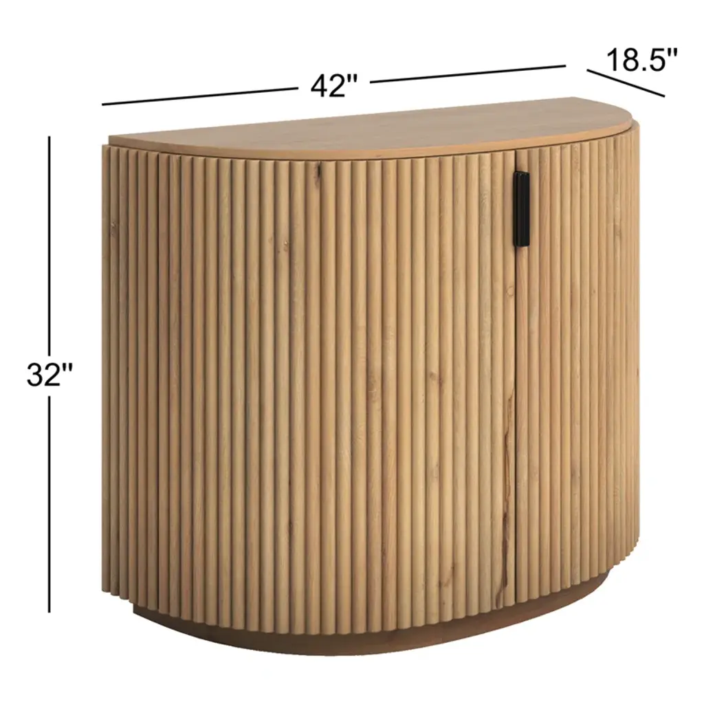 Bold and refined storage for your daily essentials. Our accent cabinet shows off a dynamic demilune silhouette and a rustic finish. The kiln-dried solid wood frame reveals a sandblasted texture, while two fluted doors create even more dimension to the piece. Iron handles offer lots of distinctive contrast while making it easy to access various items.