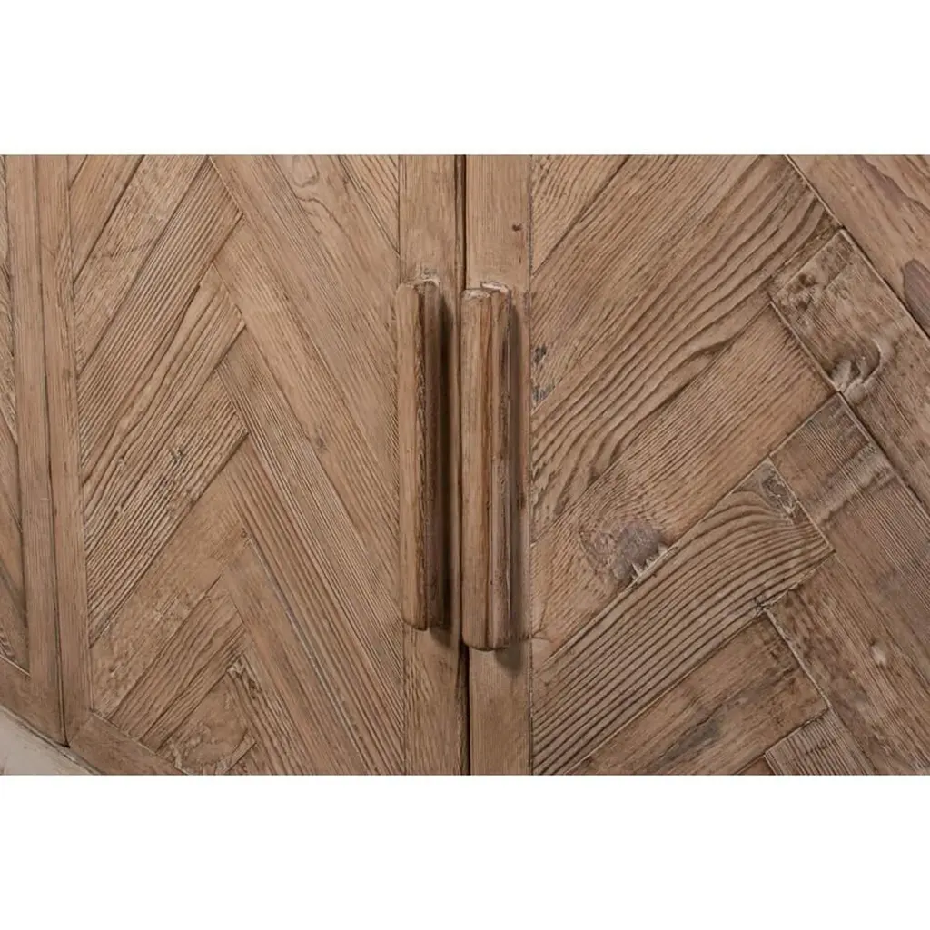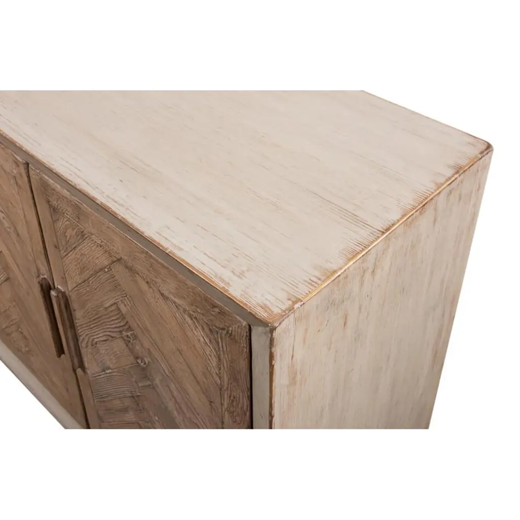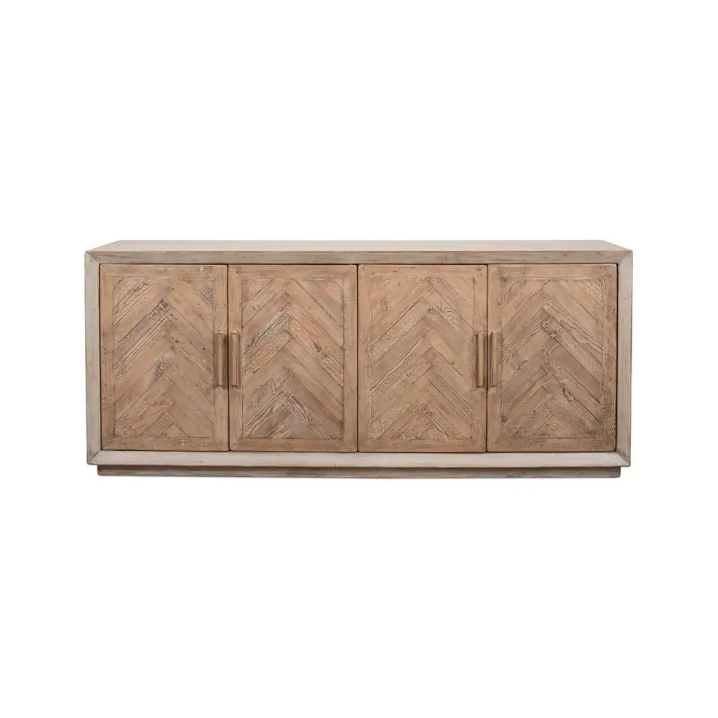 This cabinet showcases the natural allure of reclaimed pine, finished by hand in a nuanced Stone Grey that tells of whispered elegance and earthy charm. Its doors, graced with a chevron pattern, open to a world where your treasures are kept safe and sound.Blending the bold lines of modern geometry with the soulful texture of transitional materials, this cabinet is a testament to master craftsmanship. Perfect for those who seek a touch of rustic warmth with their contemporary decor. Whether gracing your dining room or adding sophistication to your living space, this cabinet makes a statement of sustainable luxury and understated style.Dimensions: 80" W x 19" D x 33" H