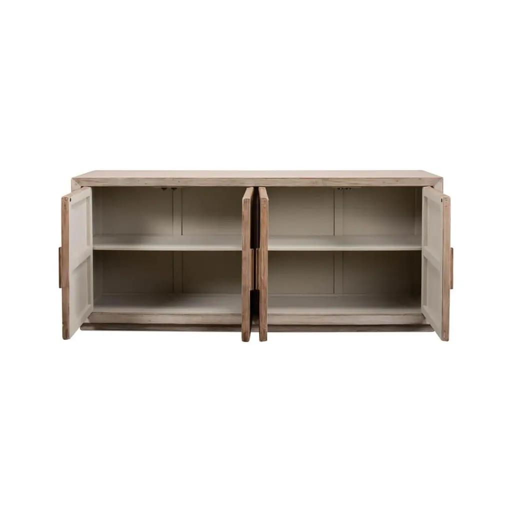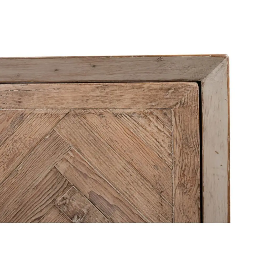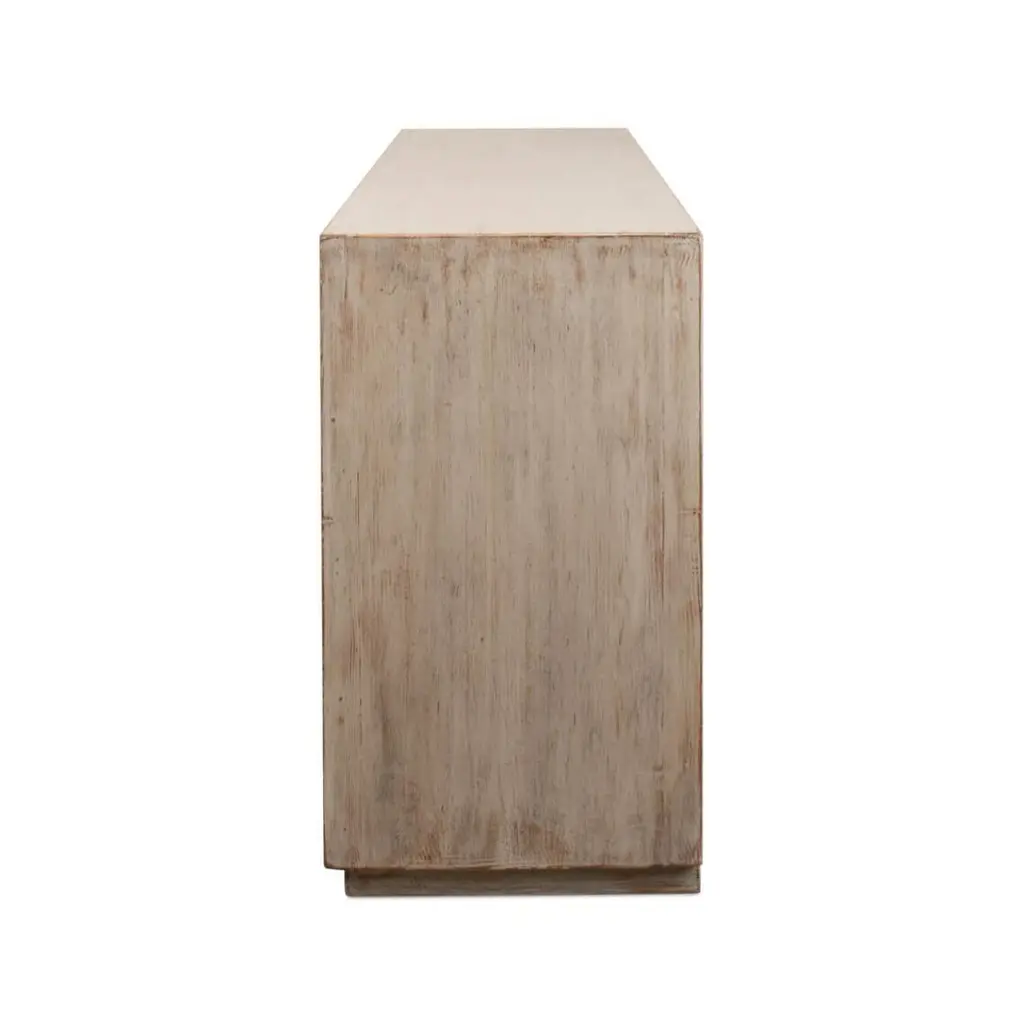 This cabinet showcases the natural allure of reclaimed pine, finished by hand in a nuanced Stone Grey that tells of whispered elegance and earthy charm. Its doors, graced with a chevron pattern, open to a world where your treasures are kept safe and sound.Blending the bold lines of modern geometry with the soulful texture of transitional materials, this cabinet is a testament to master craftsmanship. Perfect for those who seek a touch of rustic warmth with their contemporary decor. Whether gracing your dining room or adding sophistication to your living space, this cabinet makes a statement of sustainable luxury and understated style.Dimensions: 80" W x 19" D x 33" H