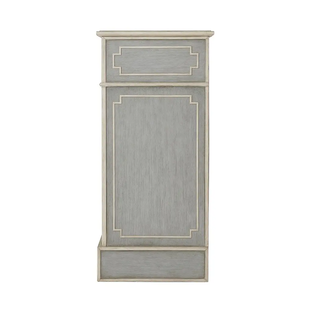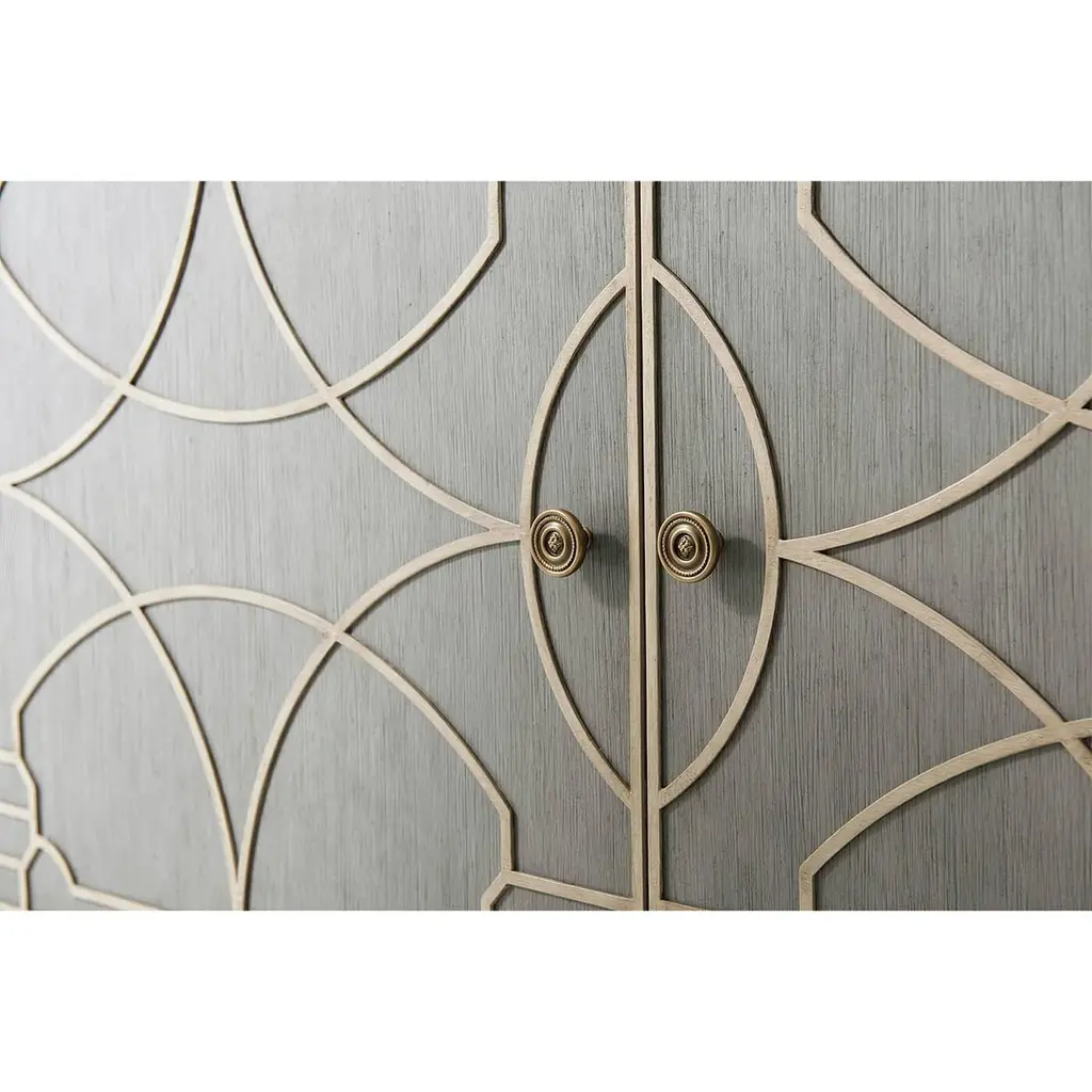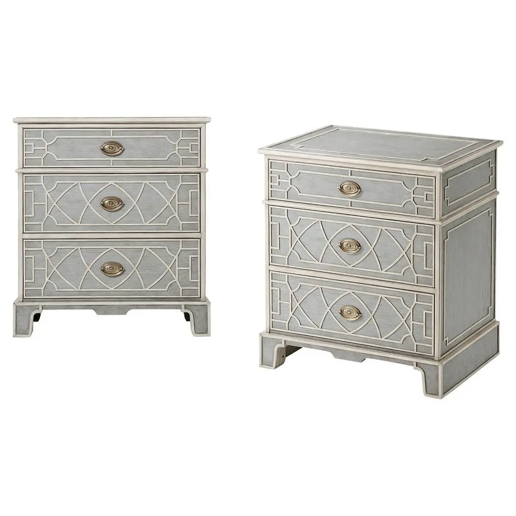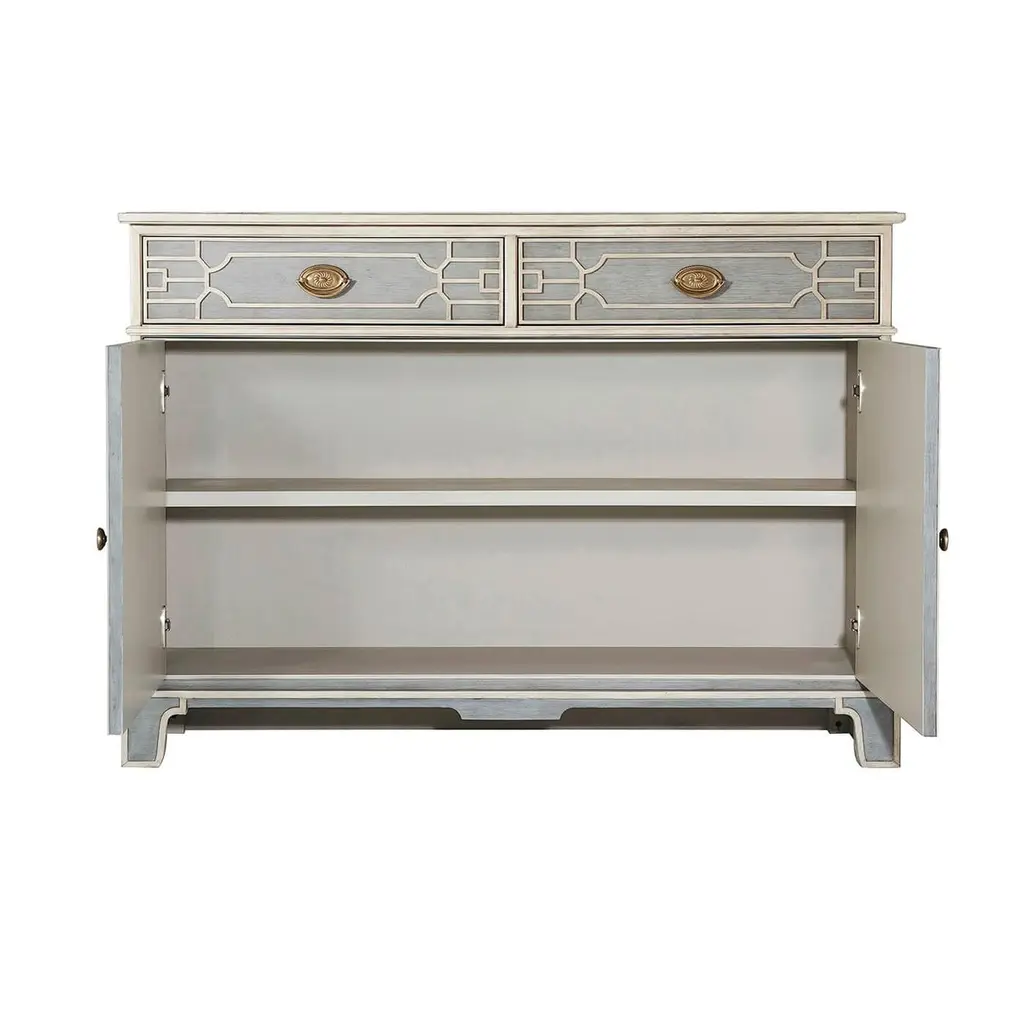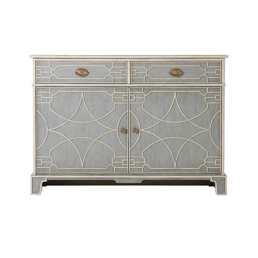 A hand-painted Chinese Chippendale style side cabinet with two blind fret carved frieze drawers with brass pull handles above two cabinet doors enclosing an adjustable shelf and raised on bracket feet.Dimensions: 48" W x 15.75" D x 34" H.