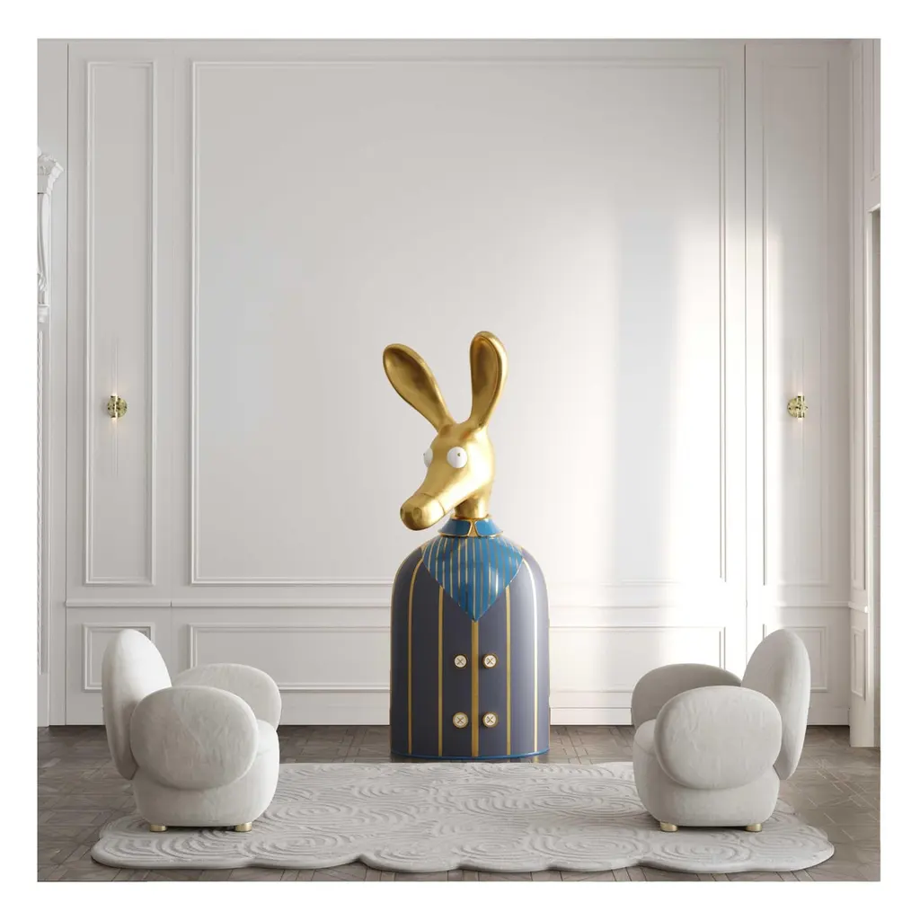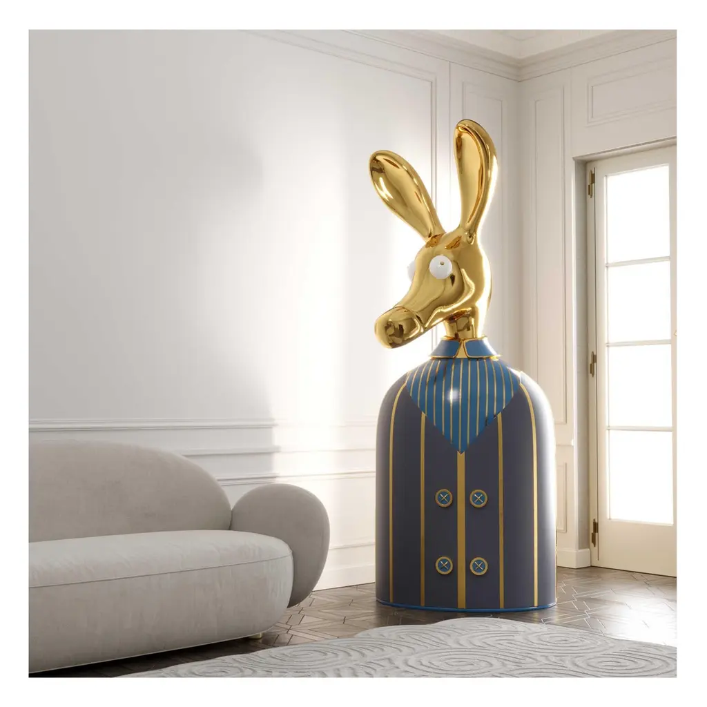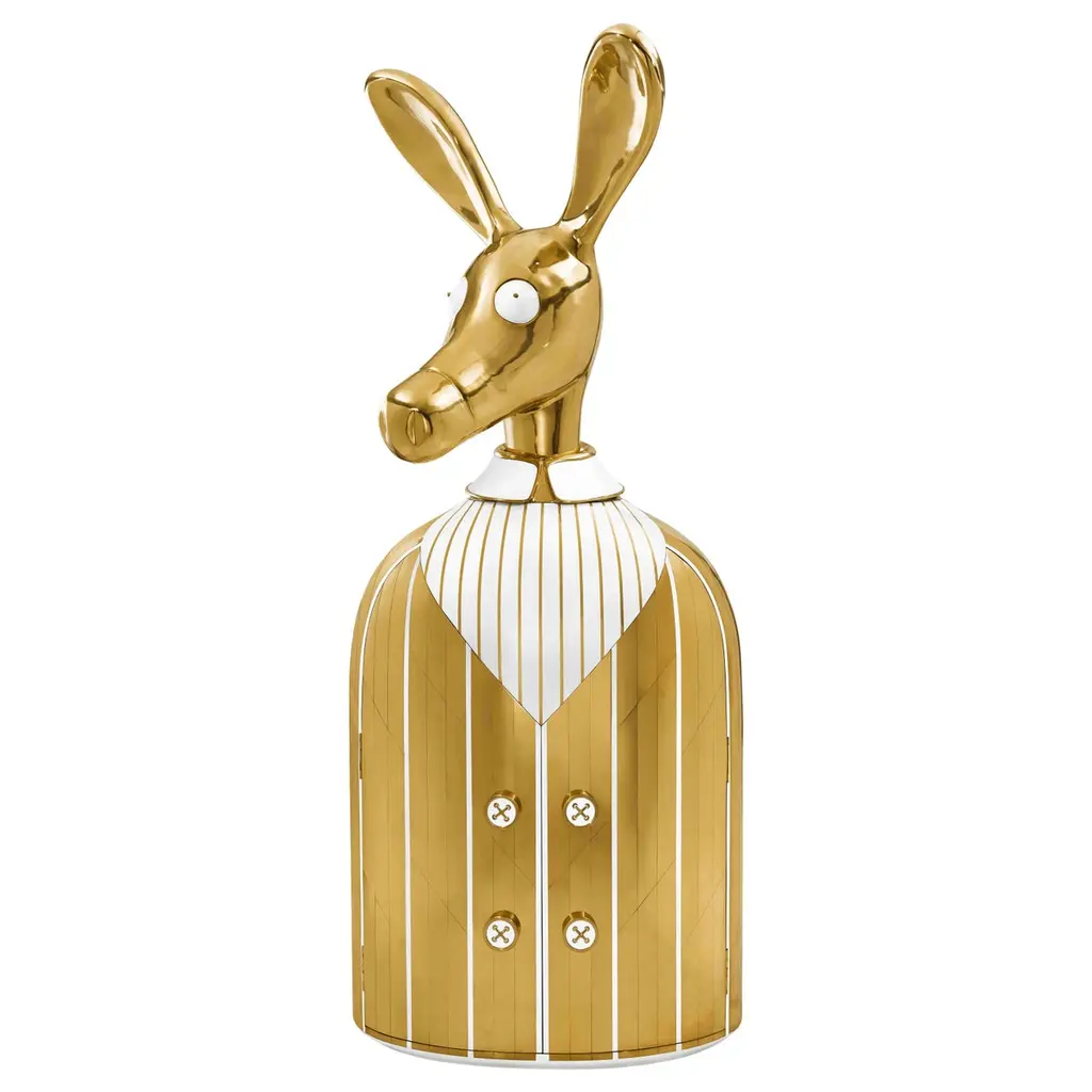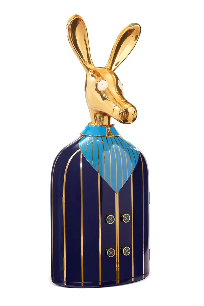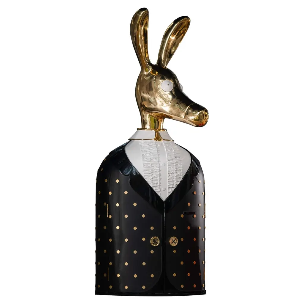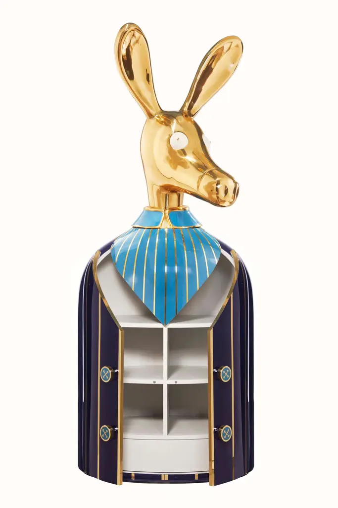 The Ciuco donkey blue bar storage cabinet with brass inlay by Matteo Cibic has a large brass donkey head that sits atop a brass and resin lined blue shirt. The buttons are knobs to open the tuxedo revealing a spacious cabinet within. A sculptural, decadent conversation piece. “Until one has loved an animal, a part of one’s soul remains unawakened.” Pushing the boundaries of shape and form, Matteo’s ANIMAGIC is a celebration of animal forms in andromorphous design. An odd mix of humour, luxury and utility, these pieces go beyond being furniture - they are magical, sculptural objects, almost life like, that make you smile every time you glance at them. Scarlet Splendour brings to you Matteo Cibic’s ANIMAGIC, an odd collaboration of humour and luxury, handcrafted in animal forms.Care: Wipe gently with dry soft cloth. Liquid spillage must be wiped without delay. A premium wax maybe used occassionally to refresh the high gloss.Celebration of Authenticity: Slight variations or imperfections are the marks of an artisan, a testament to the individuality, emotion and originality of each work of art. We assert our right to make meaningful qualitative changes.Please note: Prices do not include VAT. VAT may be applied depending on the ship-to location.