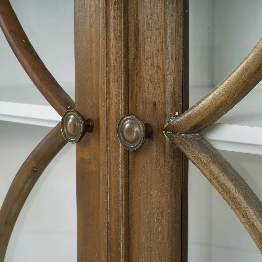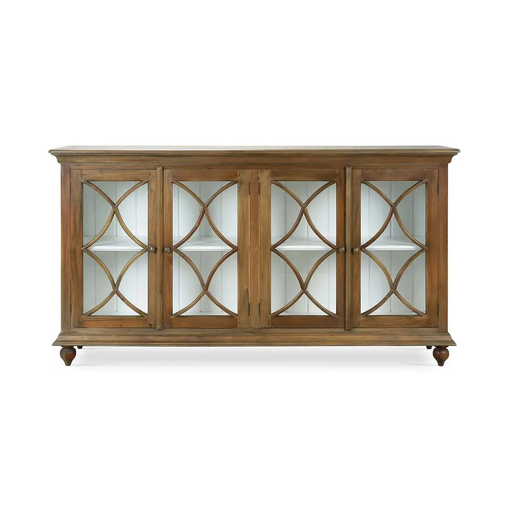 This exquisite piece is masterfully crafted from high-quality mahogany with a lightly distressed finish - the exterior in Straw Wash and the interior in Architectural White.With four doors each with a beautiful X-motif on the glass door frames that provide a sophisticated and stylish appeal. Each door opens to reveal generous storage space, perfect for your dining essentials.Raised on short, turned taupee feet, with a rustic European look and finish, this stunning buffet cabinet not only enhances the aesthetic of your dining area but also offers practical storage solutions. Dimensions: 82" W x 18" D x 44" H