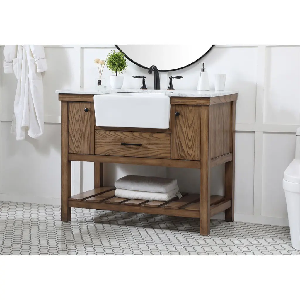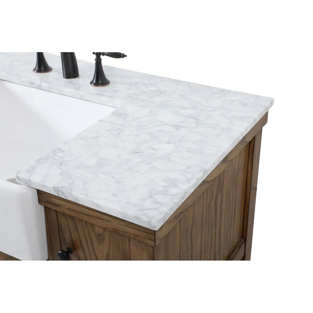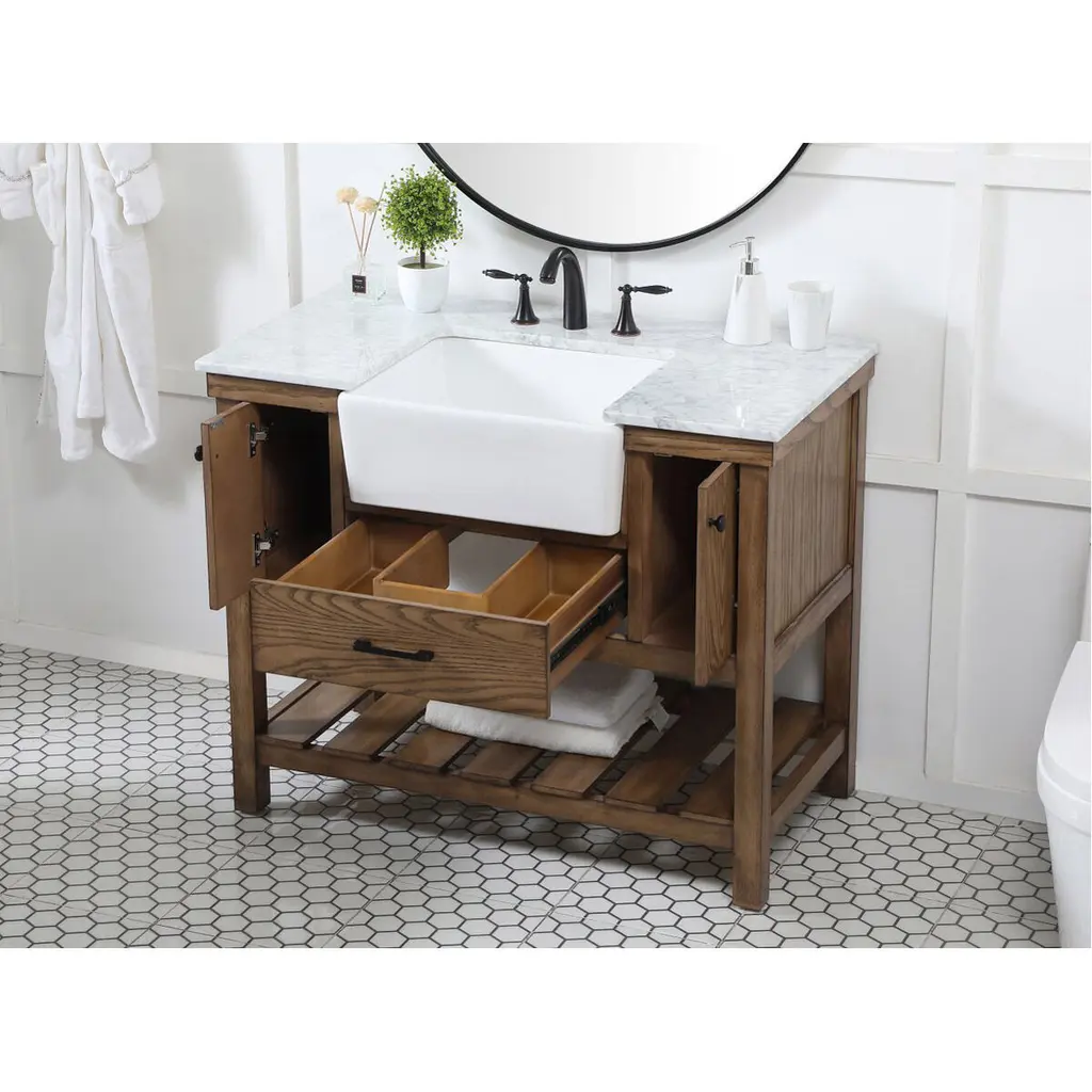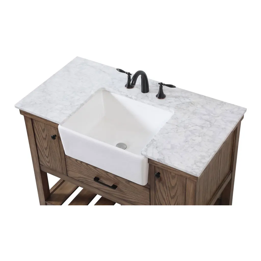 Make the most of your space with this farmhouse style bathroom vanity. Complements well with its beautiful finish, carrara white marble countertop, and the contemporary slender handle bar that sits on the functional drawers with soft closing mechanism, allowing you to store an assortment of bathroom essentials. The lower shelf makes it the perfect space to hold new towels for your guests. This stylish vanity ensures both form and function in your bathroom for you and your guests.