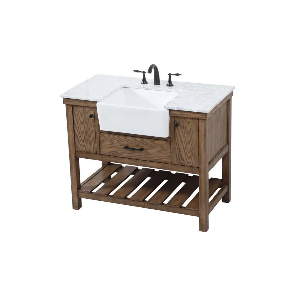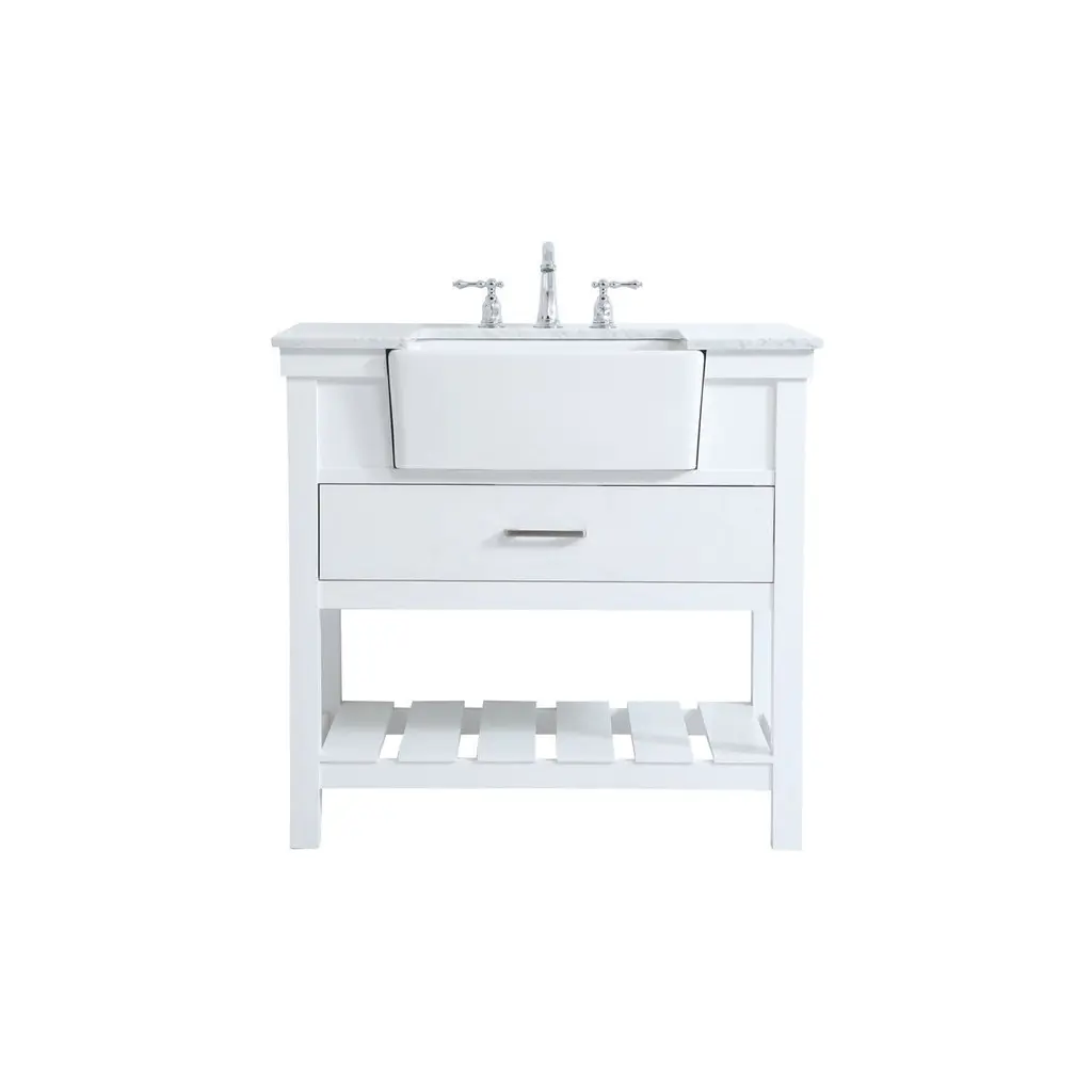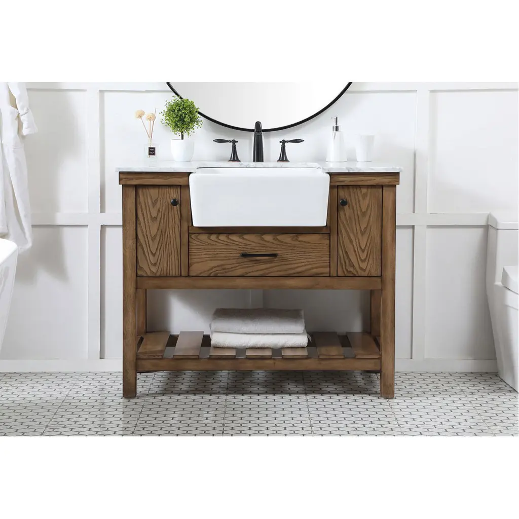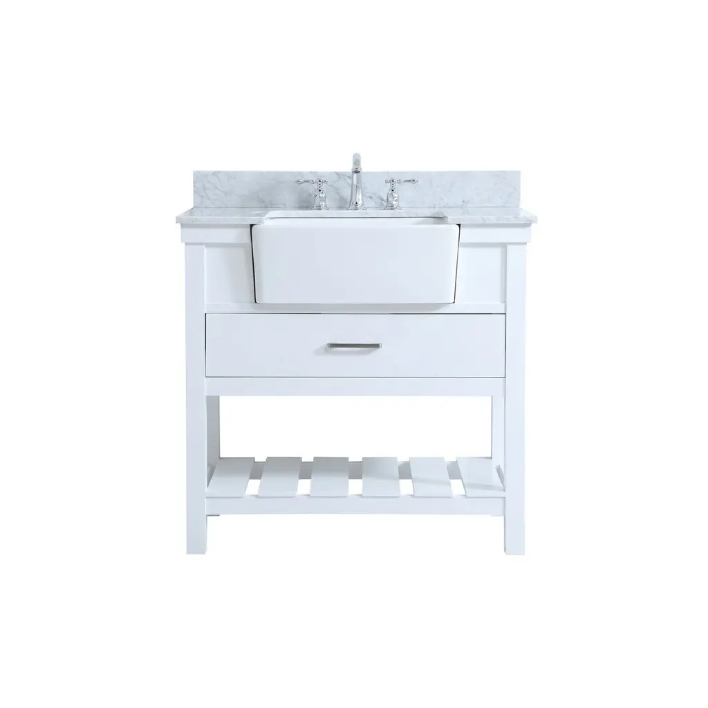 Make the most of your space with this farmhouse style bathroom vanity. Complements well with its beautiful finish, carrara white marble countertop, and the contemporary slender handle bar that sits on the functional drawers with soft closing mechanism, allowing you to store an assortment of bathroom essentials. The lower shelf makes it the perfect space to hold new towels for your guests. This stylish vanity ensures both form and function in your bathroom for you and your guests.
