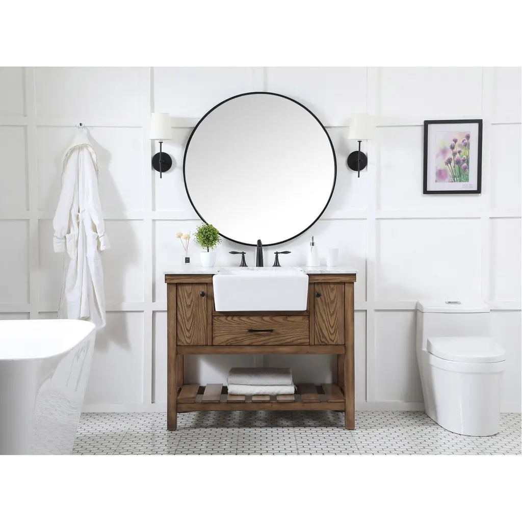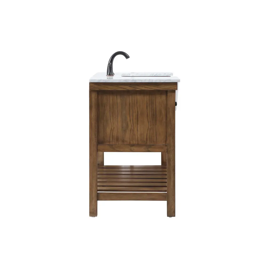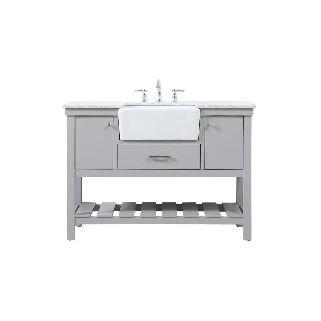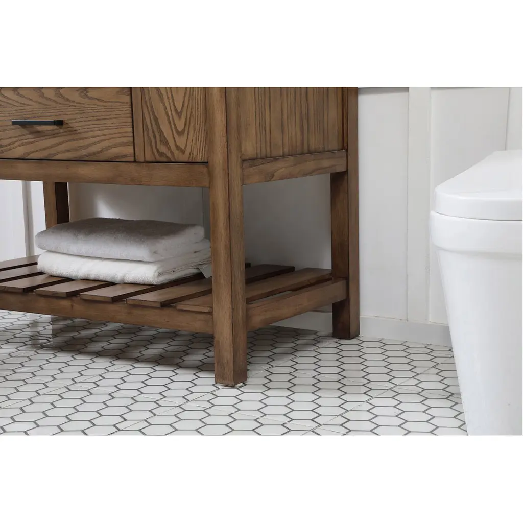 Make the most of your space with this farmhouse style bathroom vanity. Complements well with its beautiful finish, carrara white marble countertop, and the contemporary slender handle bar that sits on the functional drawers with soft closing mechanism, allowing you to store an assortment of bathroom essentials. The lower shelf makes it the perfect space to hold new towels for your guests. This stylish vanity ensures both form and function in your bathroom for you and your guests.