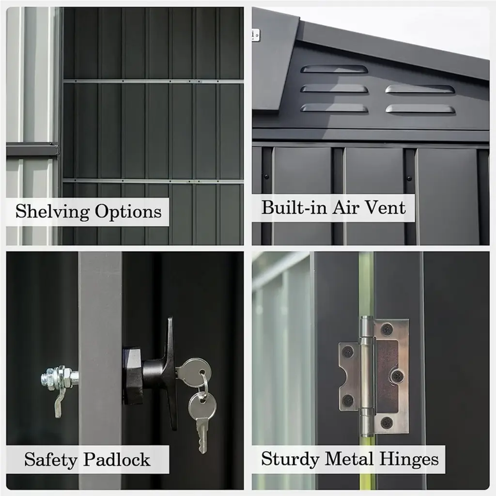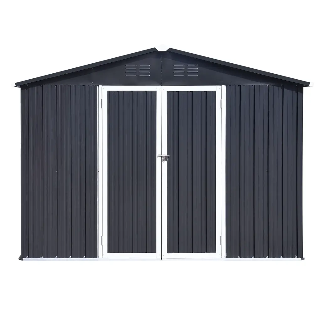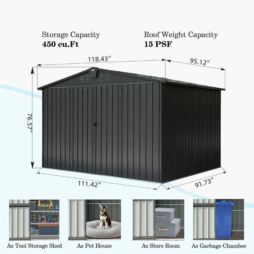 Maximize your outdoor space with this 450 cu.ft. metal storage shed. Built from rustproof galvanized steel, it features a sloped waterproof roof, 32 ventilation vents, and lockable double doors-perfect for safely storing tools, bikes, firewood, or even serving as a pet house.