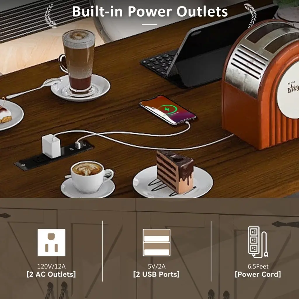 Add rustic charm and modern convenience to your kitchen with this elegant farmhouse-style kitchen island. Featuring a brown wood grain top, black cabinet base, retro metal accents, and a foldable drop leaf, it offers customizable storage with adjustable shelves and drawers. A built-in charging station and rolling wheels with locking options make this piece as functional as it is stylish.