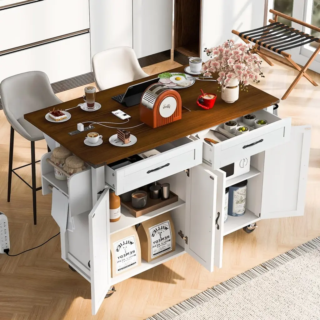 Clihome 53.5" Farmhouse Kitchen Island With Power Outlet, Rolling Kitchen Storage Cart With Drop Leaf, Spice Rack And Drawer, White