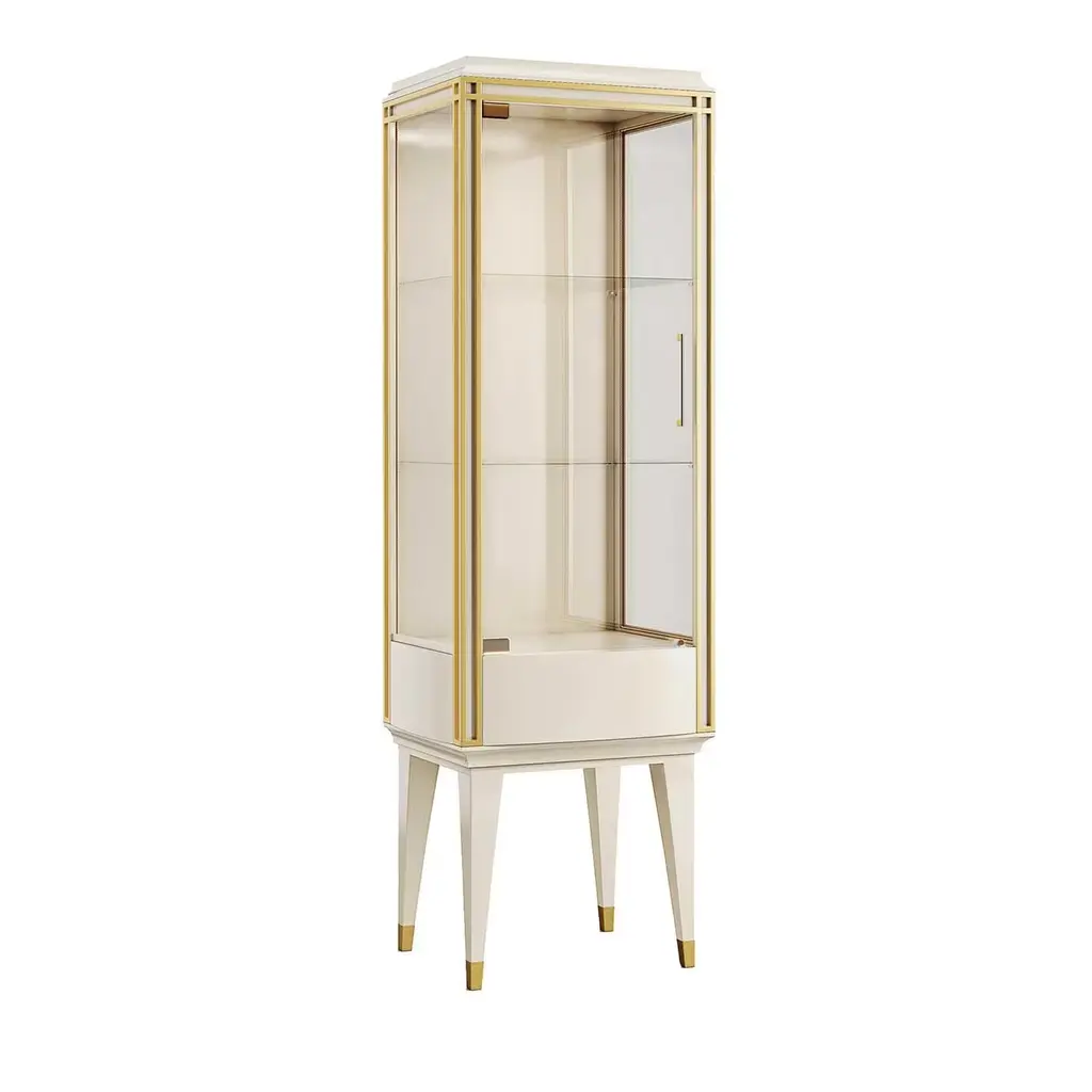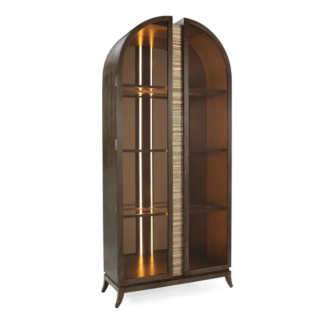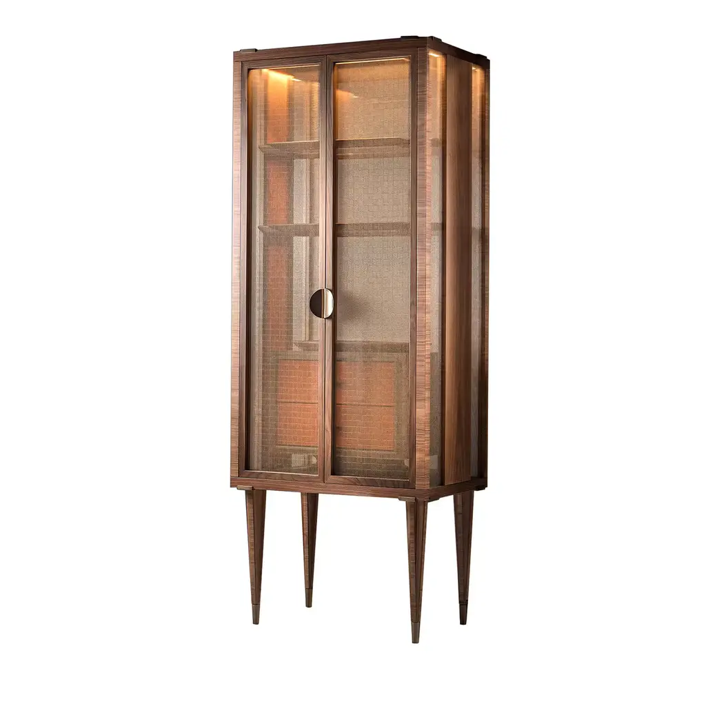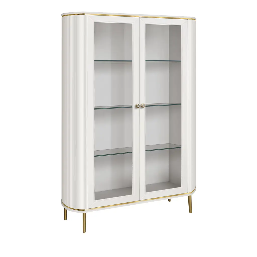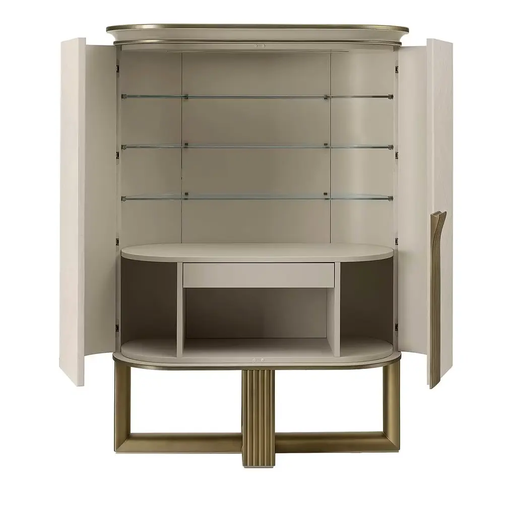 Extremely elegant and stylish in its harmonious blend of delicate tones and clean lines, this cabinet will infuse a modern dining room or living room with plush yet subtle sophistication. Crafted of wood enhanced with a charming ice finish, it features a natural eucalyptus-veneered drawer and two glass doors revealing glass shelves. Please consult the Concierge for further information.
