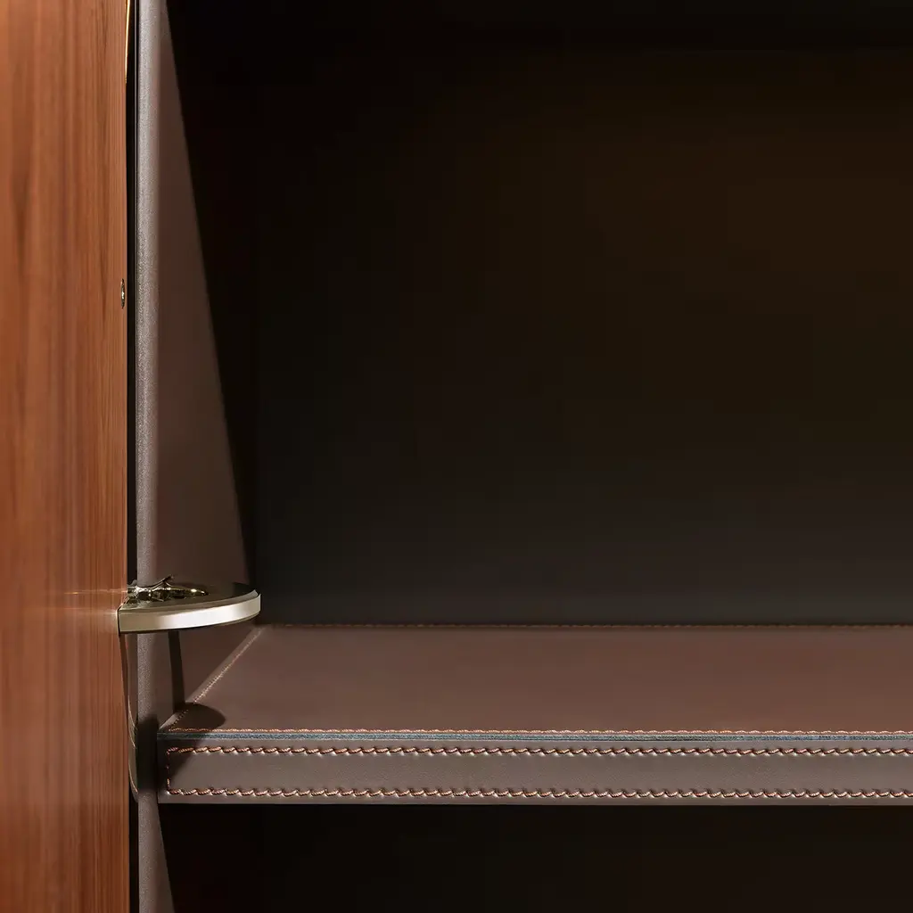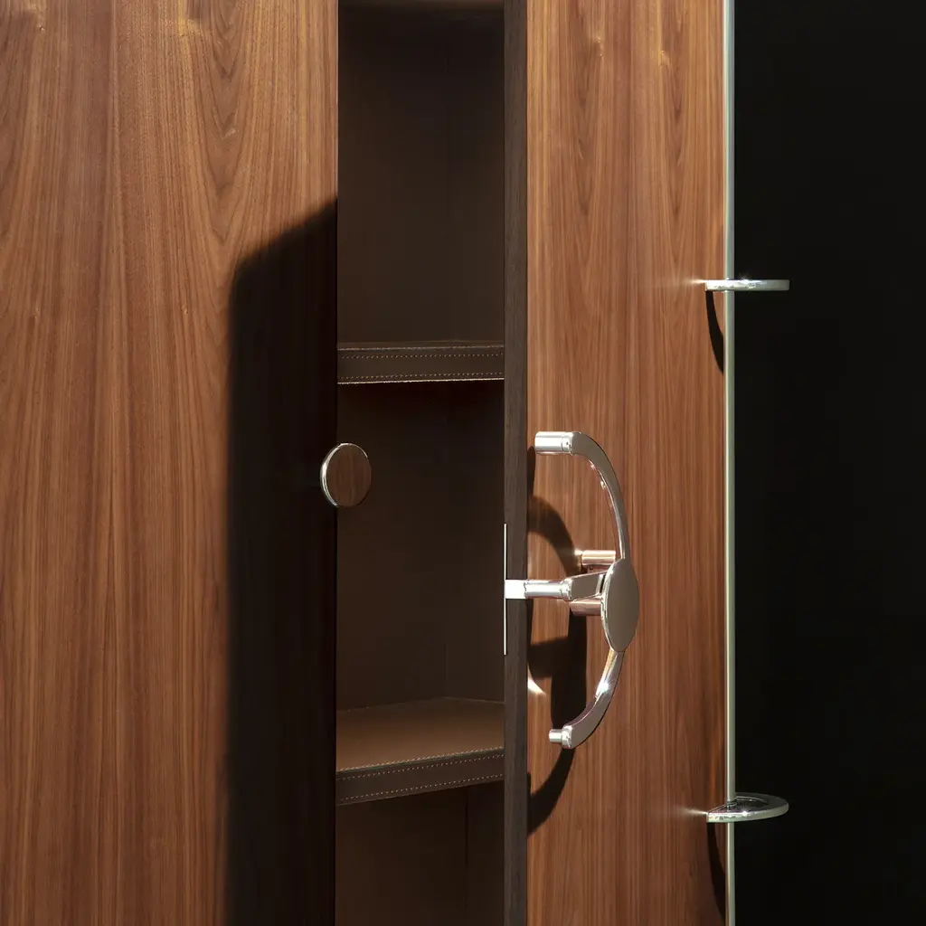 This sideboard is part of the Clockwork collection designed by Lanzavecchia and Wai. Its unique silhouette and enlarged details celebrate the functional elements that are kept hidden in traditional furniture. Hinges and locks are gigantic and enrich the minimalist structure of this piece in Canaletto walnut, creating modern jewels in glossy nickel that are both practical and strikingly decorative. Other finishes are available, please consult the Concierge for options.